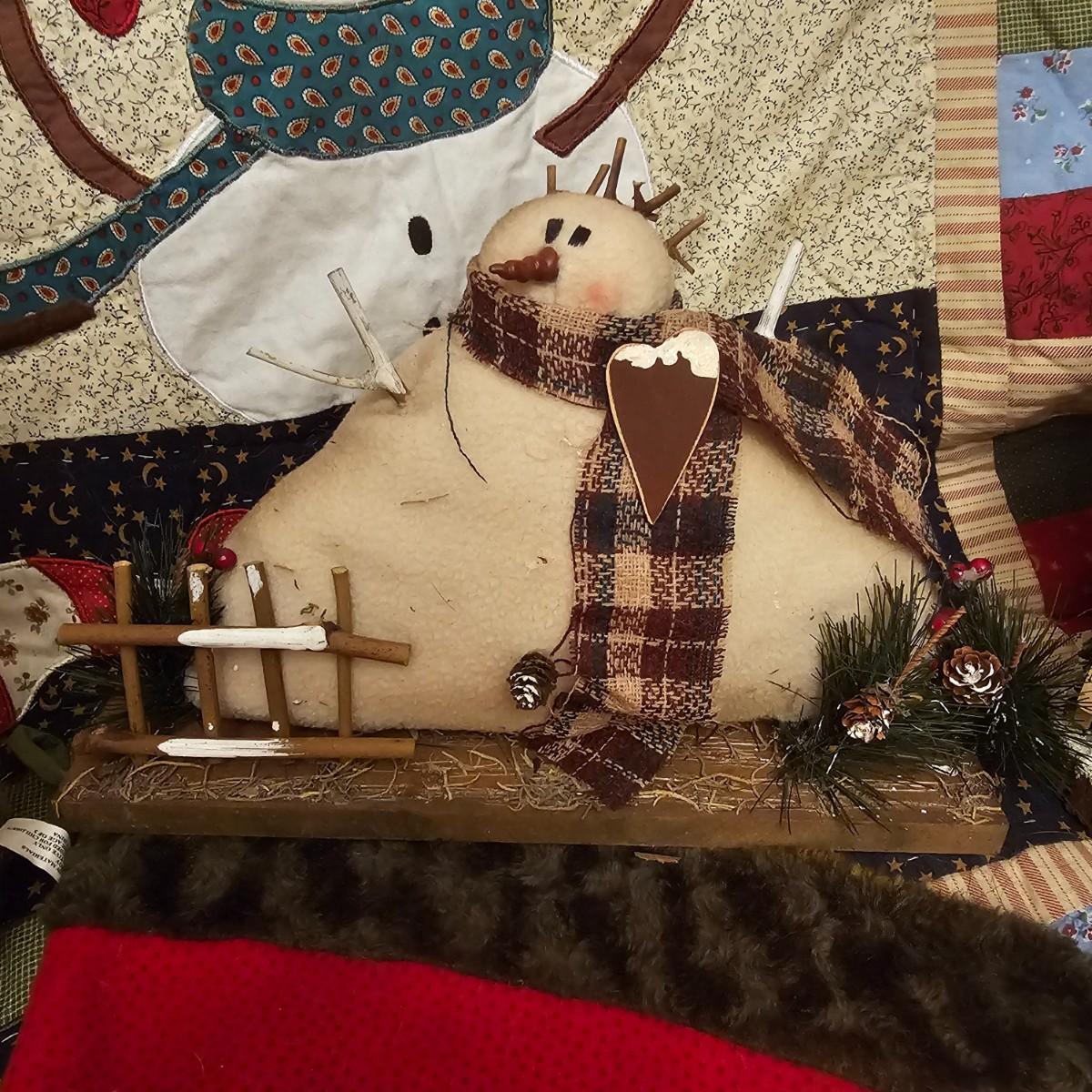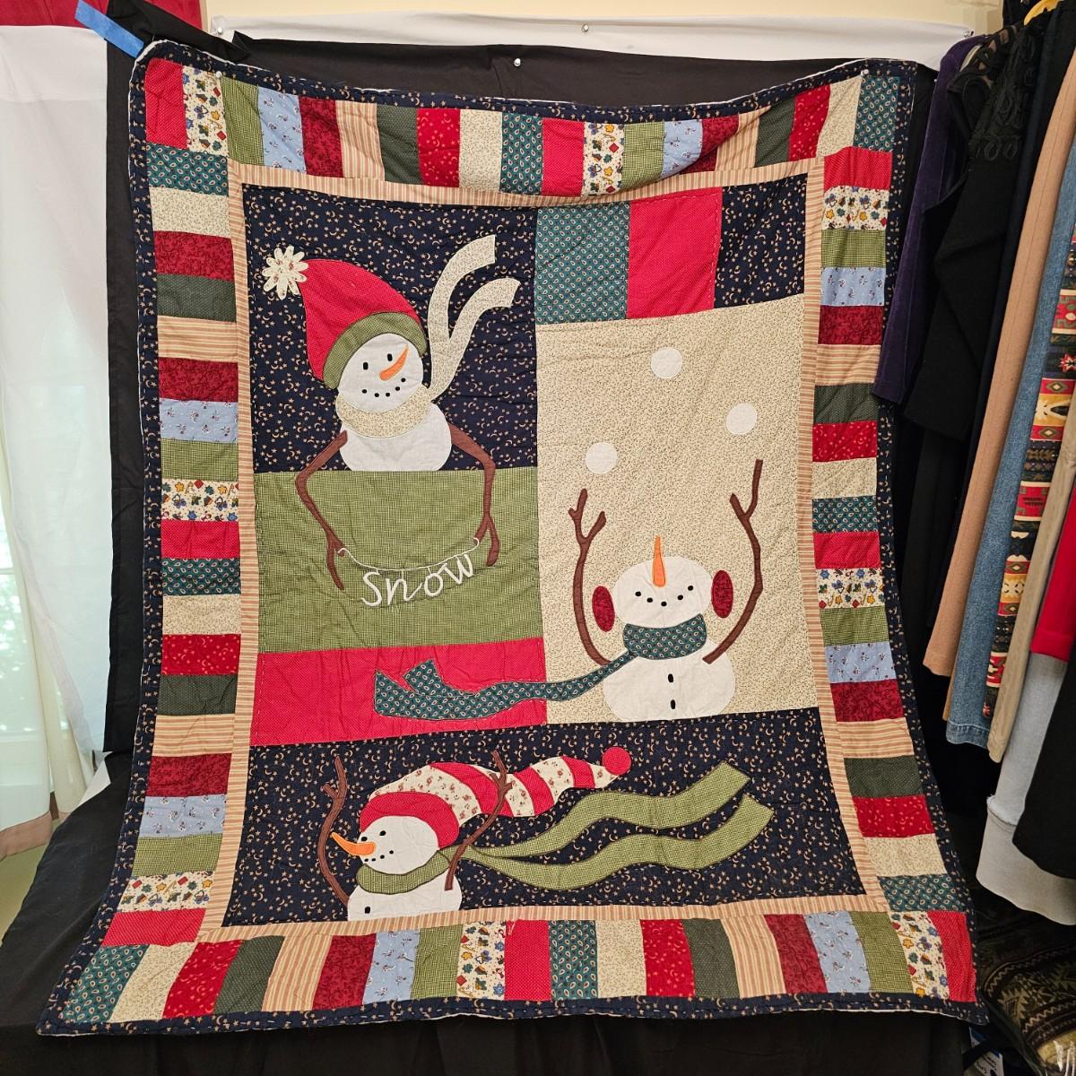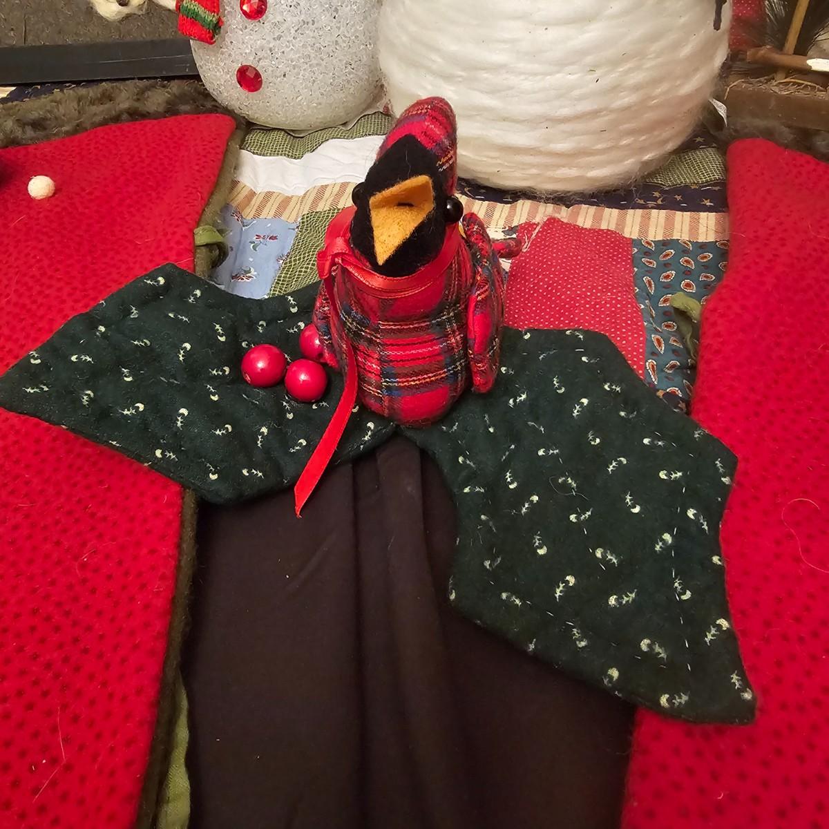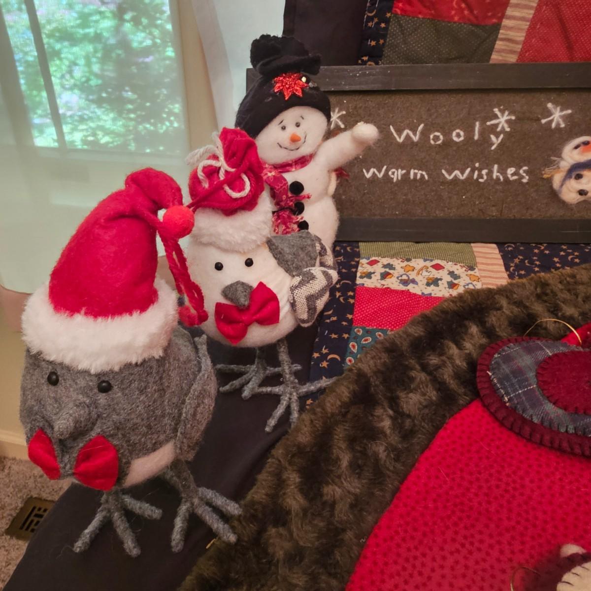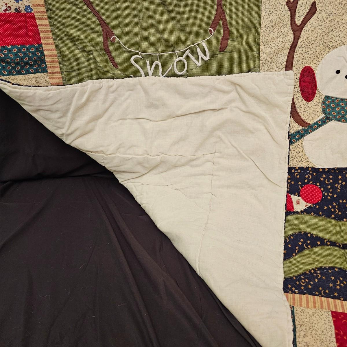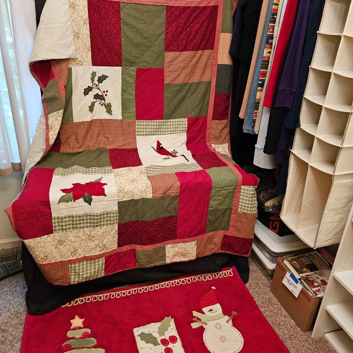 Cheerful, happy friendly snowmen and more abound in this collection.there are stationary figures, birds, a banner, tree skirt quilts. Most all items are soft plush or fabric. Tree skirt is 42"D, Noel hanger is 12" x 17" and has a pocket at top. Framed piece is 18" x 7"H. A few small spots on the tree skirt and also some pet hair throughout. Redbird quilt is 62" x 80", snowman rug is 52" x 29", Santa quilt is 40" x 56" and table runner is 12" x 70". See photos for details. Shipping available.