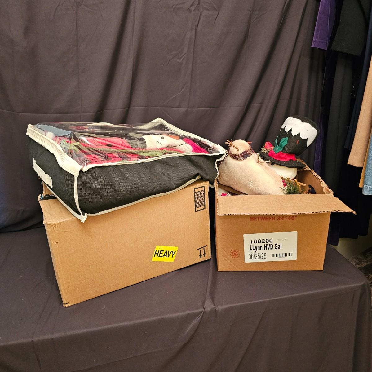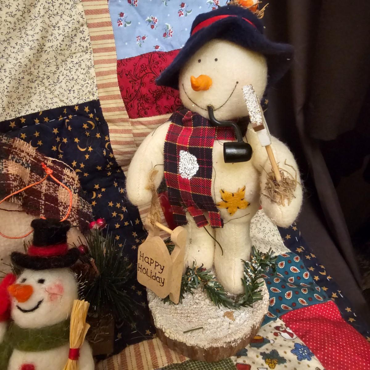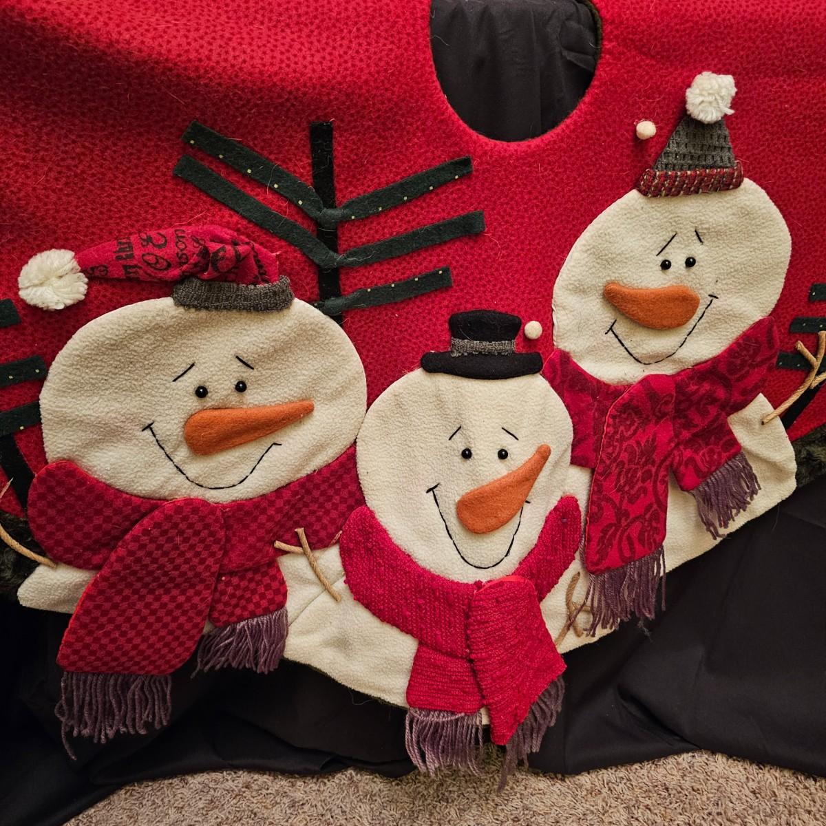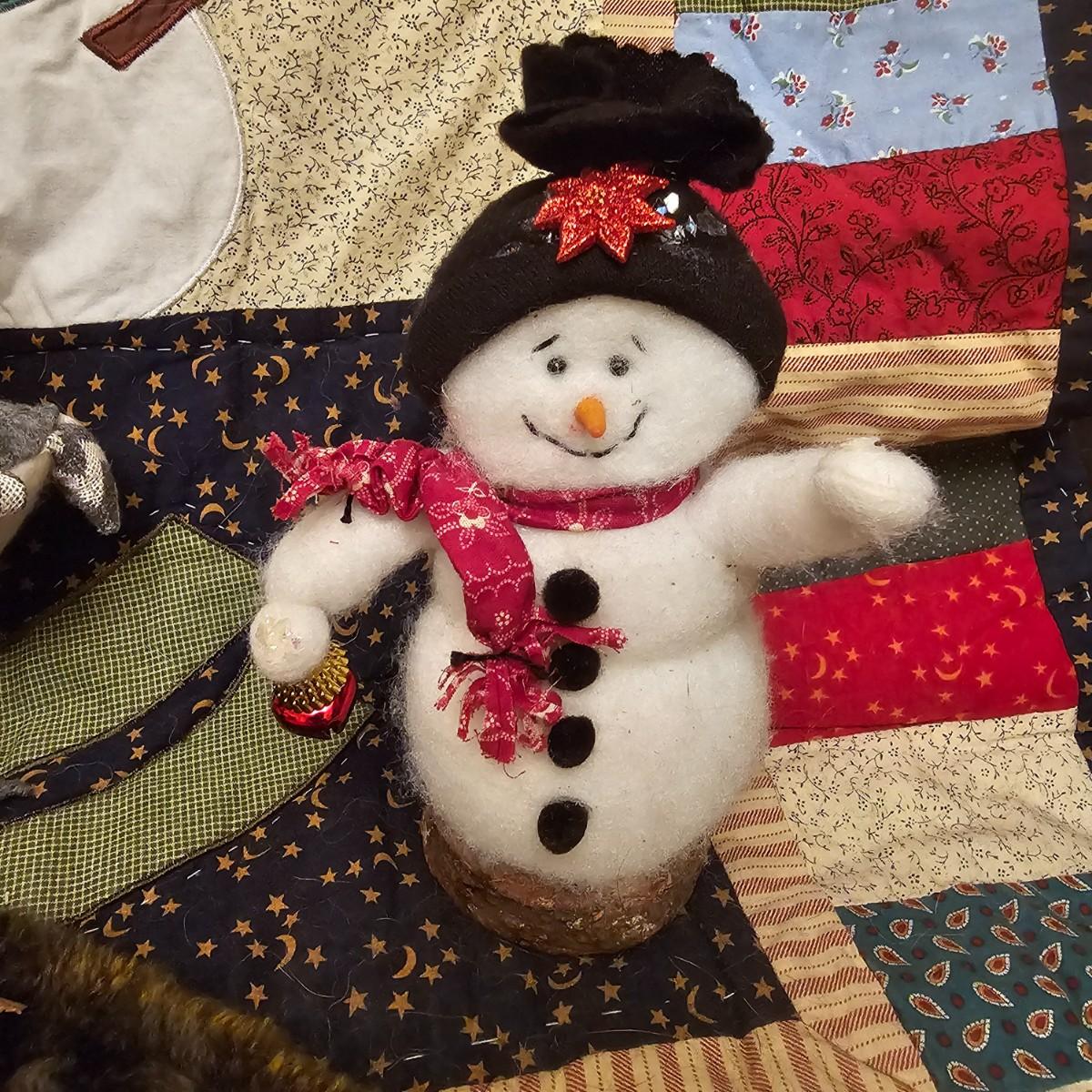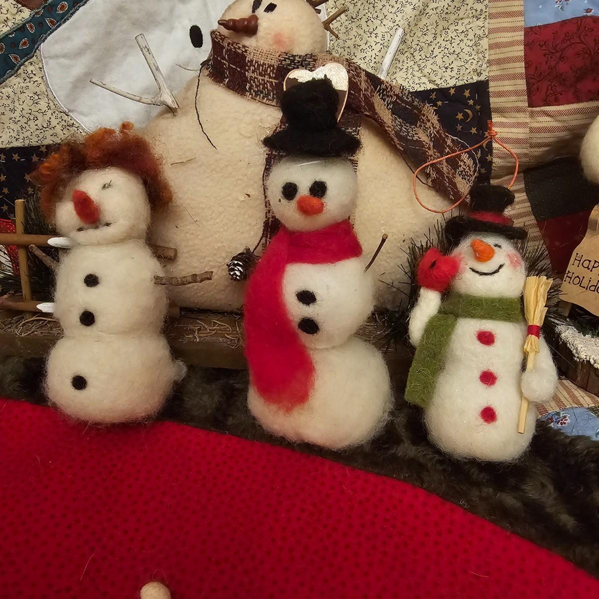 Cheerful, happy friendly snowmen and more abound in this collection.there are stationary figures, birds, a banner, tree skirt quilts. Most all items are soft plush or fabric. Tree skirt is 42"D, Noel hanger is 12" x 17" and has a pocket at top. Framed piece is 18" x 7"H. A few small spots on the tree skirt and also some pet hair throughout. Redbird quilt is 62" x 80", snowman rug is 52" x 29", Santa quilt is 40" x 56" and table runner is 12" x 70". See photos for details. Shipping available.