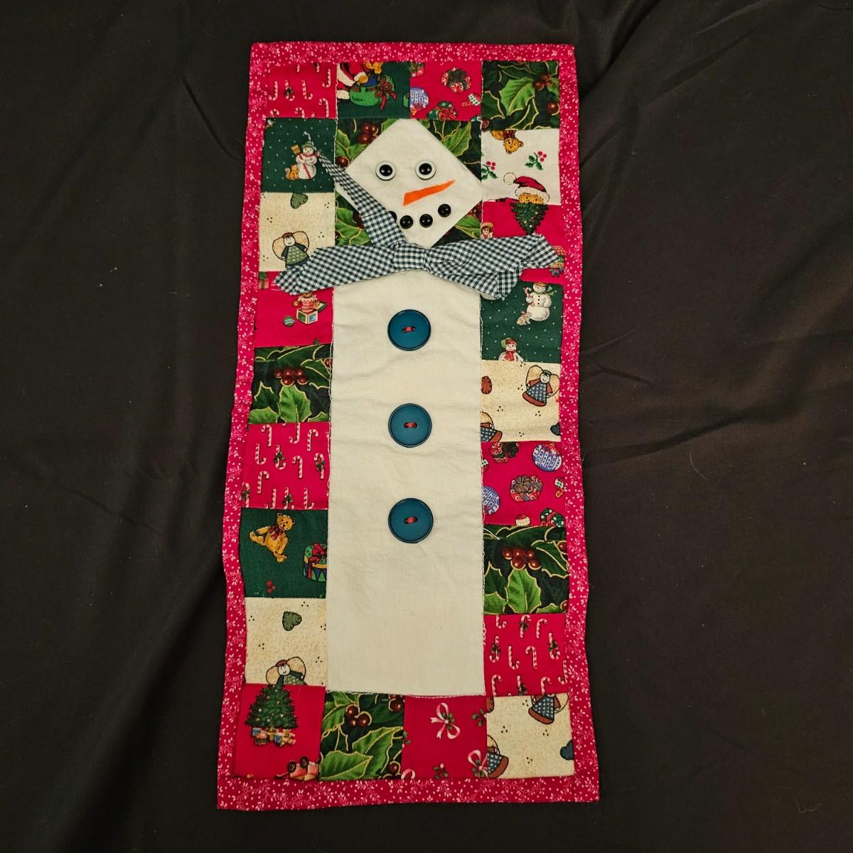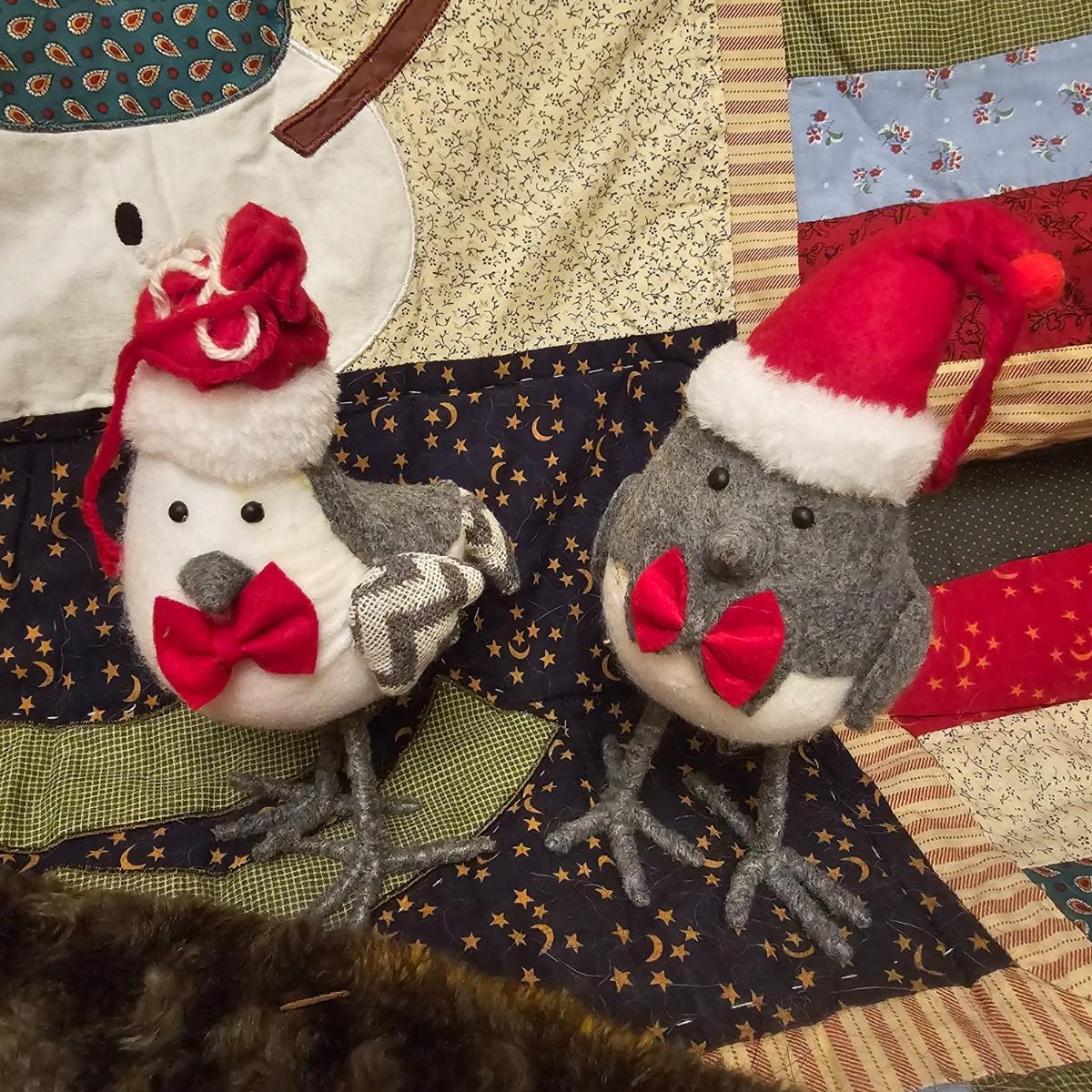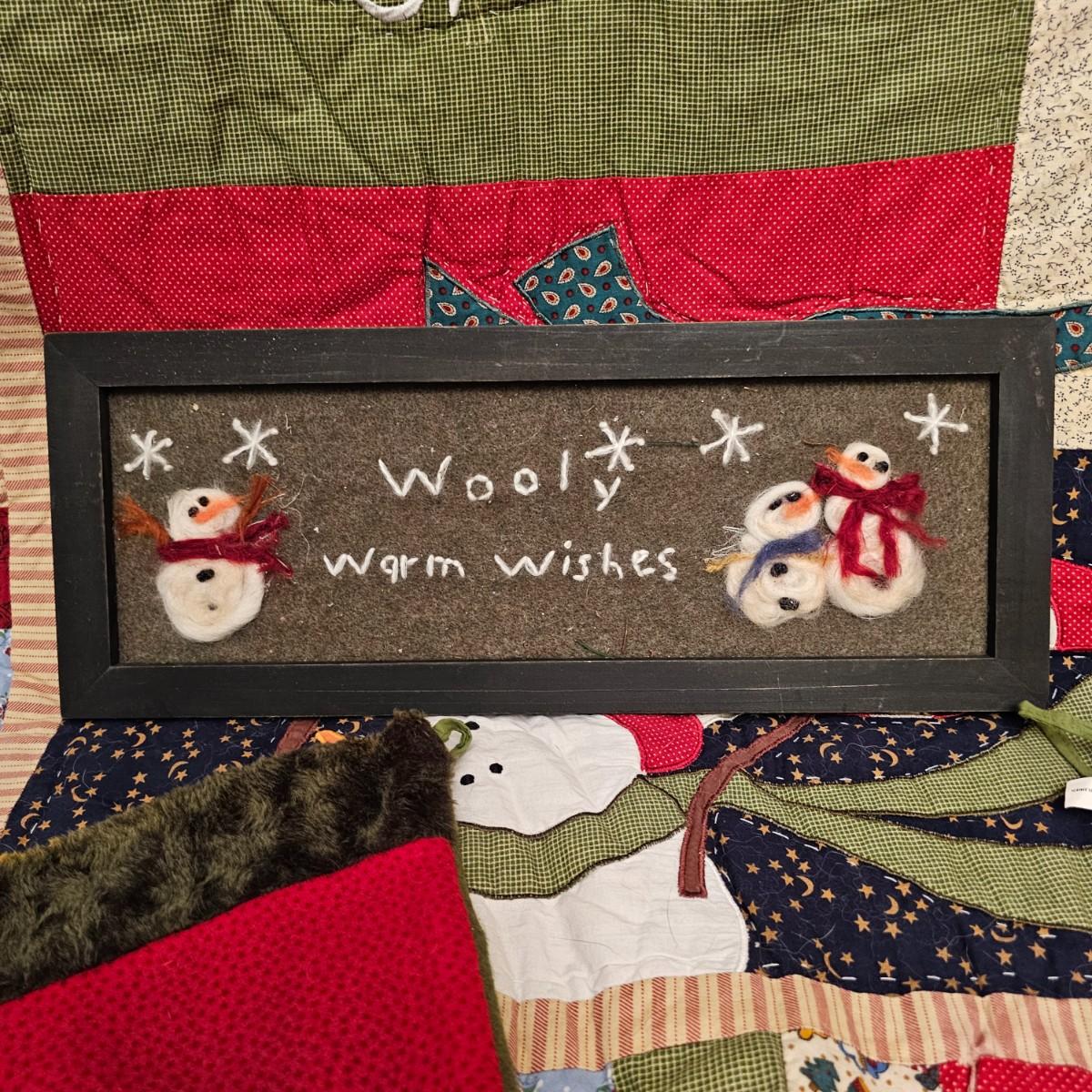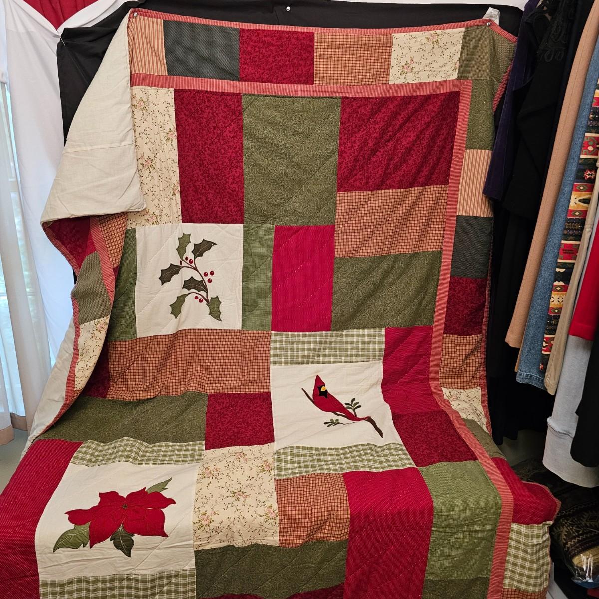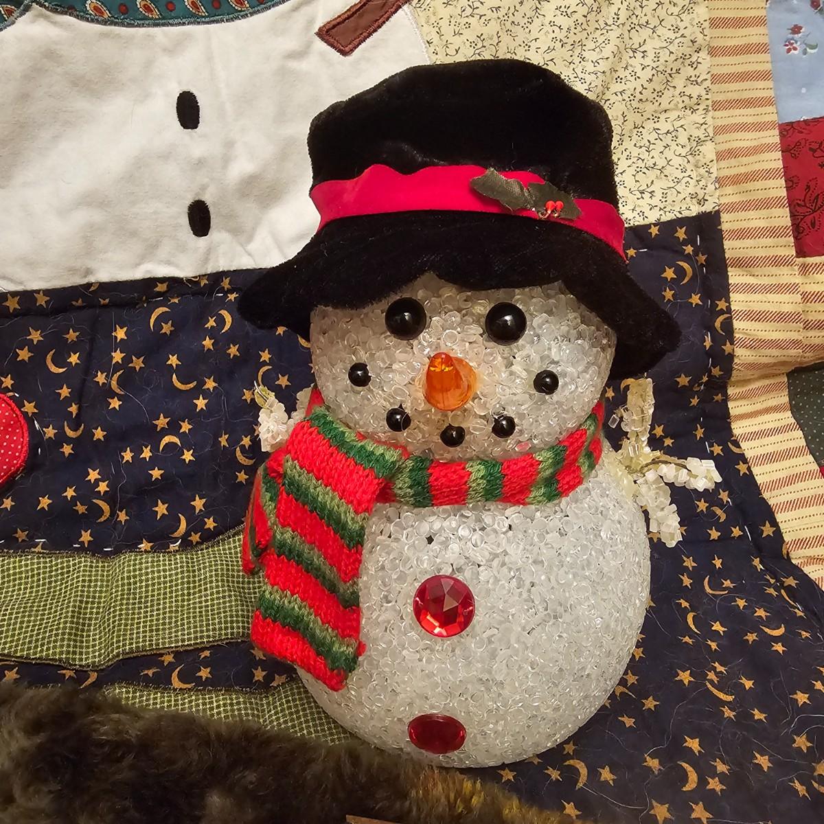 Cheerful, happy friendly snowmen and more abound in this collection.there are stationary figures, birds, a banner, tree skirt quilts. Most all items are soft plush or fabric. Tree skirt is 42"D, Noel hanger is 12" x 17" and has a pocket at top. Framed piece is 18" x 7"H. A few small spots on the tree skirt and also some pet hair throughout. Redbird quilt is 62" x 80", snowman rug is 52" x 29", Santa quilt is 40" x 56" and table runner is 12" x 70". See photos for details. Shipping available.