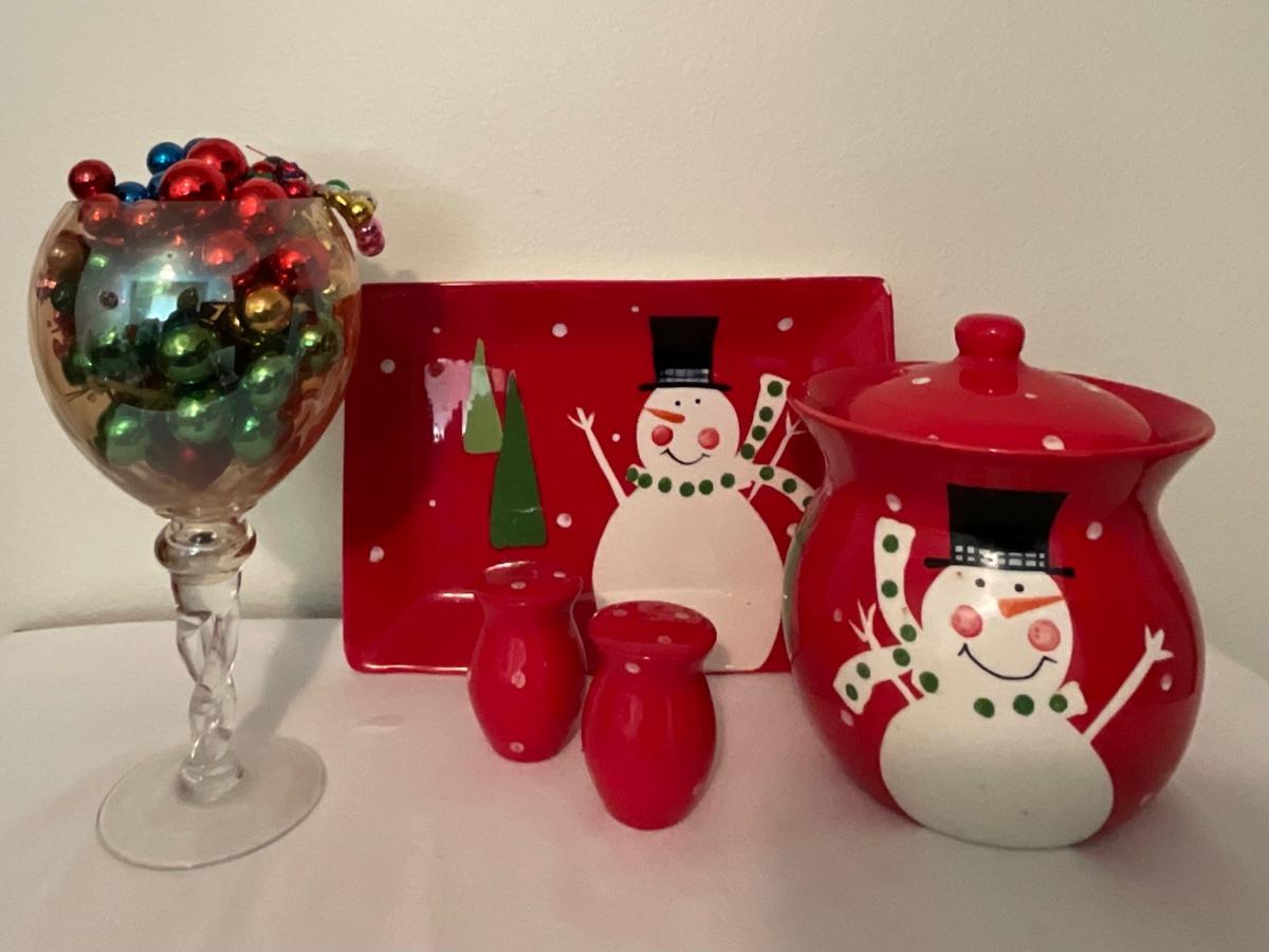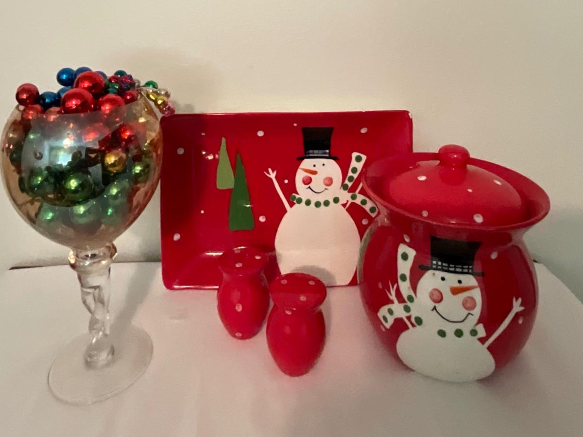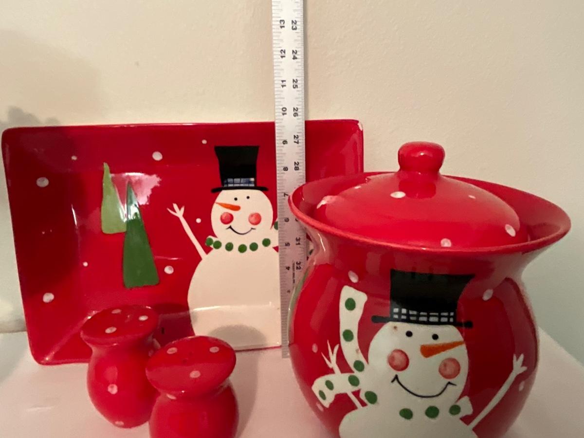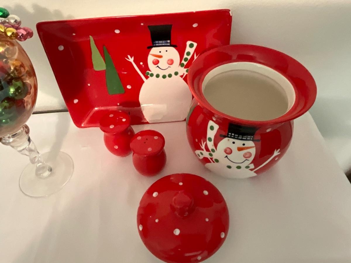 Snowman platter, Cookie jar, s/p shakers, glass container
