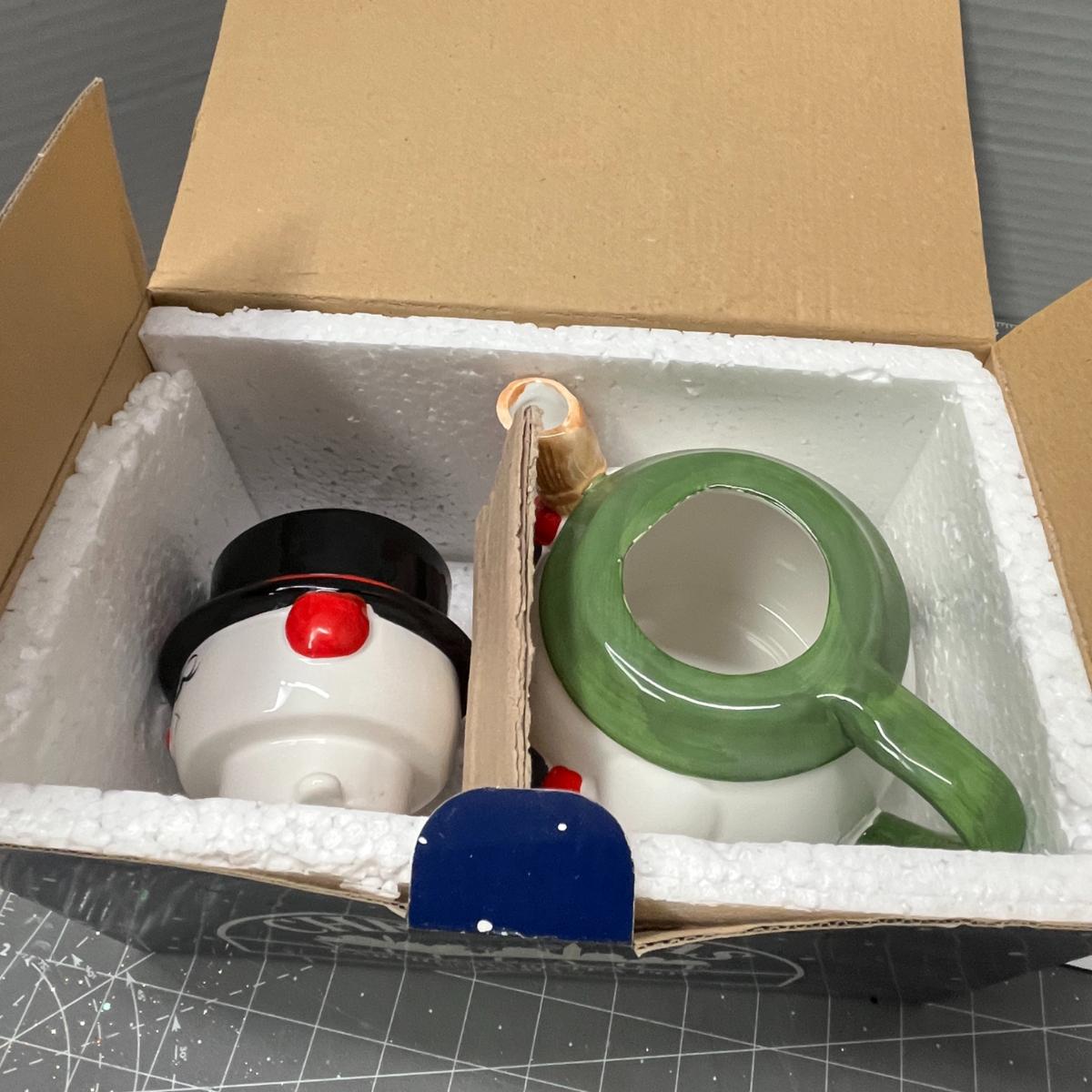 Top hat, scarf, mittens, pipe—boxed Christmas Village design.