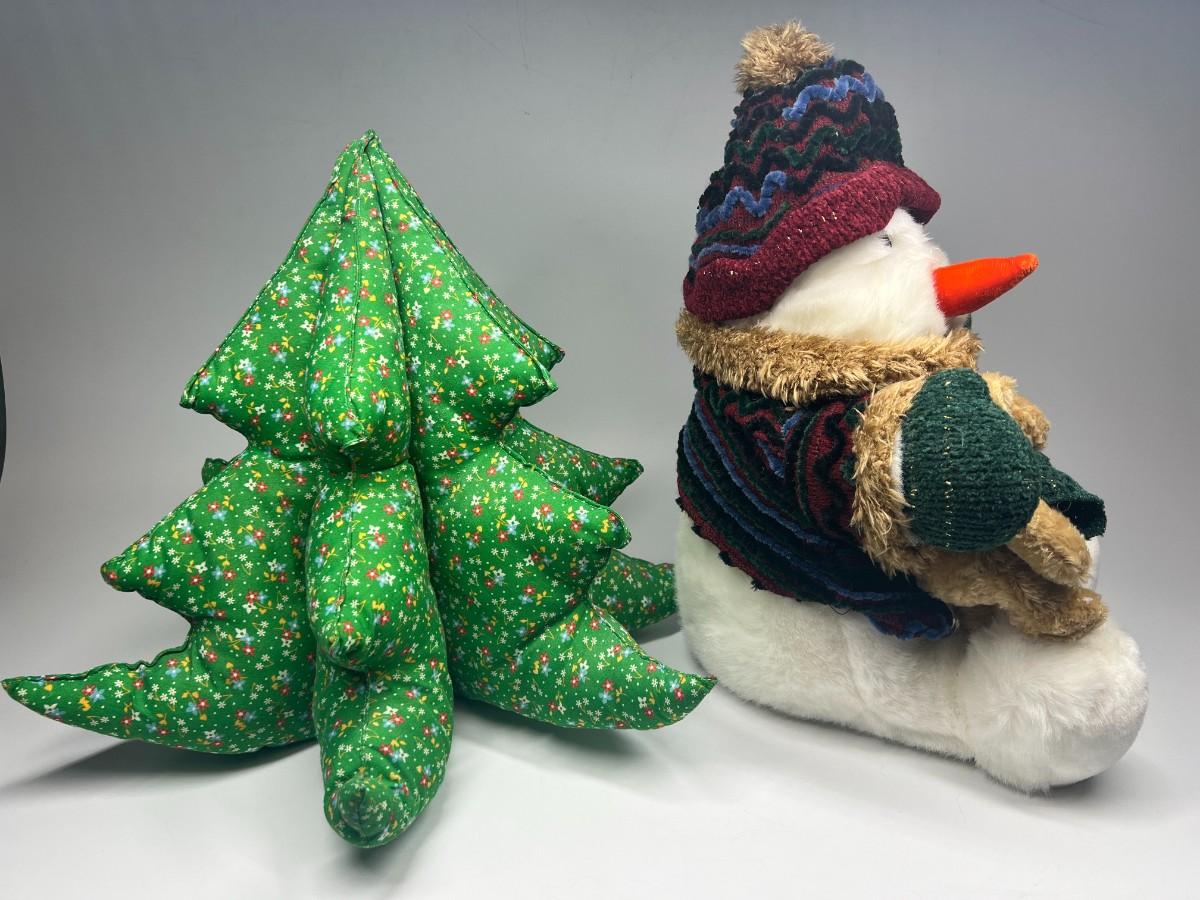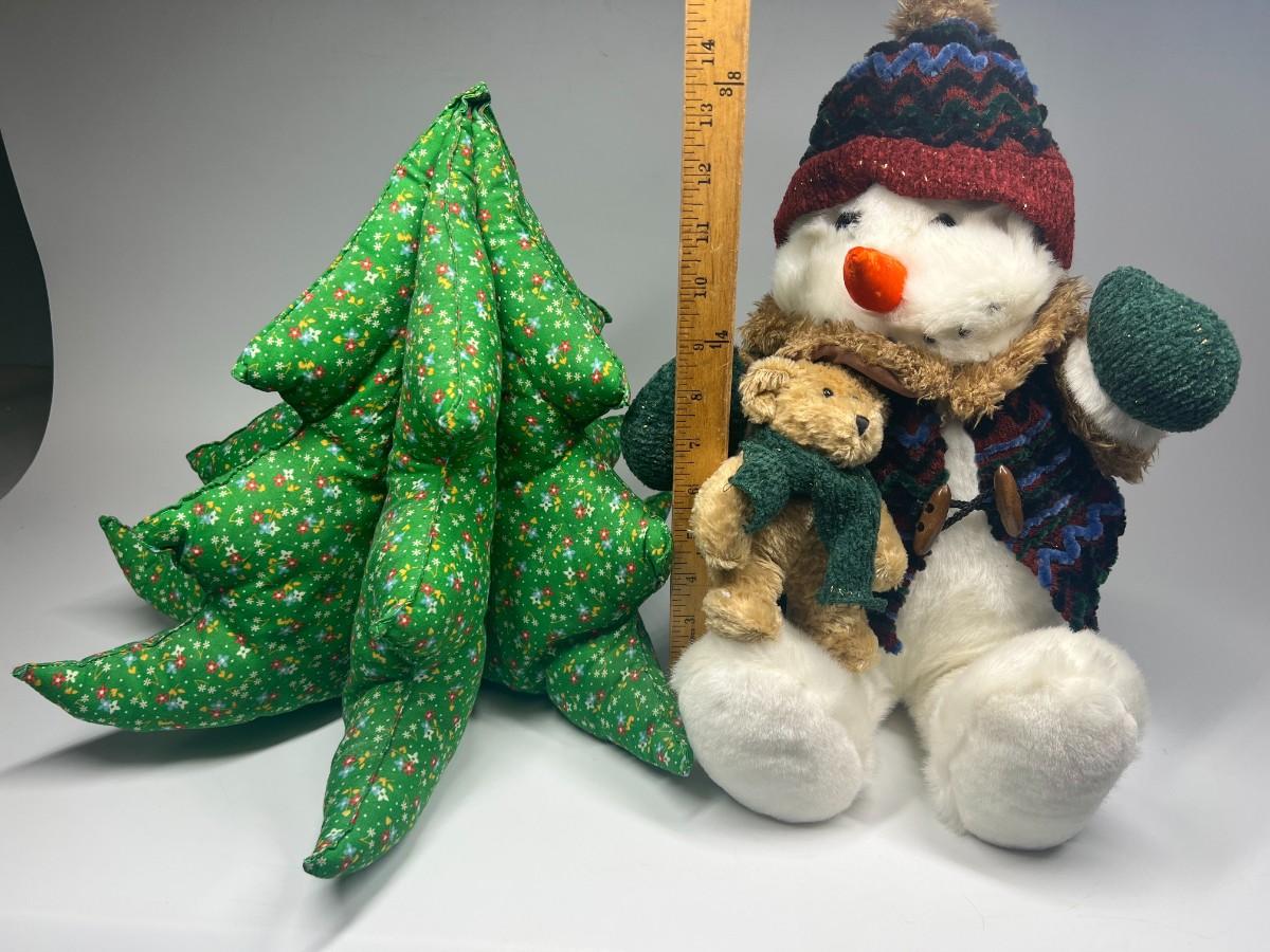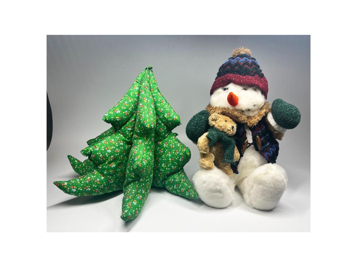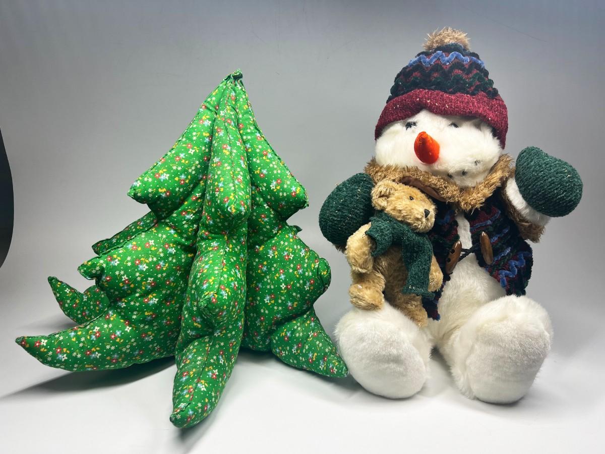 Snowman with Teddy Bear Plush & Vintage Green Fabric Stuffed Christmas Tree. Snowman plush is made by DanDee. Both in good displayed condition.