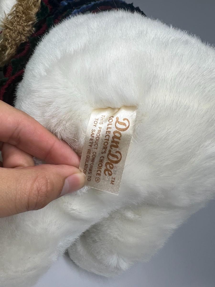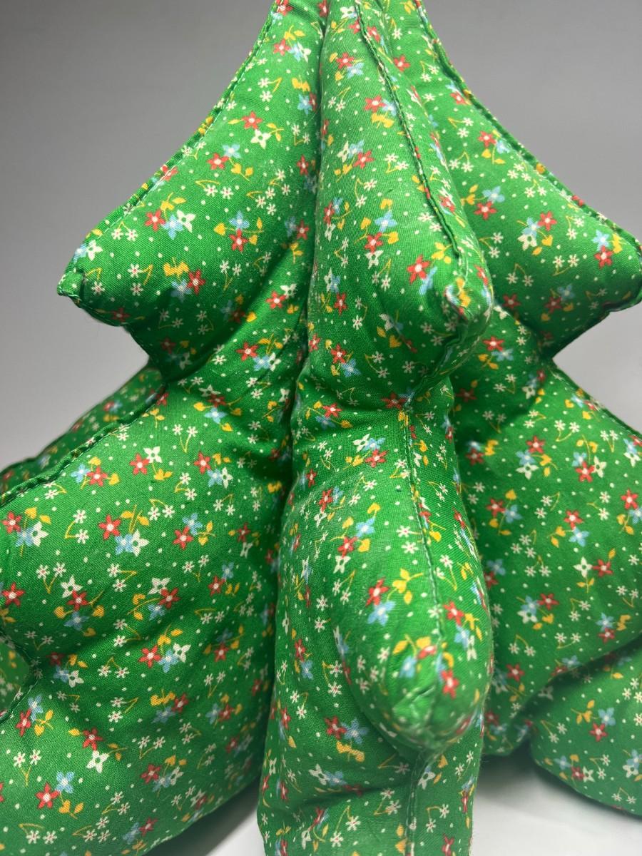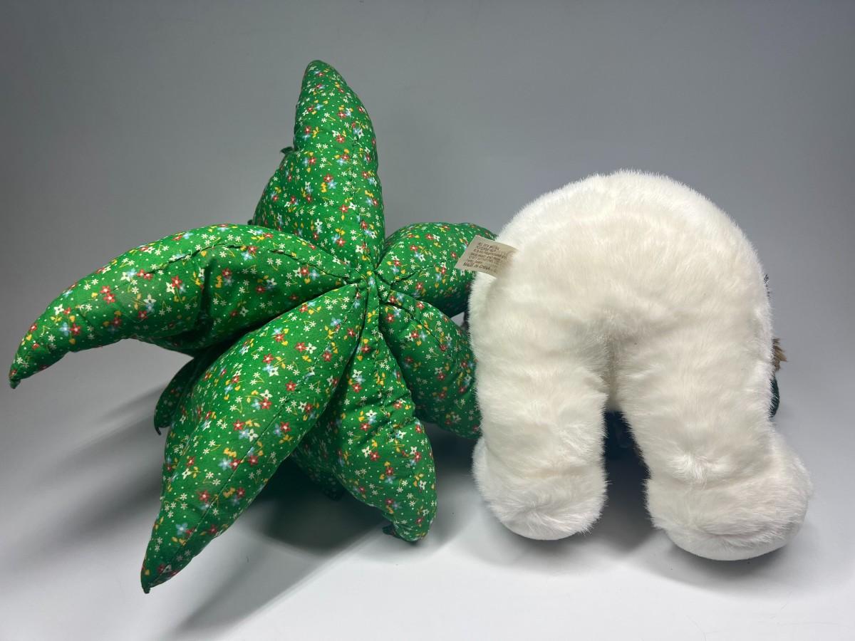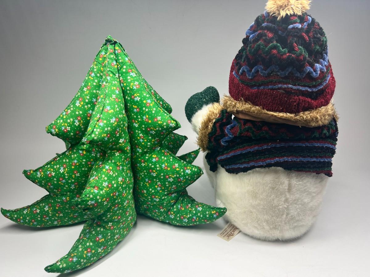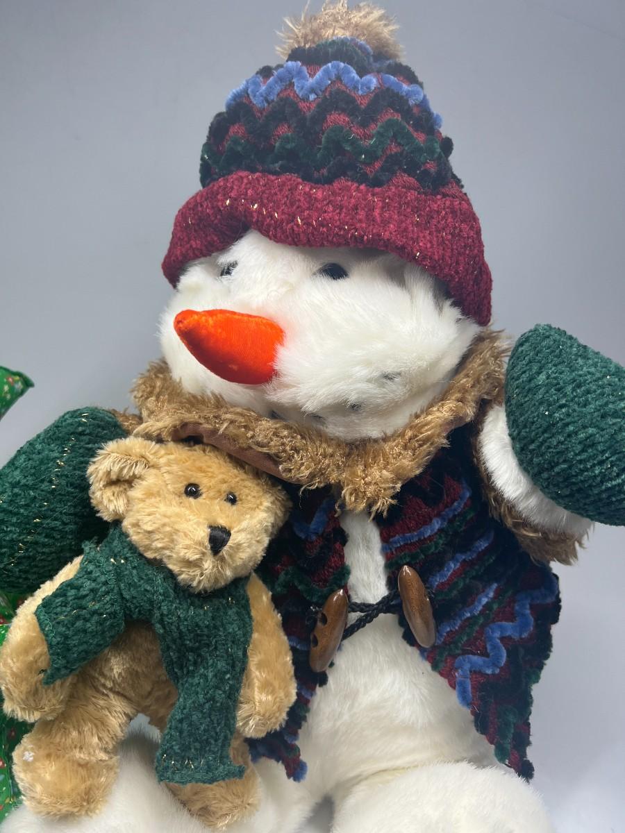 Snowman with Teddy Bear Plush & Vintage Green Fabric Stuffed Christmas Tree. Snowman plush is made by DanDee. Both in good displayed condition.