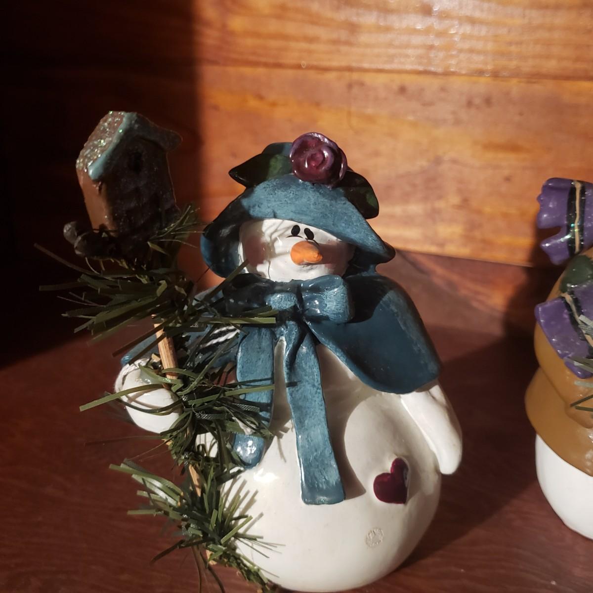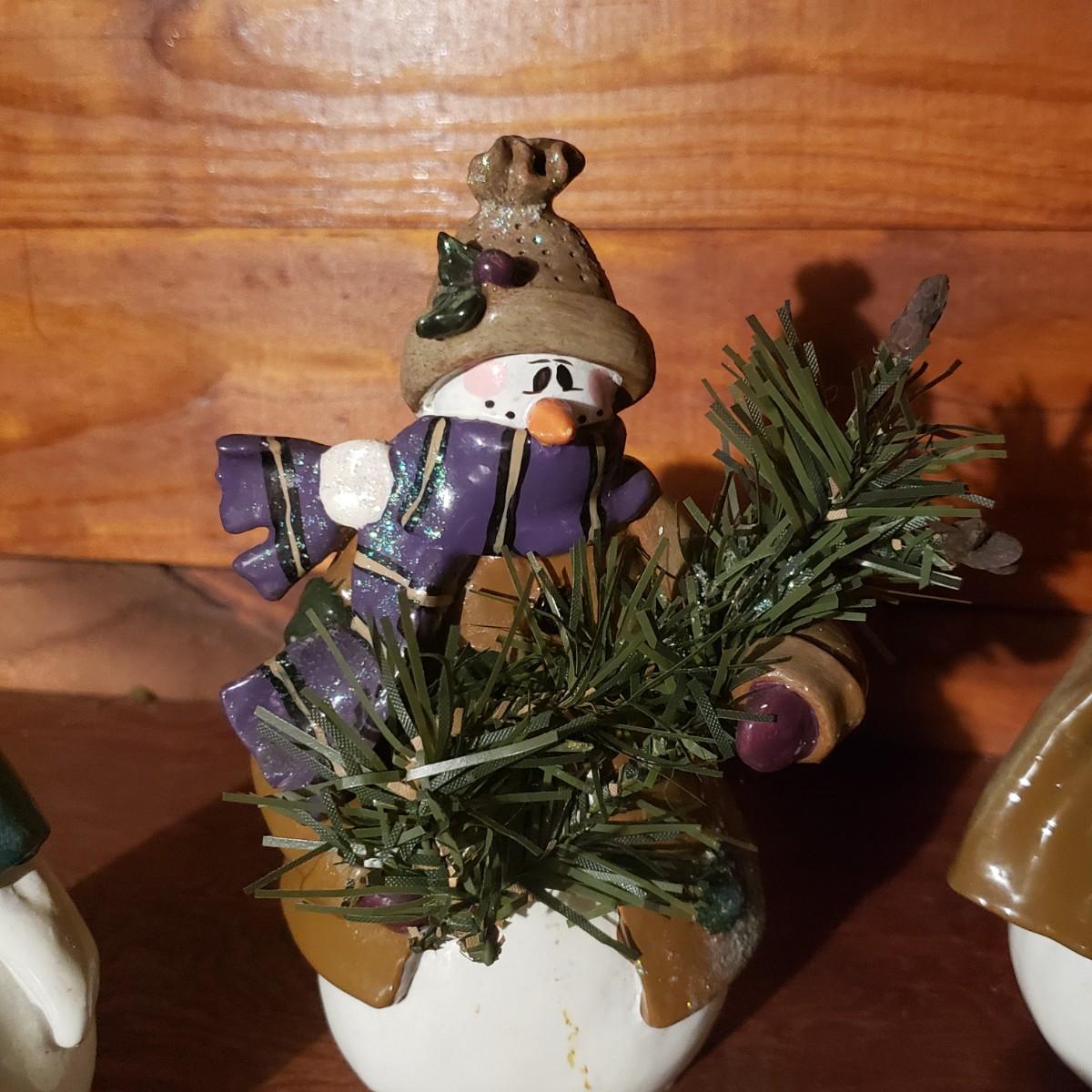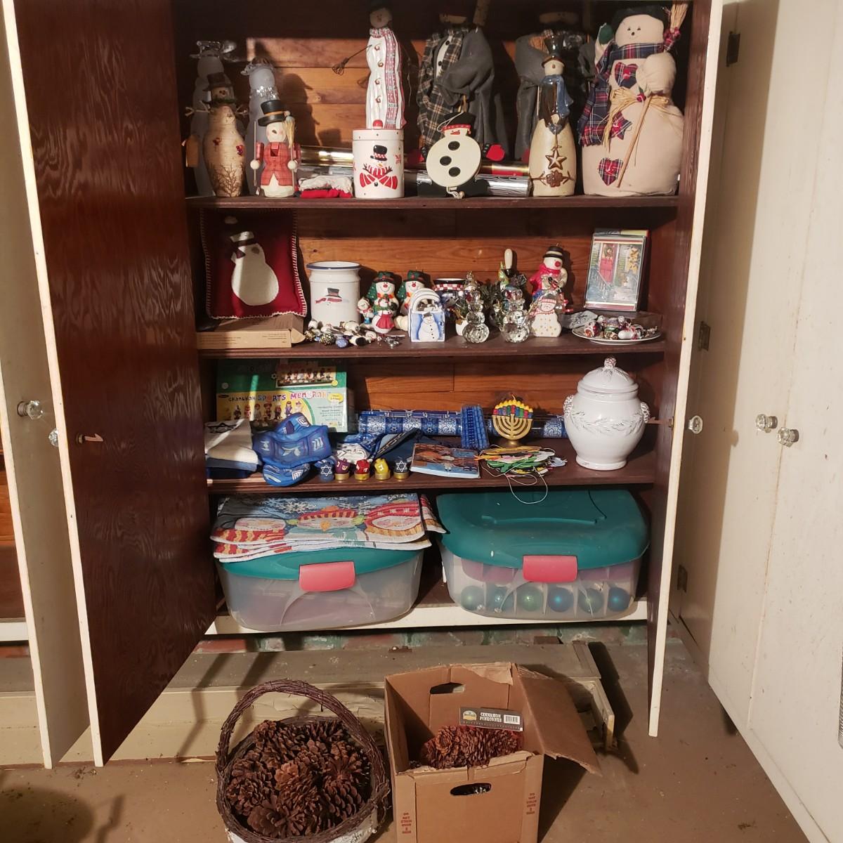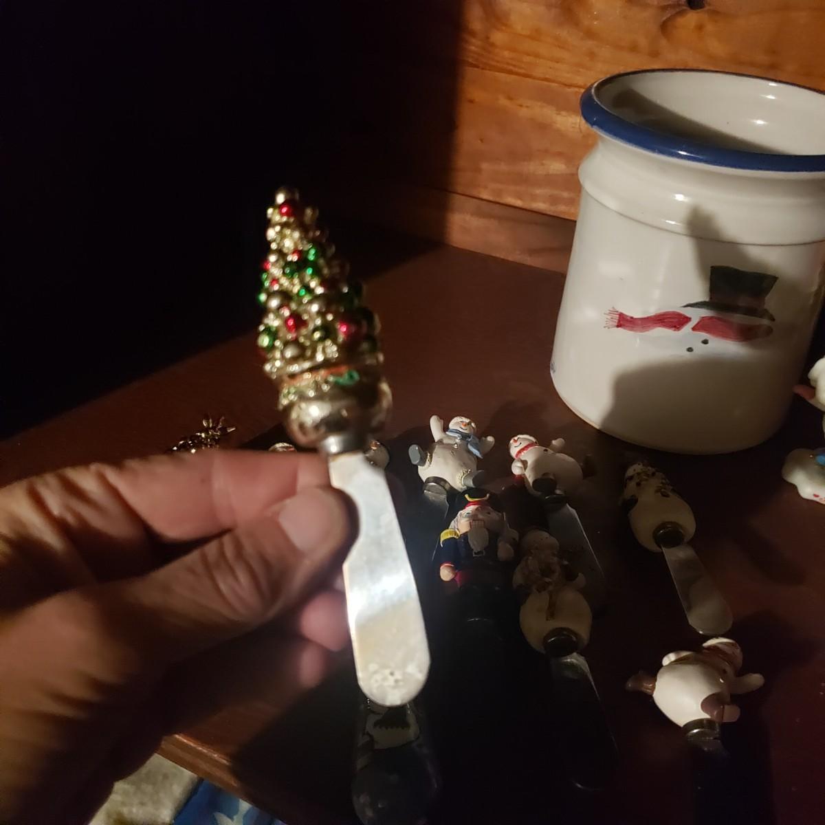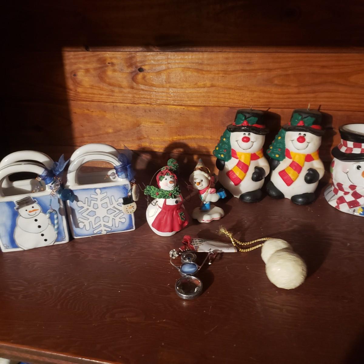 This large lot of decor will brighten your holidays! There is so much, so here are some highlights, a Pampered Chef glass snowman plate, multiple decorative cheese/dip knives, a pottery snowman, silver metal pinecones, Hanukkah sports minora, towels and gift paper. The Hanukkah book must have gotten wet, but still works! The majority of the bulbs in the storage bin are plastic with a few glass ones. The set of four snowpeople by Donna Little are adorable! They measure approximately 2" x 4"H.