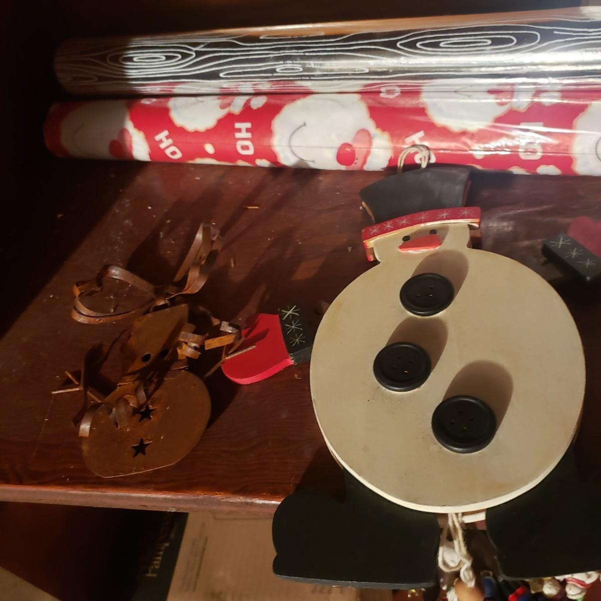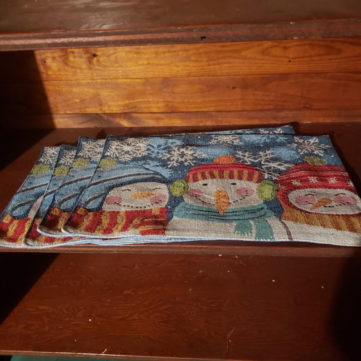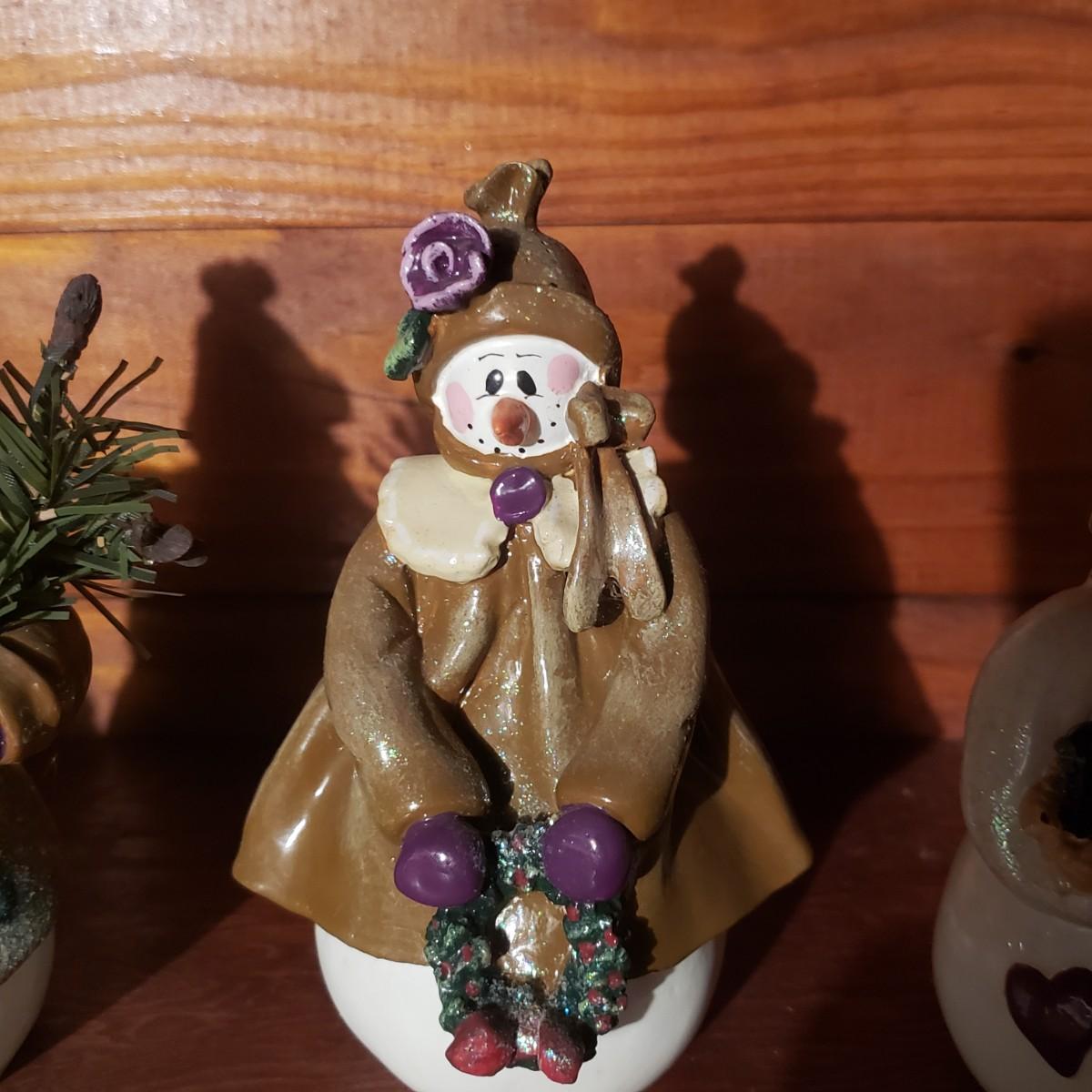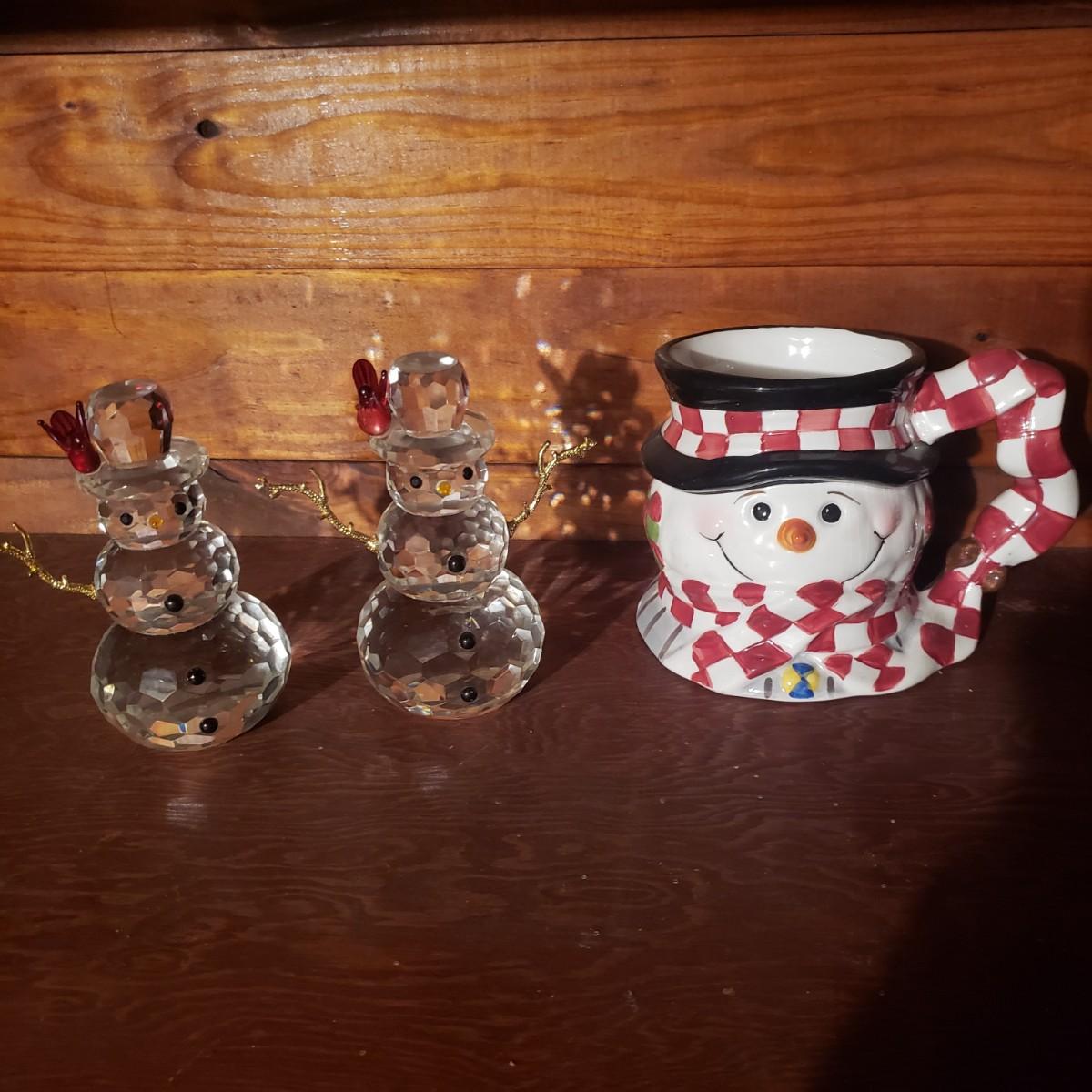 This large lot of decor will brighten your holidays! There is so much, so here are some highlights, a Pampered Chef glass snowman plate, multiple decorative cheese/dip knives, a pottery snowman, silver metal pinecones, Hanukkah sports minora, towels and gift paper. The Hanukkah book must have gotten wet, but still works! The majority of the bulbs in the storage bin are plastic with a few glass ones. The set of four snowpeople by Donna Little are adorable! They measure approximately 2" x 4"H.
