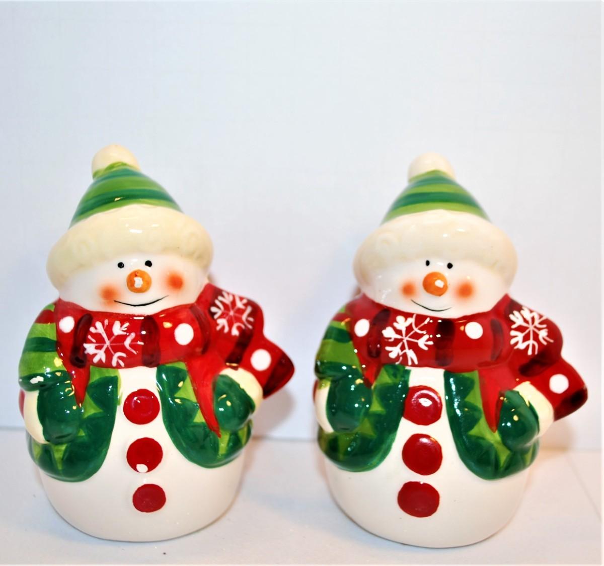 Snowmen with Green Coats + Hats, Red Scarf and Orange Nose 3 1/2"