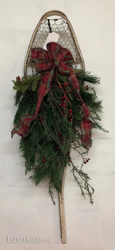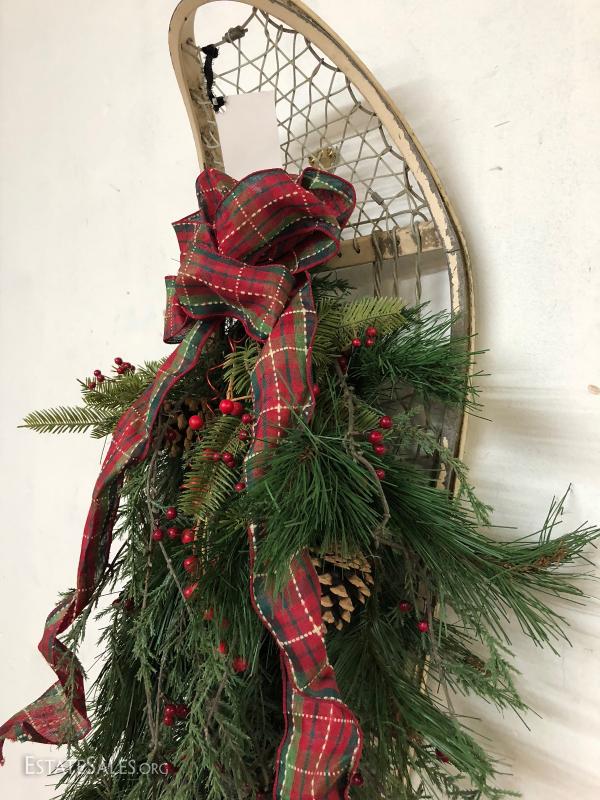 Nice holiday wreath on a vintage snowshoe.