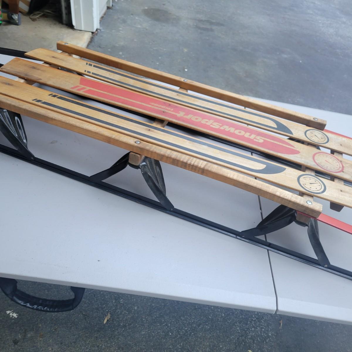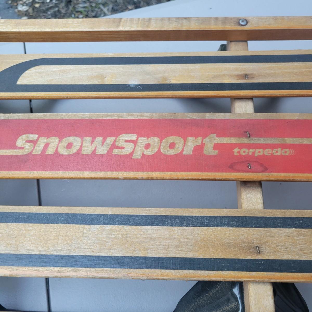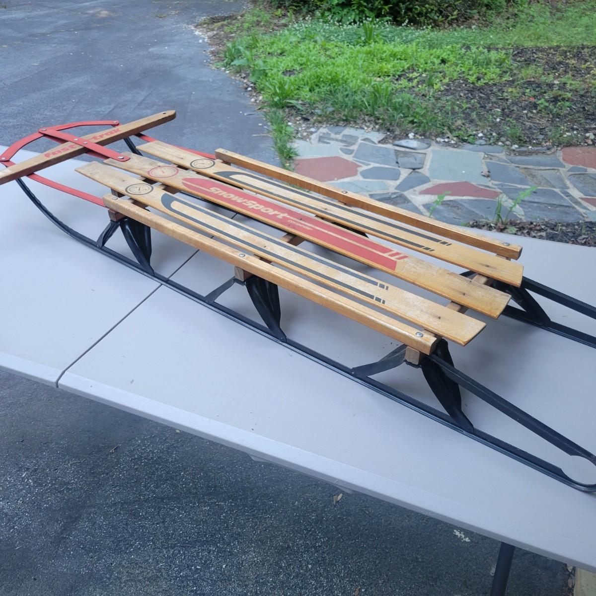 Old school SnowSport metal and wood sled. Metal frame with wooden slat platform and wooden steering back. In good condition with minimal wear. Measures approximately 48" x 22" x 6" Local pickup only