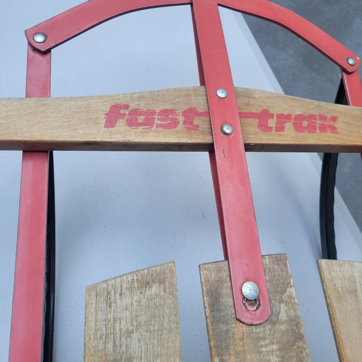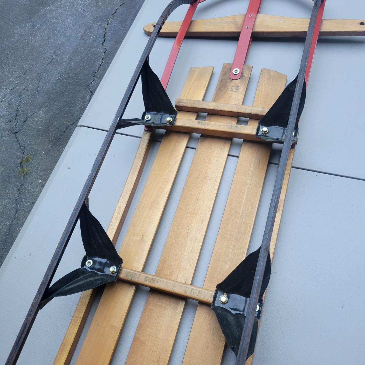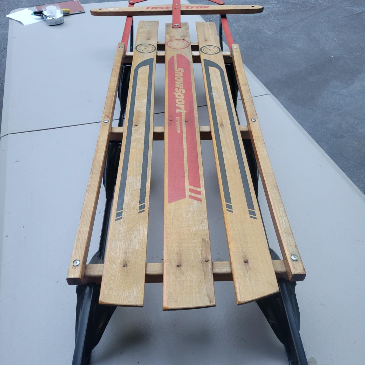 Old school SnowSport metal and wood sled. Metal frame with wooden slat platform and wooden steering back. In good condition with minimal wear. Measures approximately 48" x 22" x 6" Local pickup only