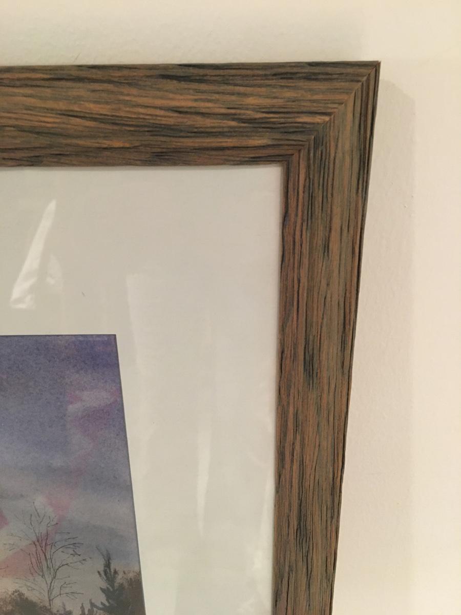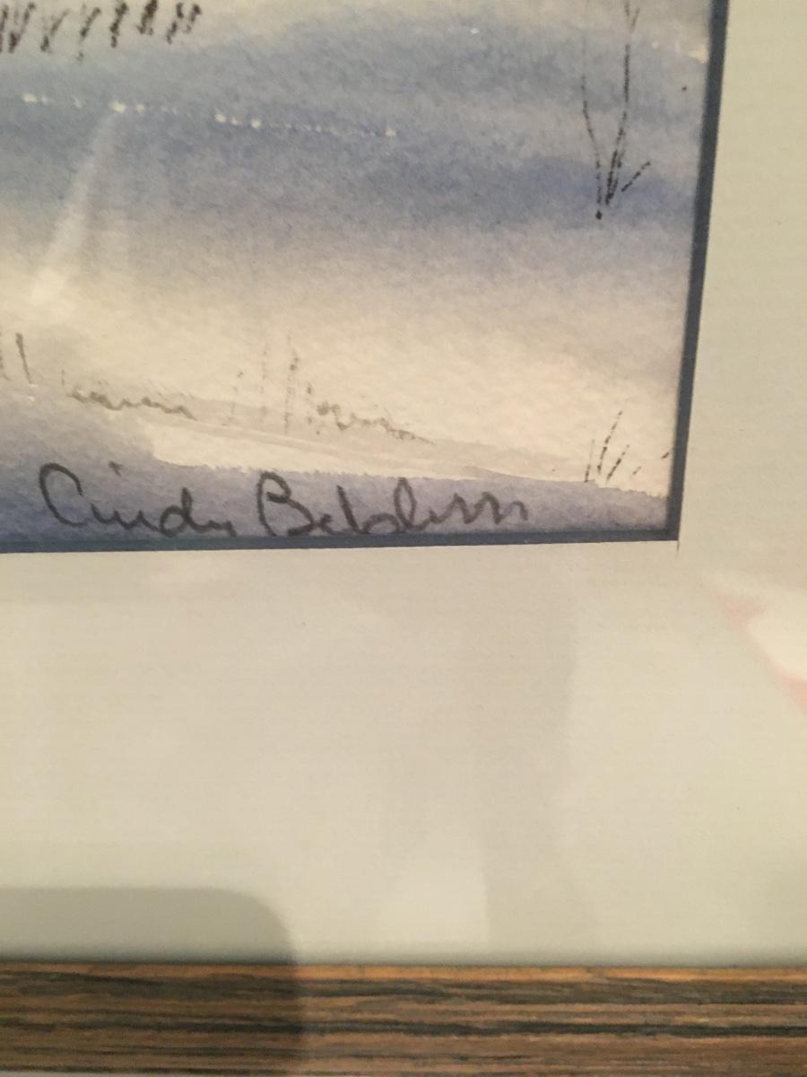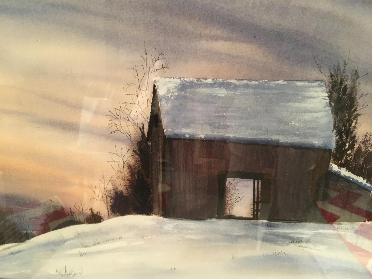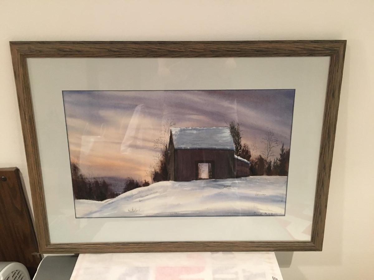 Framed and matted watercolor of snowy barn on a wintry dusk. Signed by the artist.