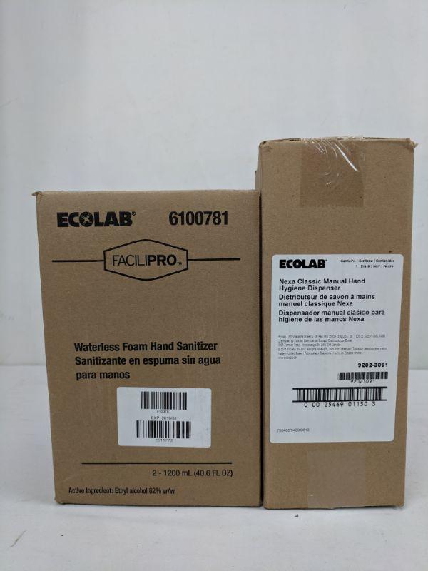 Soap Dispenser & 2x Soap - Ecolab Facilipro Waterless Foam Hand Sanitizer & Nexa Classic Manual Hand Hygiene Dispenser- New