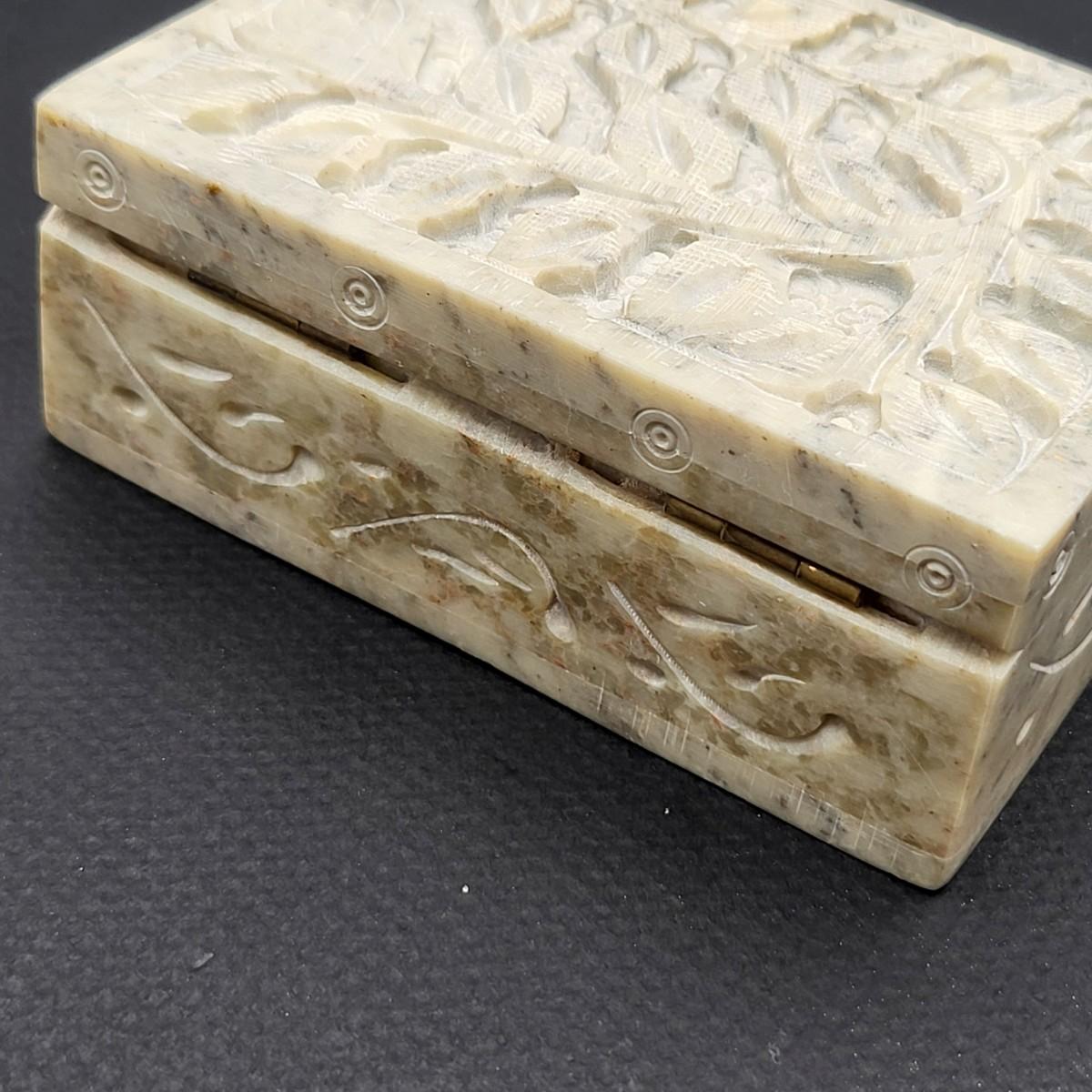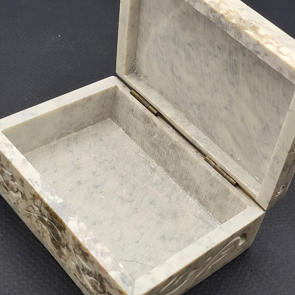 Light earth tones, leaf & branch carved soapstone hinged trinket box 4" wide x 3" deep x 1.5" tall.