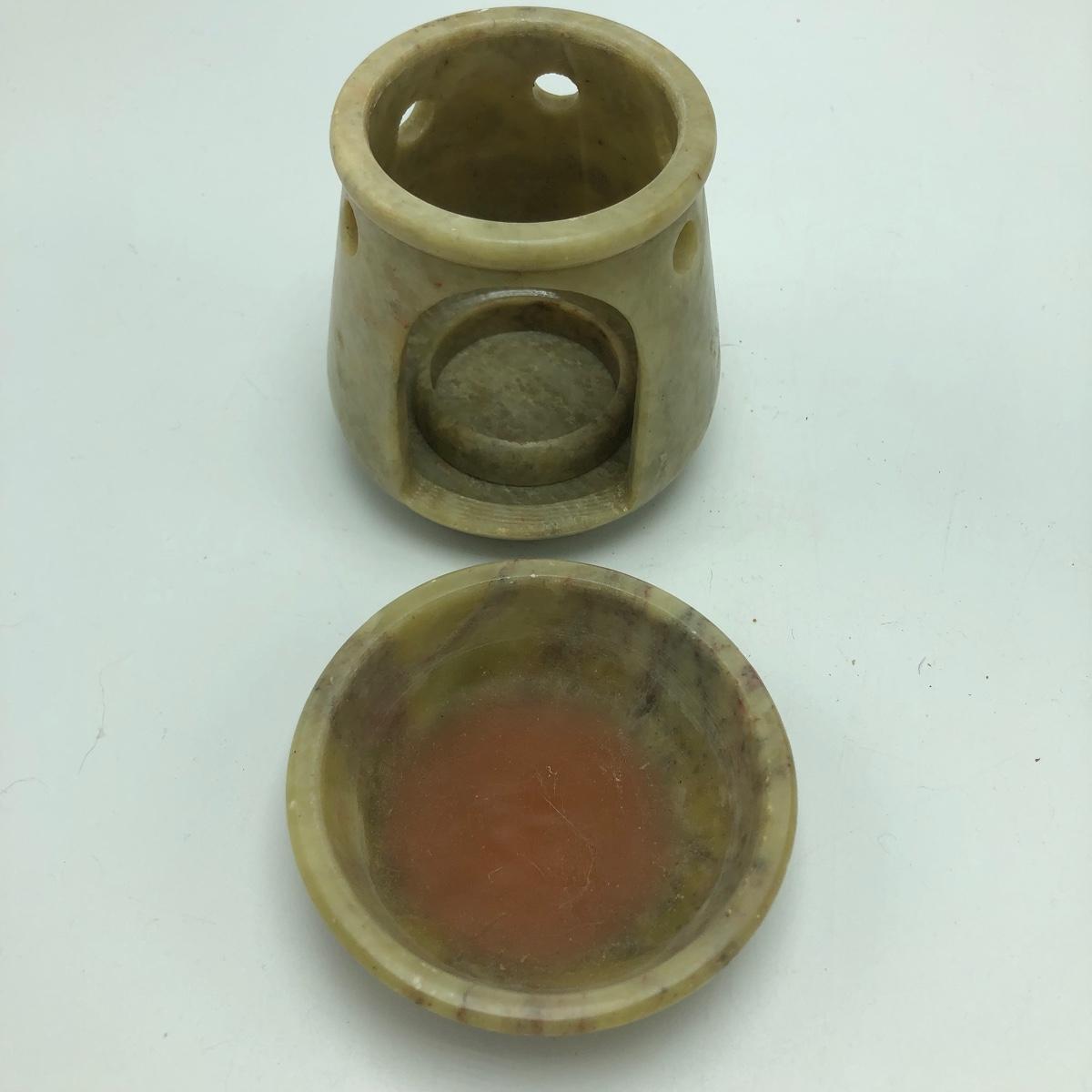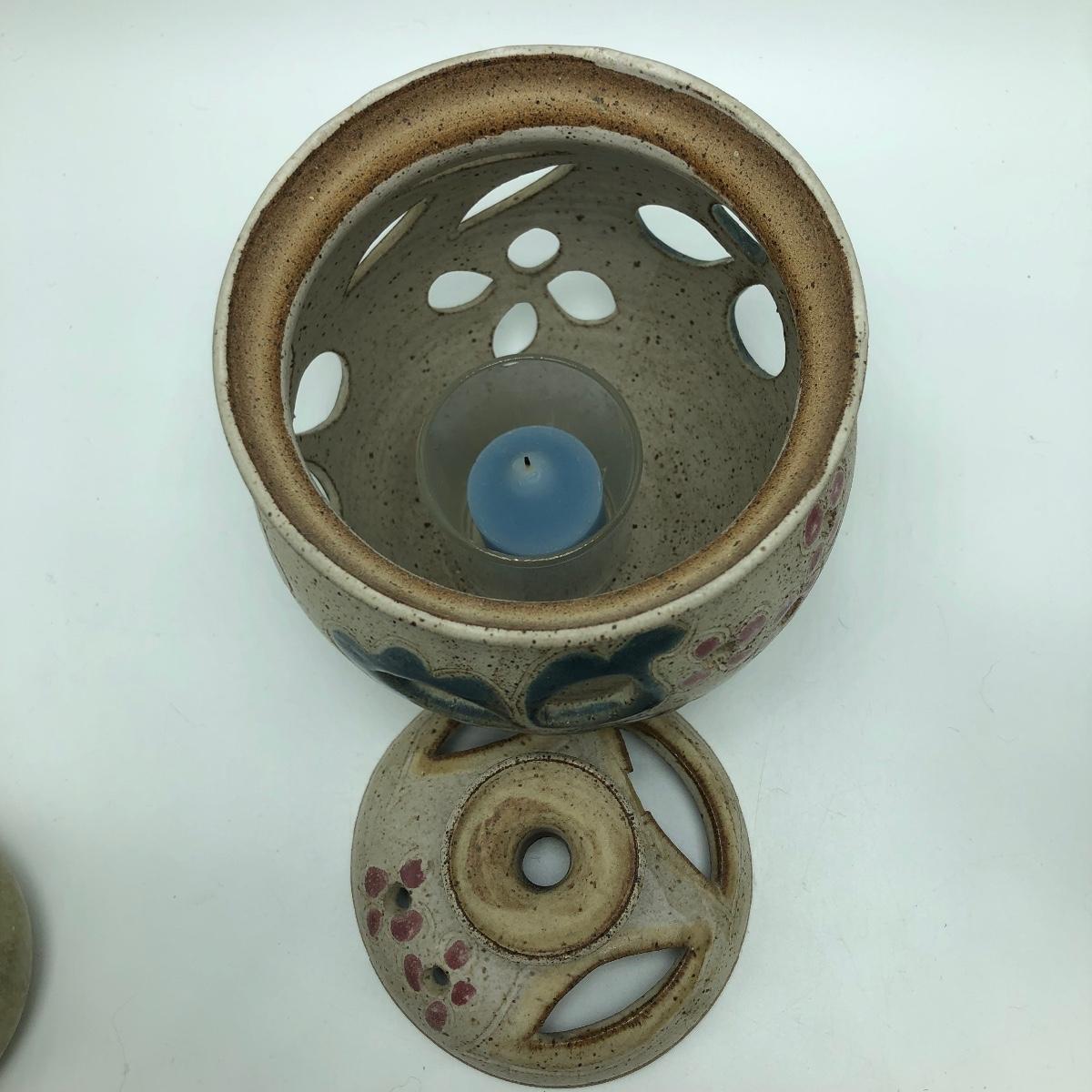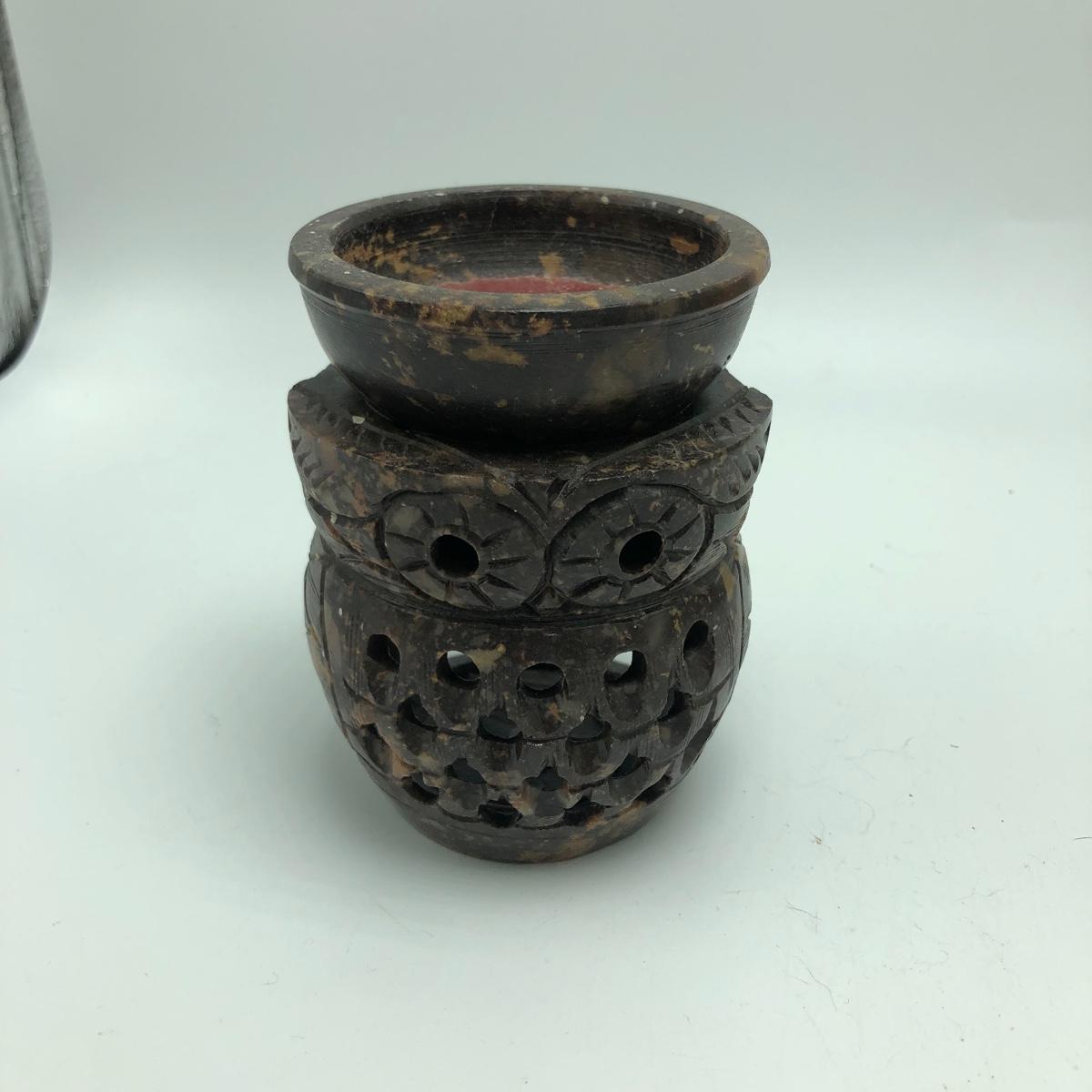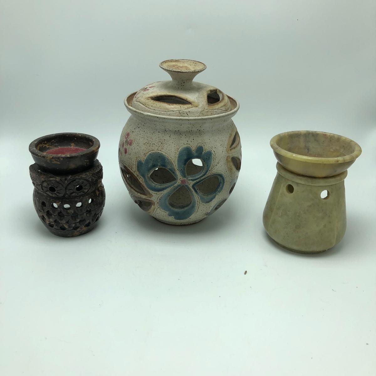 Lot includes owl design soapstone resin burner, tan colored soapstone resin burner and a signed ceramic candle jar. Largest piece measures 5.5”D x 7.5” tall.