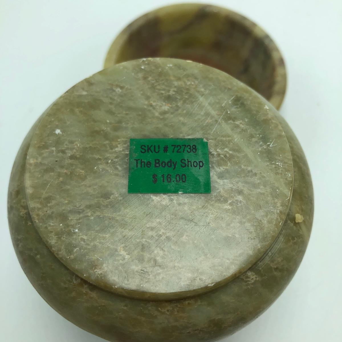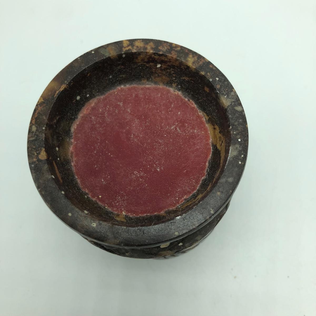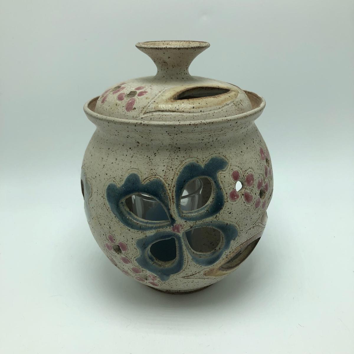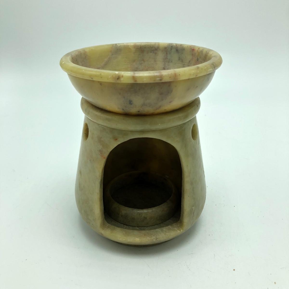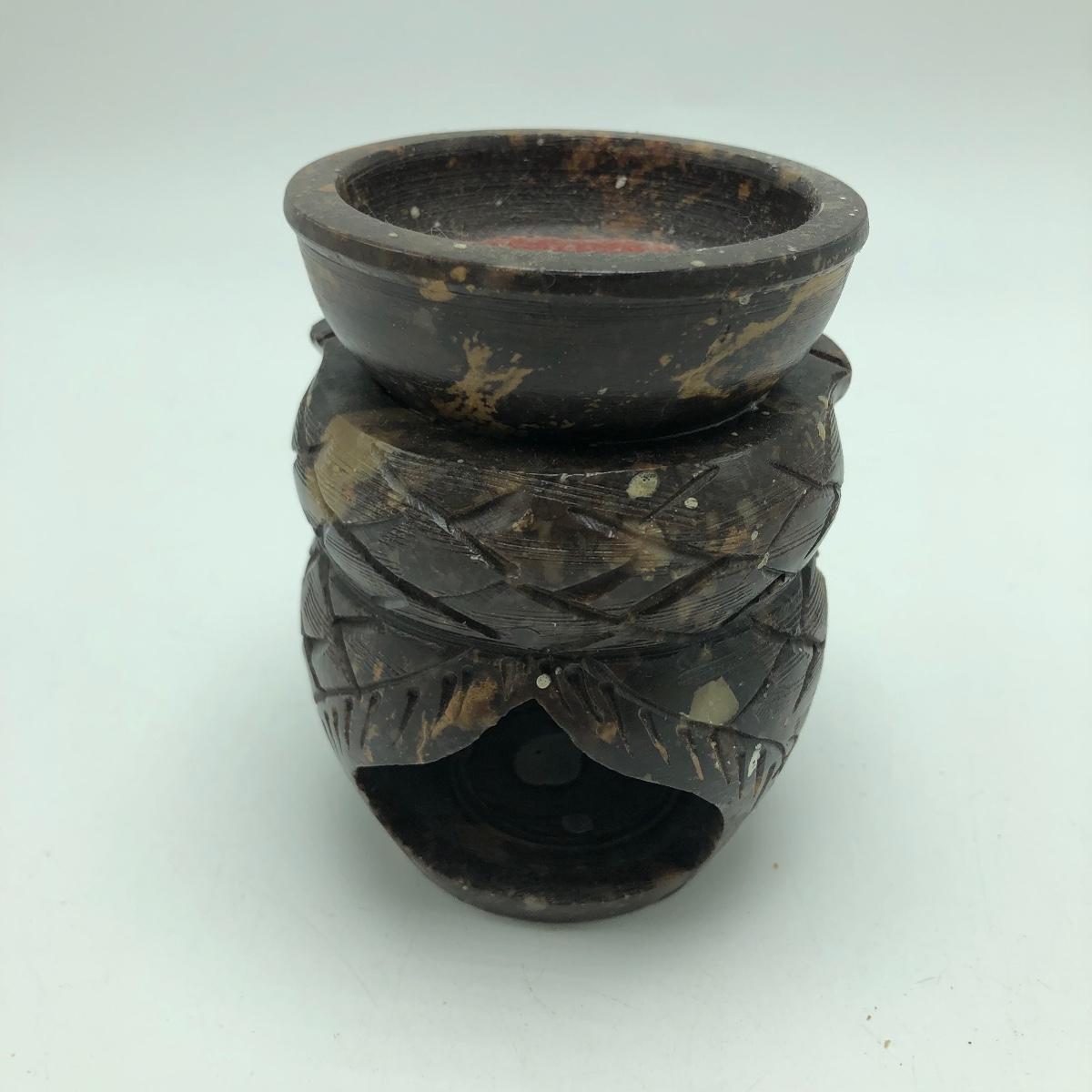 Lot includes owl design soapstone resin burner, tan colored soapstone resin burner and a signed ceramic candle jar. Largest piece measures 5.5”D x 7.5” tall.