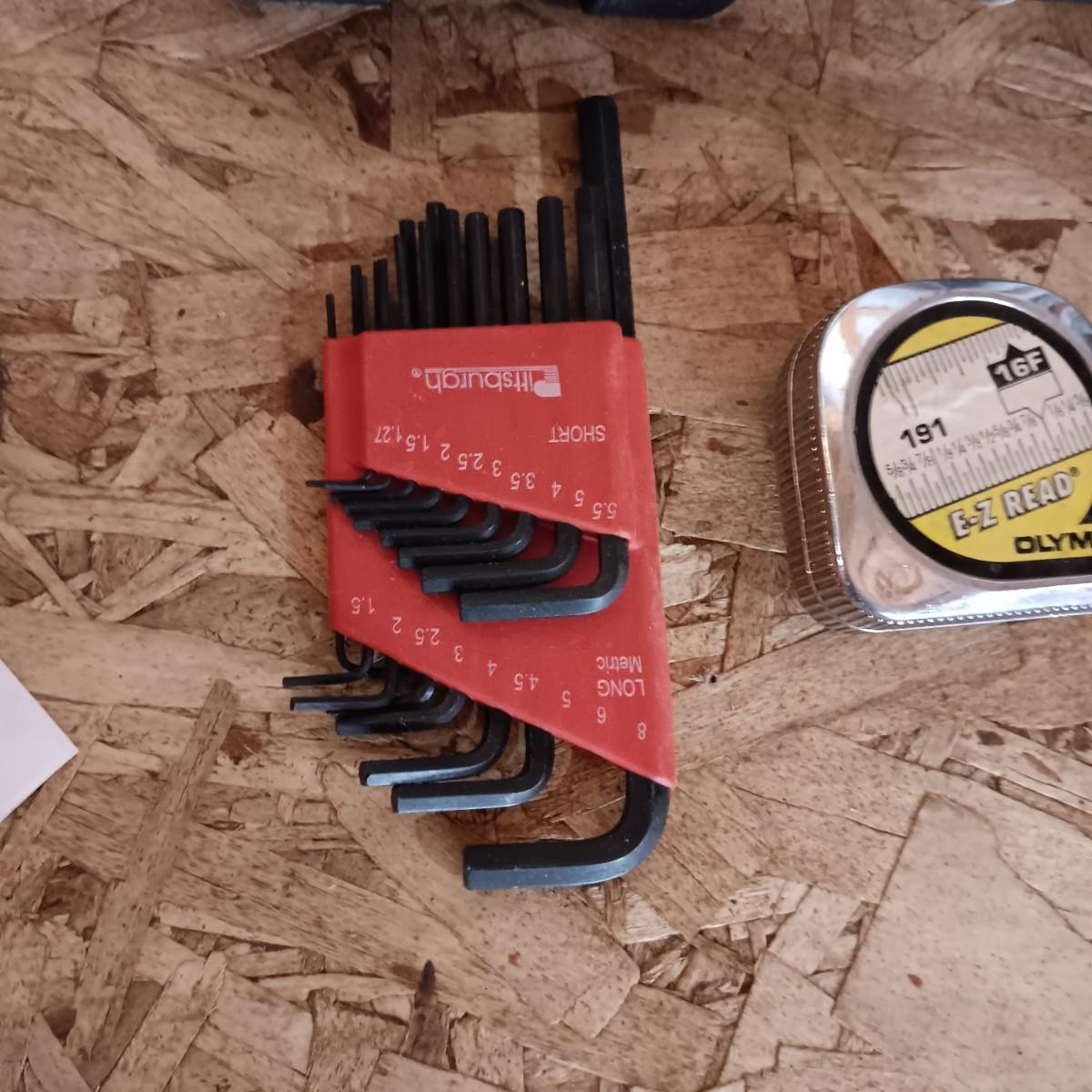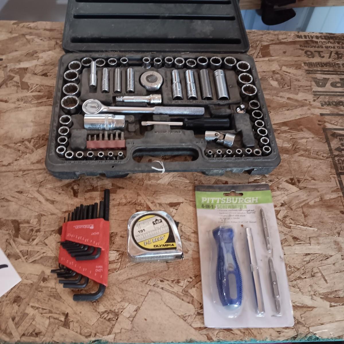 SOCKET SET, ALLEN WRENCHES, TAPE MEASURE AND 4 IN 1 SCREWDRIVER