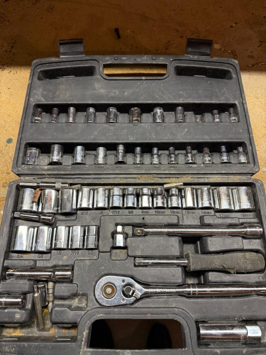 Well-used socket and ratchet set in a durable molded plastic case. Includes various socket sizes and attachments. Great for everyday repairs.