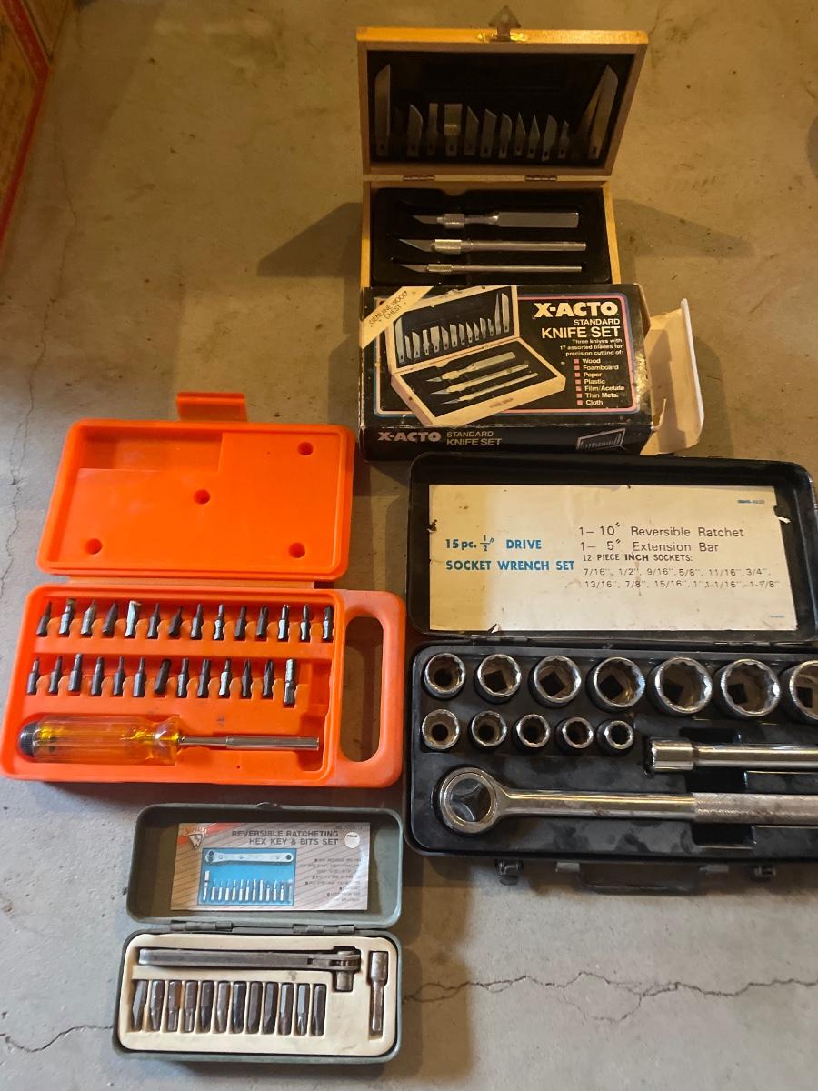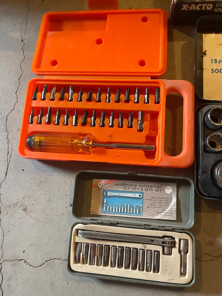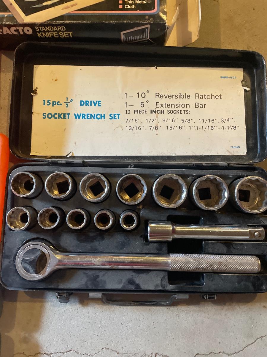 Includes a 15 piece Half drive set, a screwdriver set and a reversible ratcheting hex key and bit set
