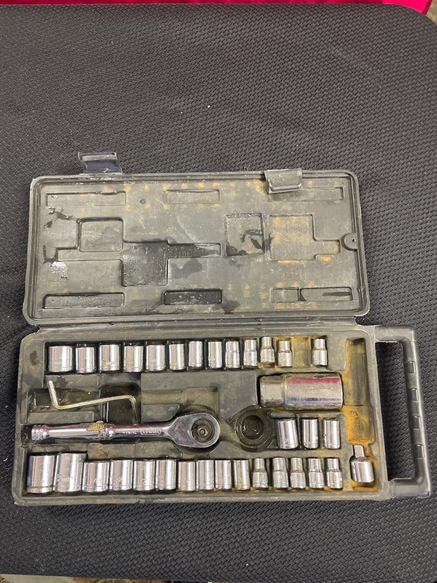Sockets and driver. Not a complete set. Includes metric and standard sockets.
