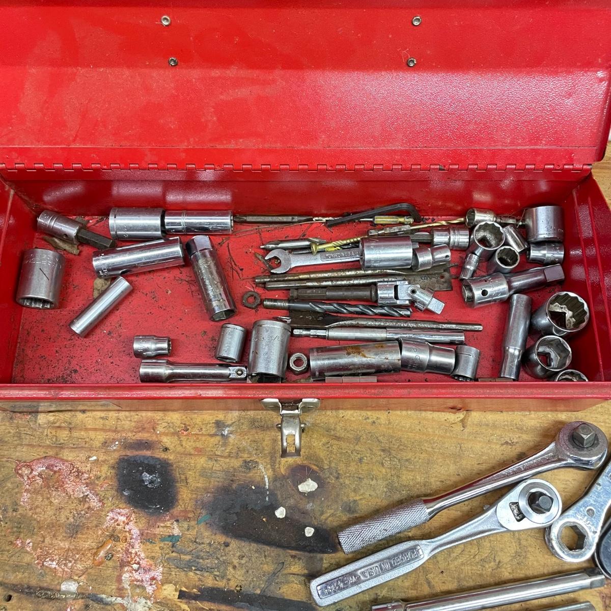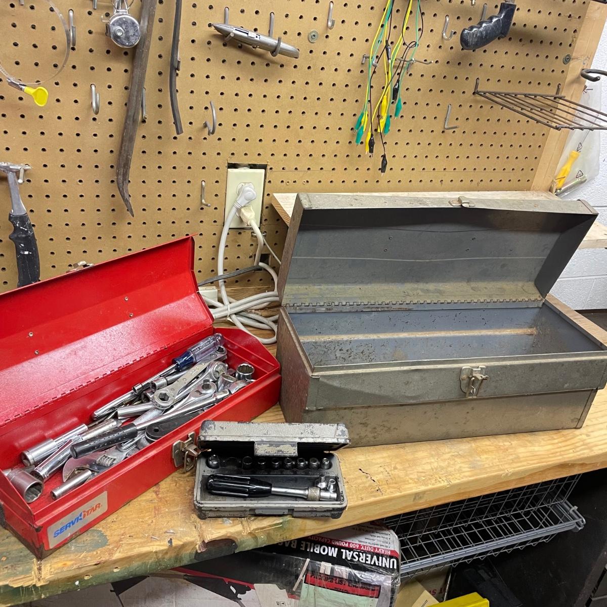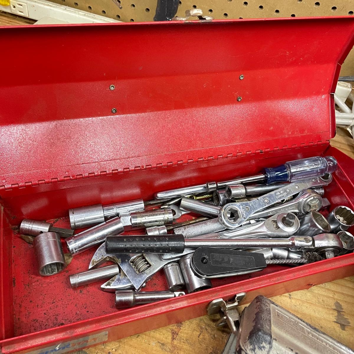 Two metal toolboxes with a small Craftsman socket set. The red tool box has a variety of sockets and drill bits. The Craftsman case is hard plastic and it’s missing 7/16. The largest toolbox measures 19” x 7.75” x 7.5”H. See images. Local pick up only.