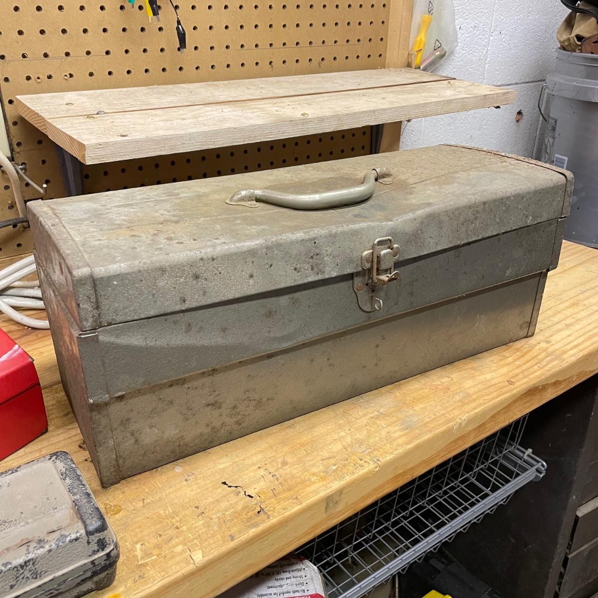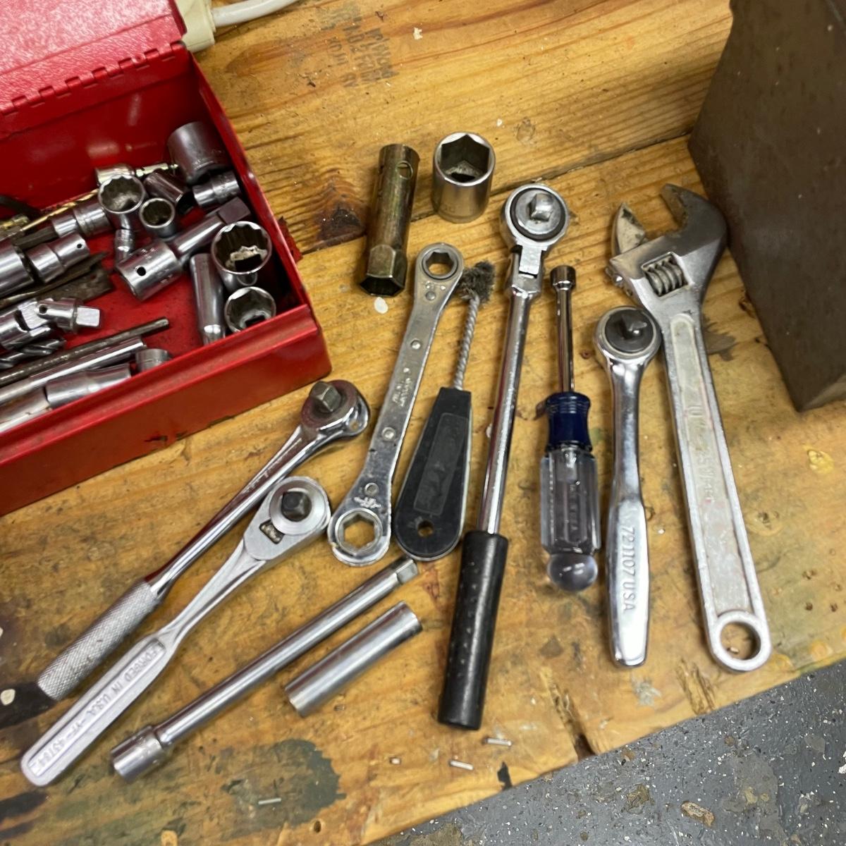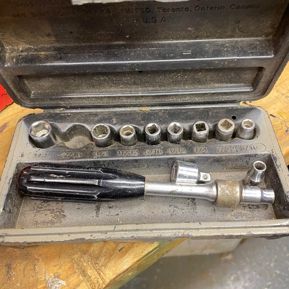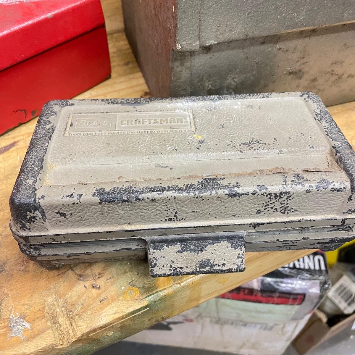 Two metal toolboxes with a small Craftsman socket set. The red tool box has a variety of sockets and drill bits. The Craftsman case is hard plastic and it’s missing 7/16. The largest toolbox measures 19” x 7.75” x 7.5”H. See images. Local pick up only.