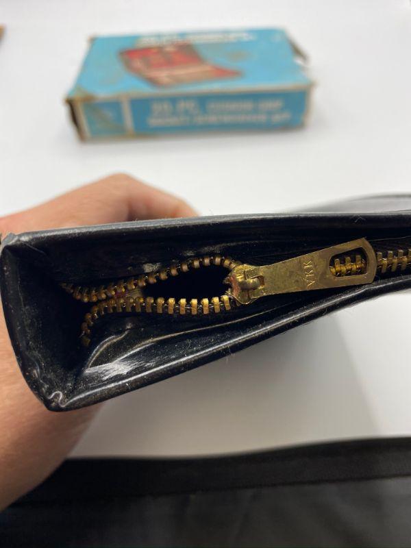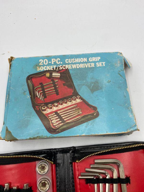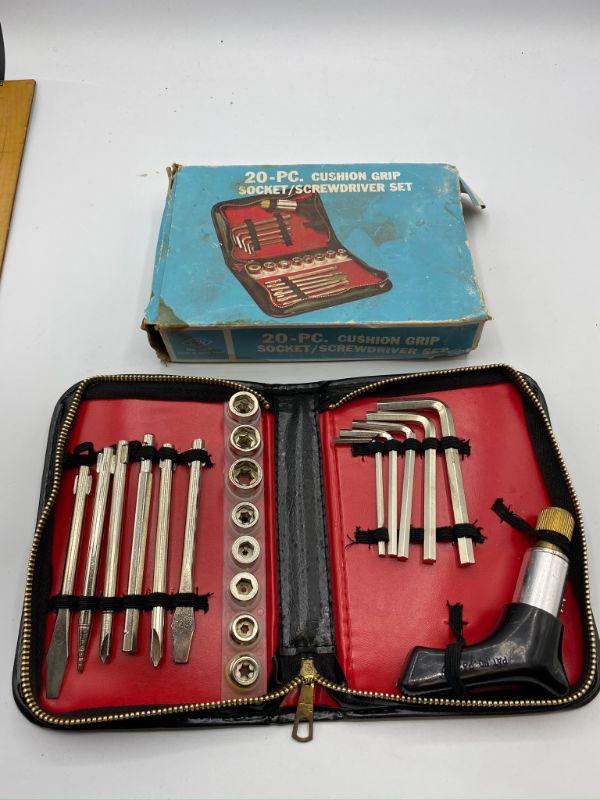 20 Piece socket/ screwdriver set. Complete. Elastic has aged and broken on some of the loops. Box is very worn. Zipper closes almost completely.