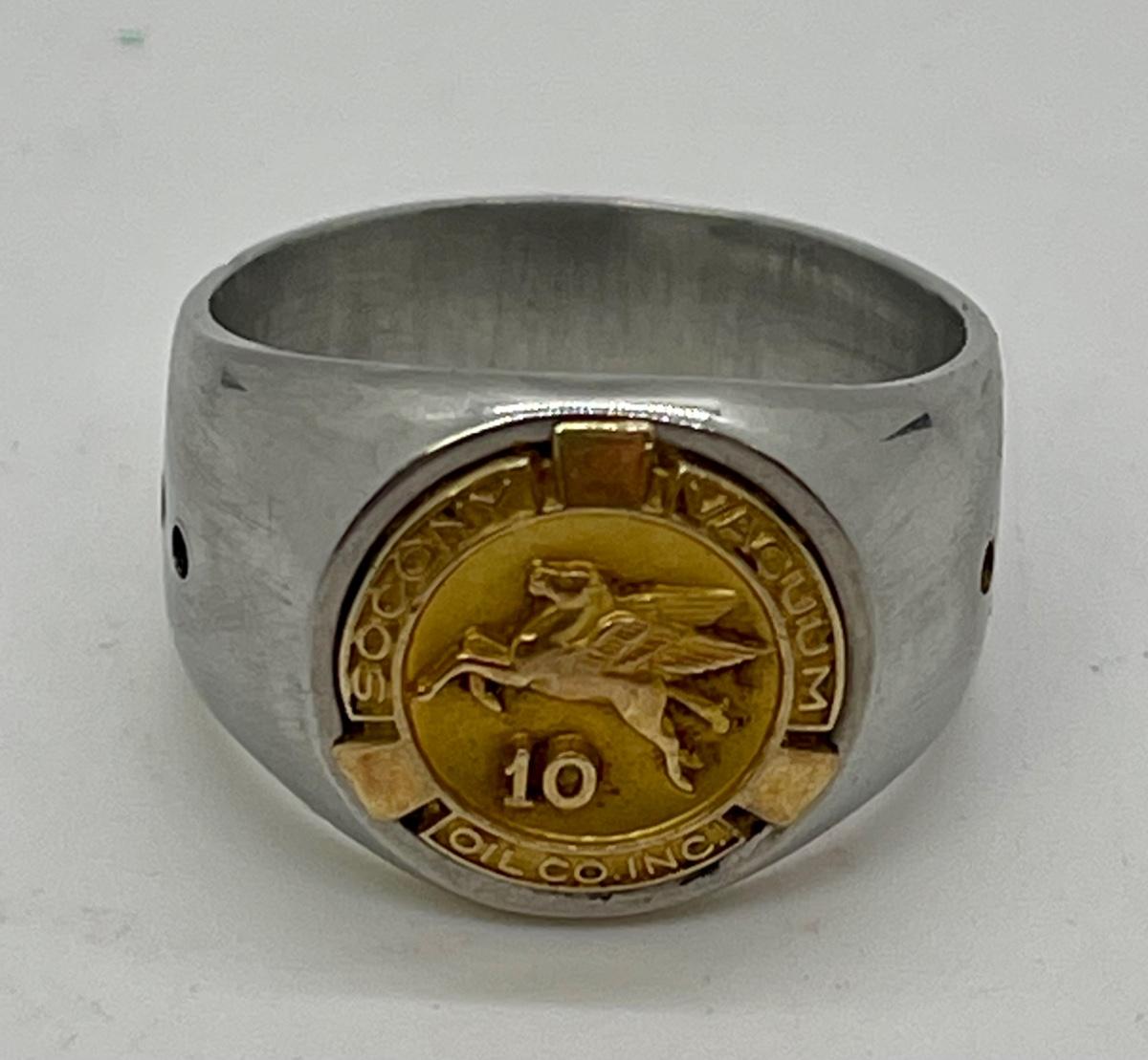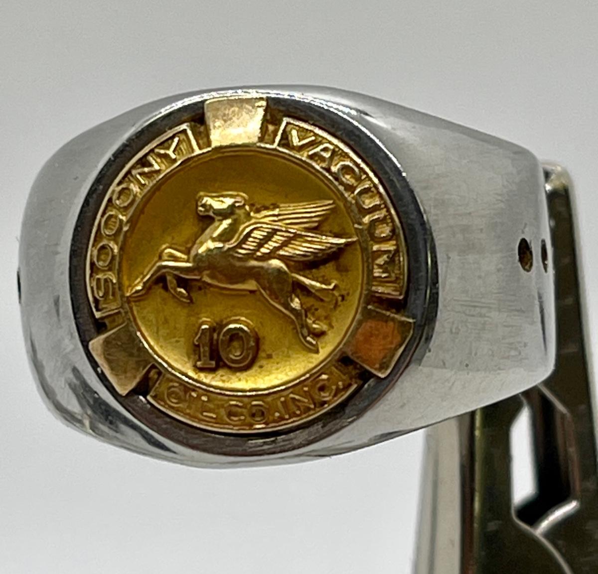 We believe this was a 10k pin that was transformed into a ring which hides the gold mark. This company name was used between 1934 to 1955 and eventually became Mobil Corp. The ring appears to be steel and one of the edges has a small dent. Approx size 11.