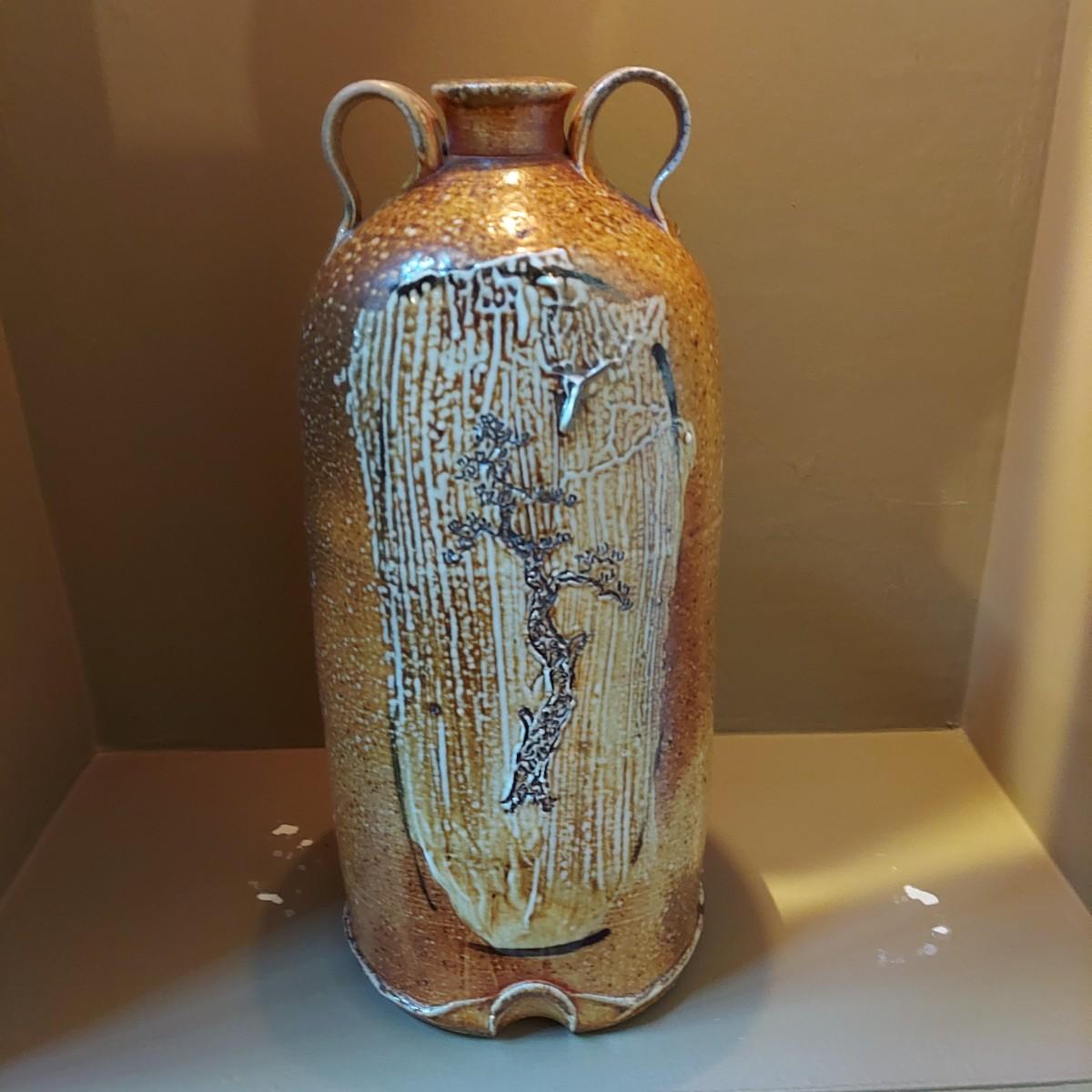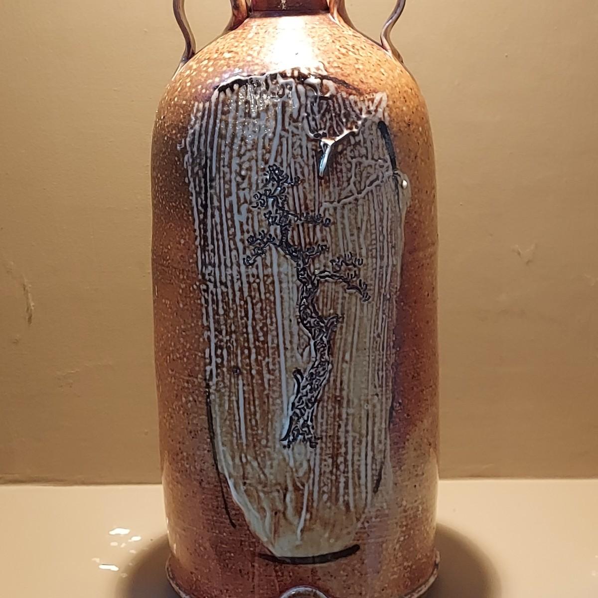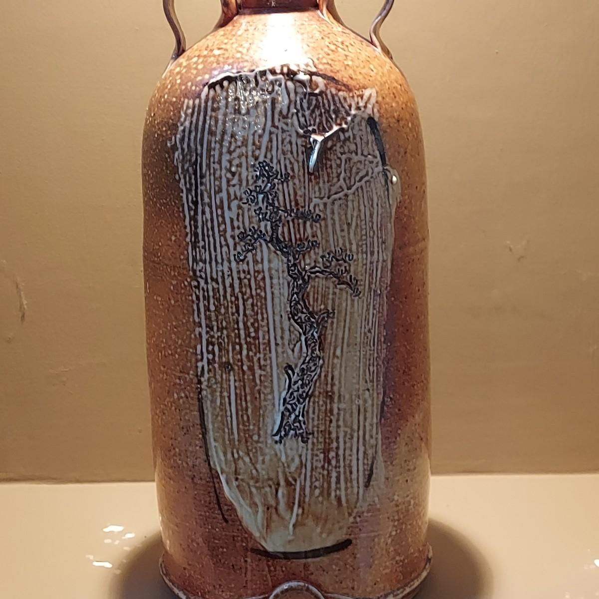 One of a kind pottery piece appears to be by Wallace Woods Pottery from Western NC. Hand Carved tree on a ceramic bud vase with soda glaze. Measures approximately 5 x 5.5 x 12"H. Shipping available.