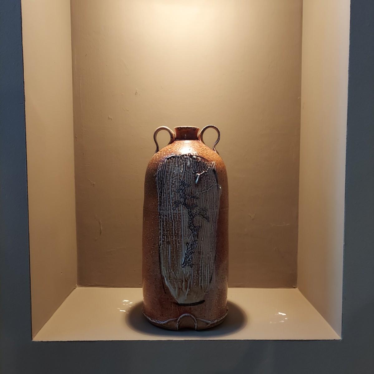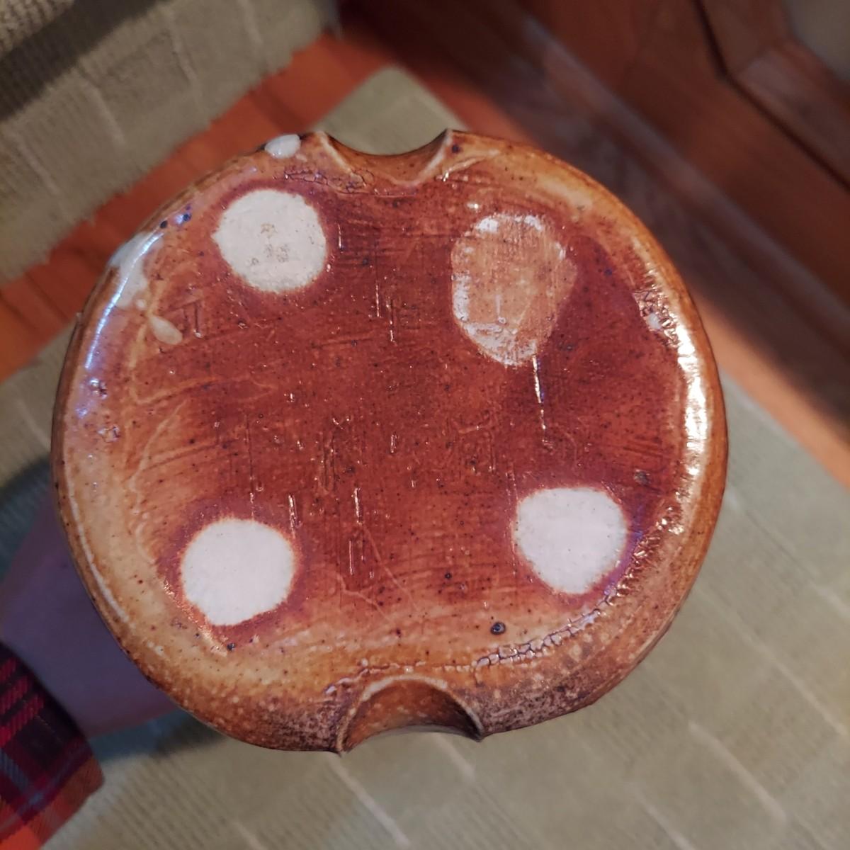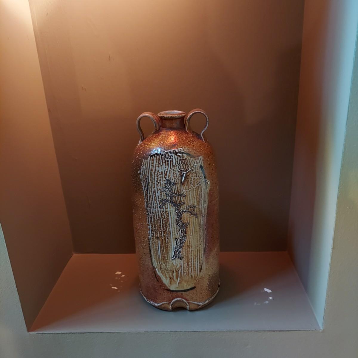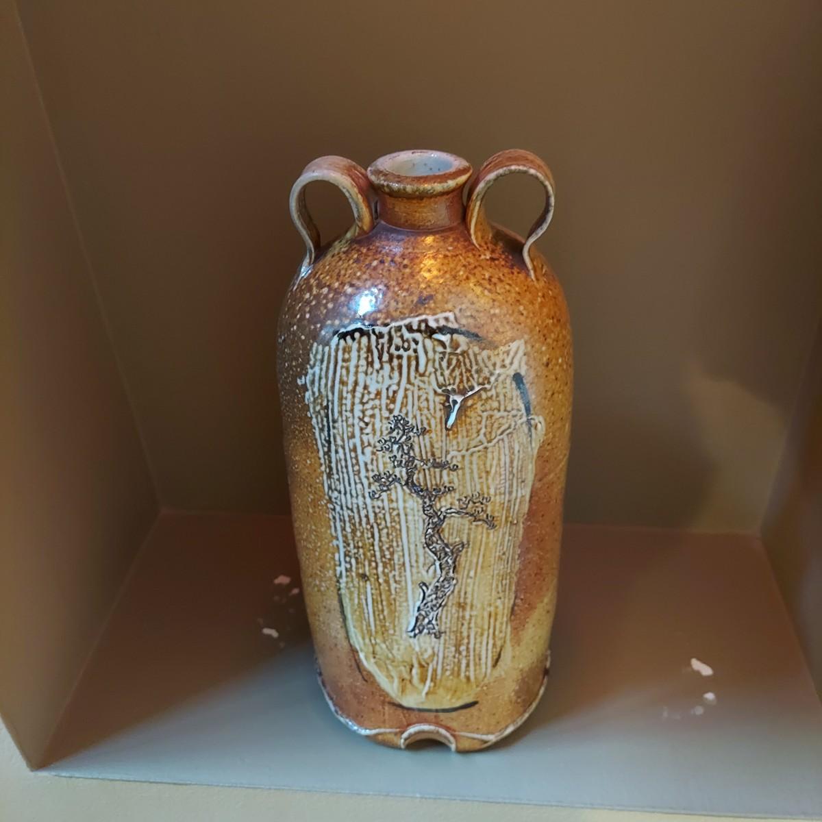 One of a kind pottery piece appears to be by Wallace Woods Pottery from Western NC. Hand Carved tree on a ceramic bud vase with soda glaze. Measures approximately 5 x 5.5 x 12"H. Shipping available.