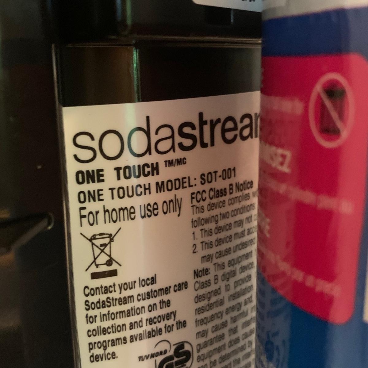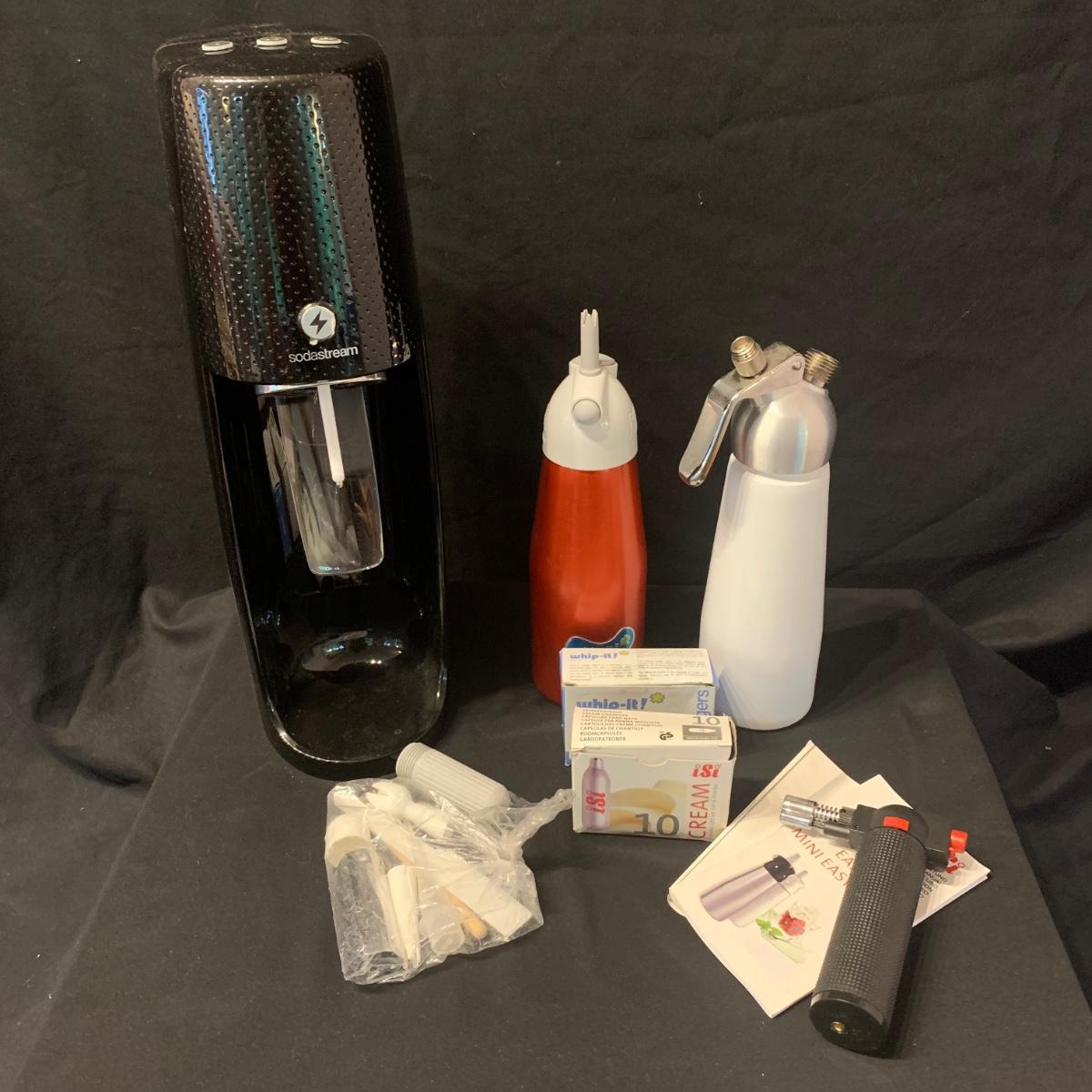 Soda Stream One Touch with CO2, two whipped cream canisters with cartridges, and one crème brûlée torch. Soda Stream One Touch measures, 4.5” x 6.5” x 17”H. Model number: SOT-001. Cannot verify levels of CO2 cartridges. Local pick up only.