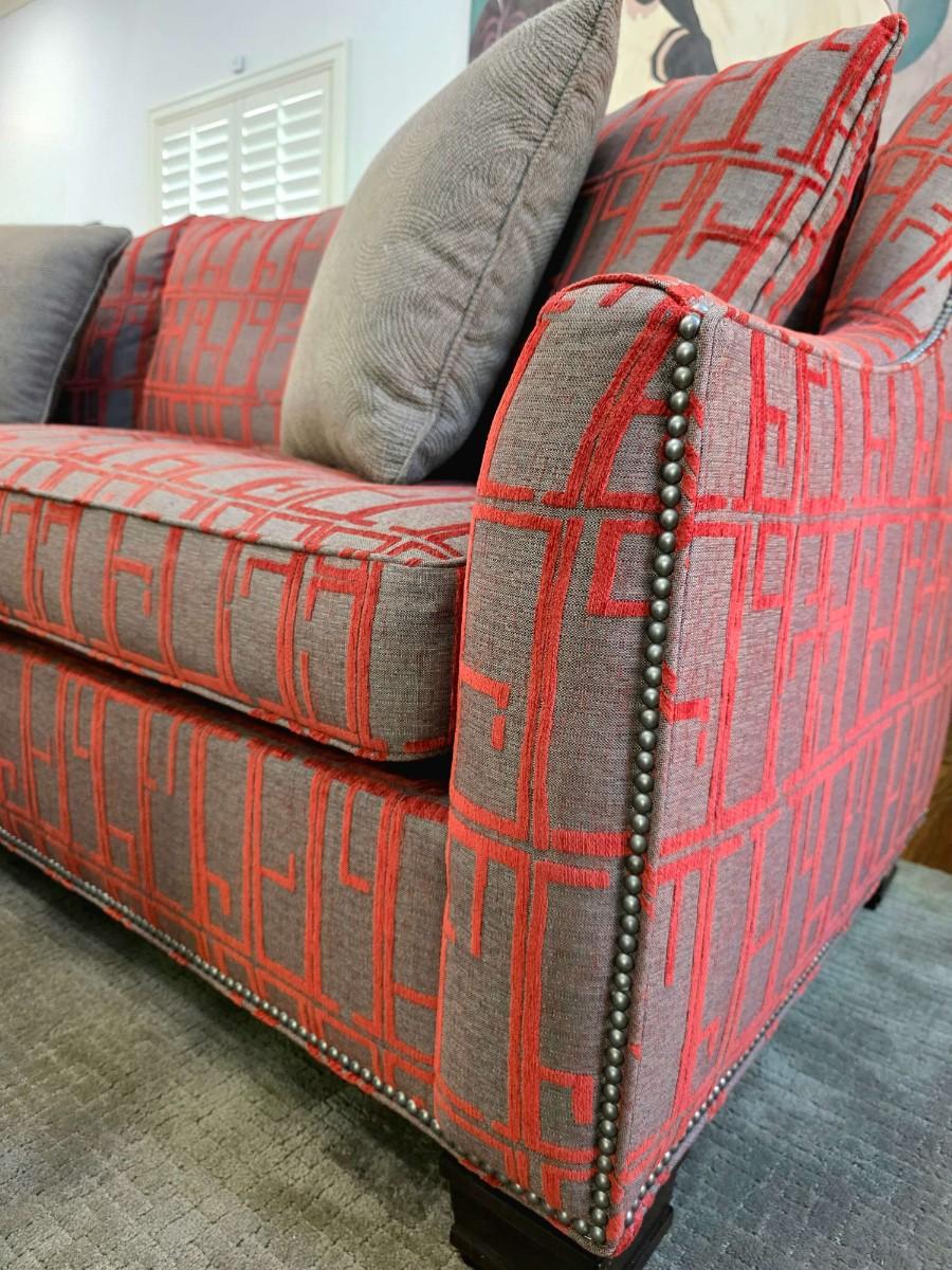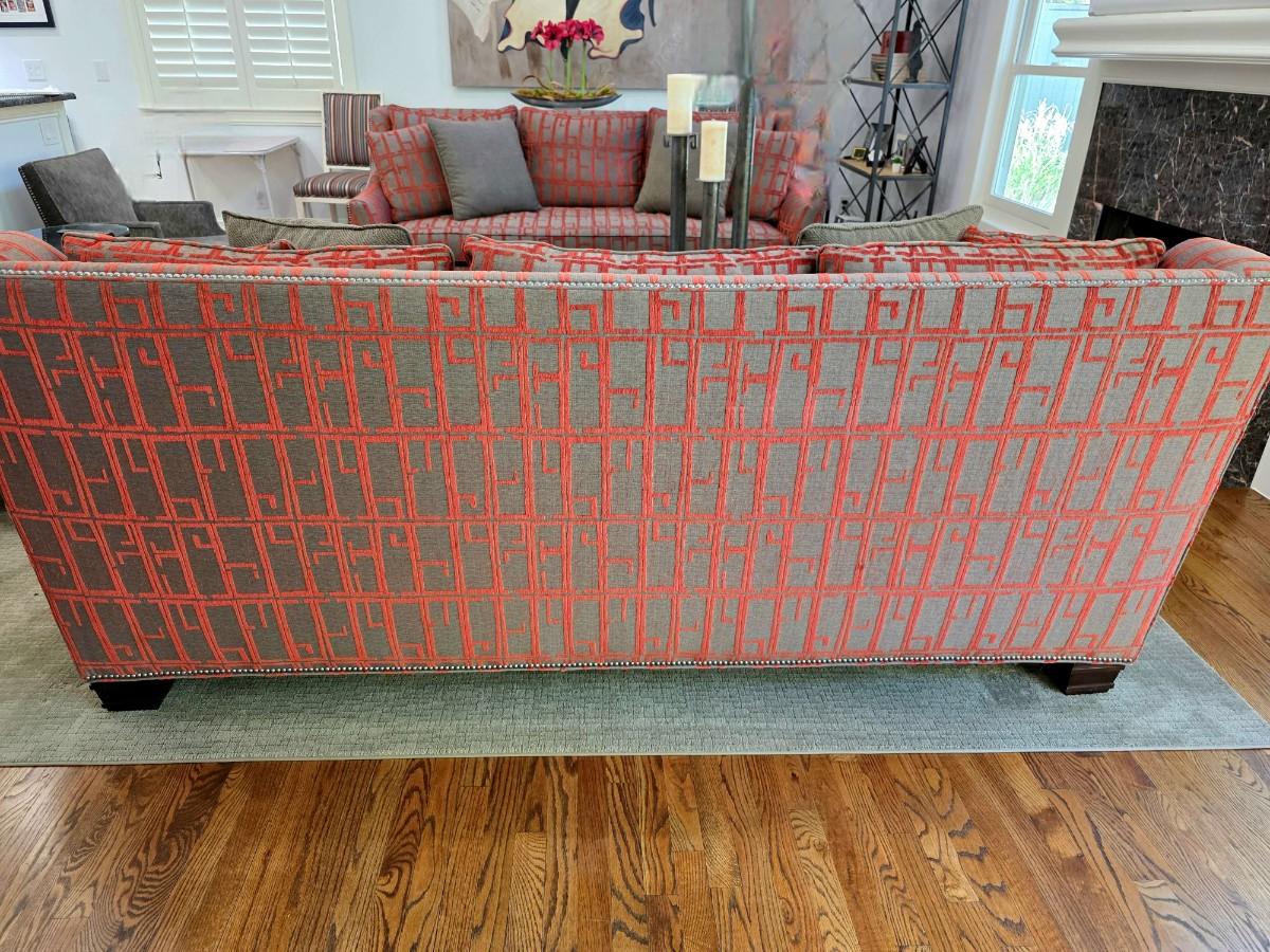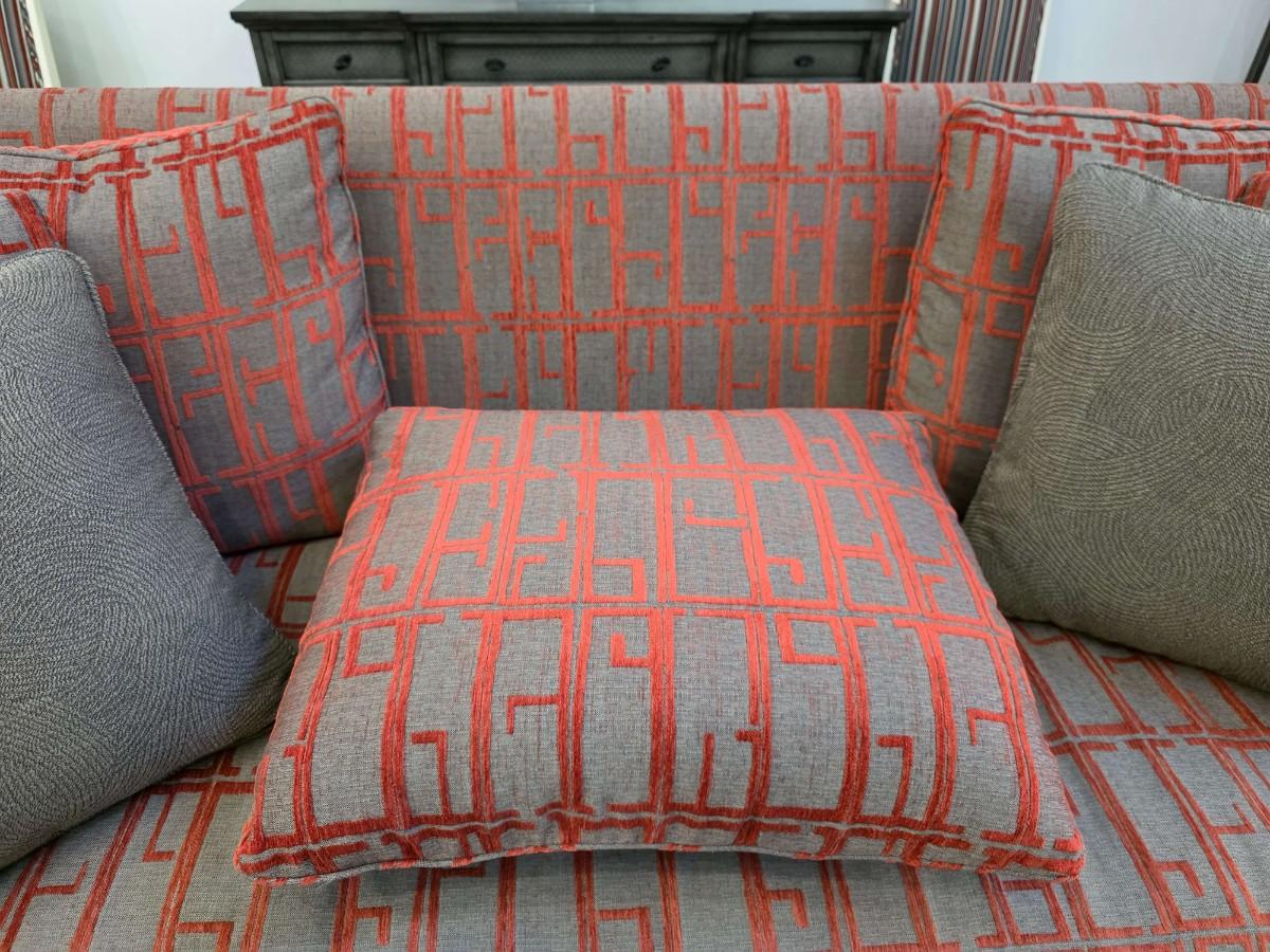 This is a pristine custom modern sofa by Hickory Chair Furniture Co. originally designed by Thayer Furniture & Design Resource in Tulsa, OK. The original purchase price was $5000 approximately 5+ years ago. Four matching throw pillows are included with the sofa. There are no known flaws or problems with the sofa. It sits nice and firm and the upholstery feels luxurious. The orange-red geometric pattern on the shimmery gray is vibrant and absolutely stunning!