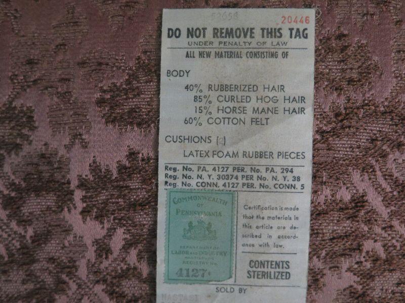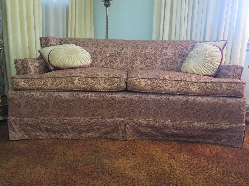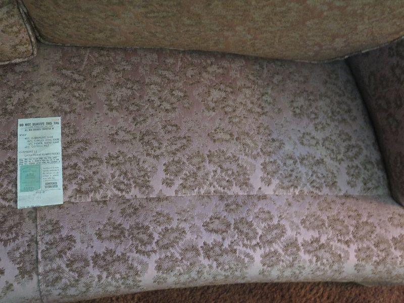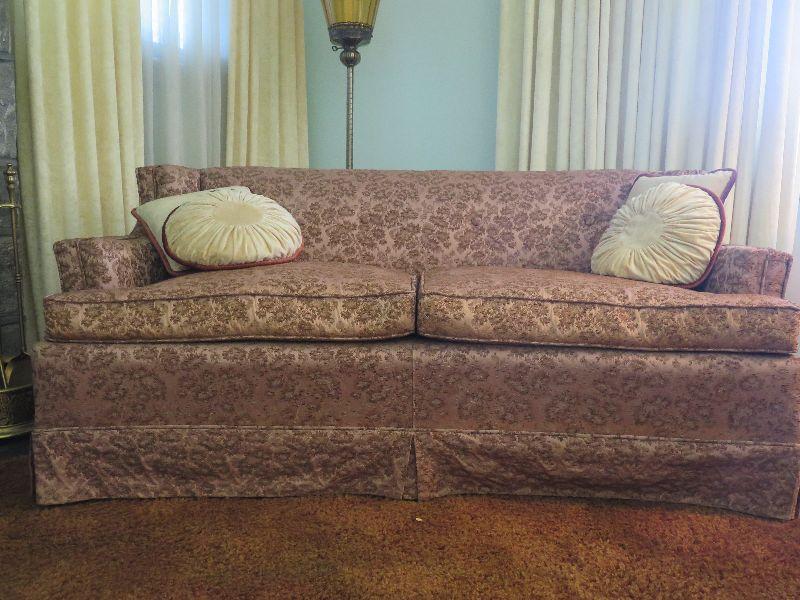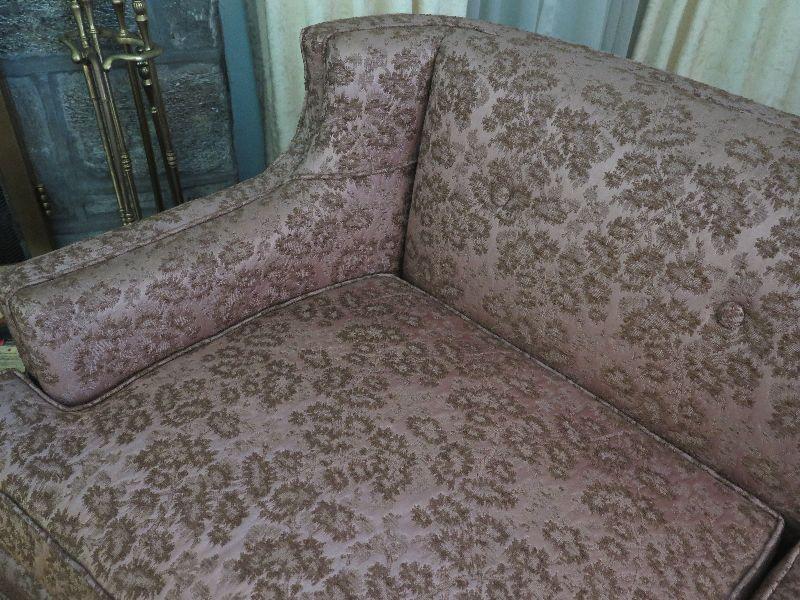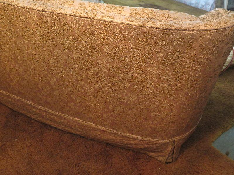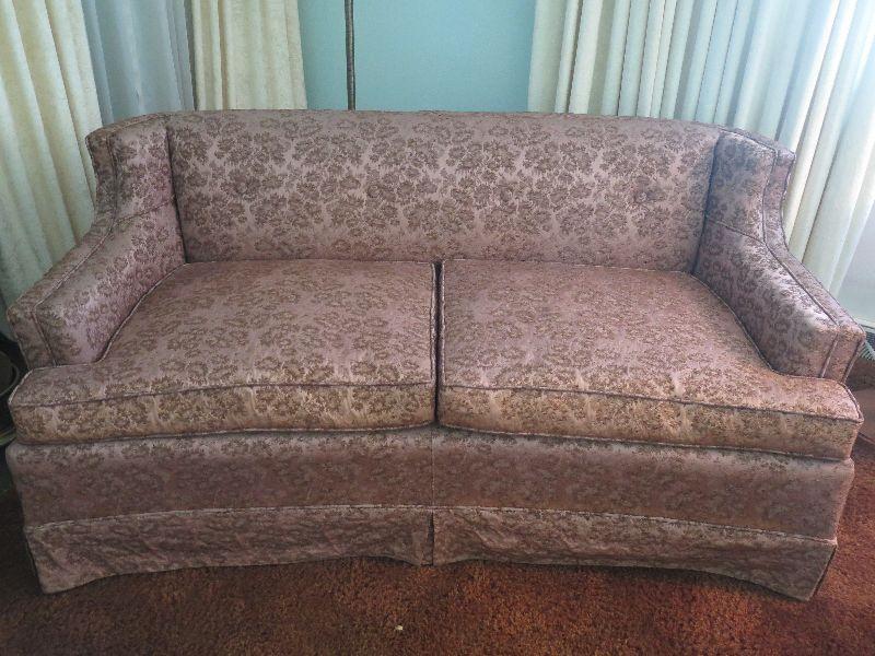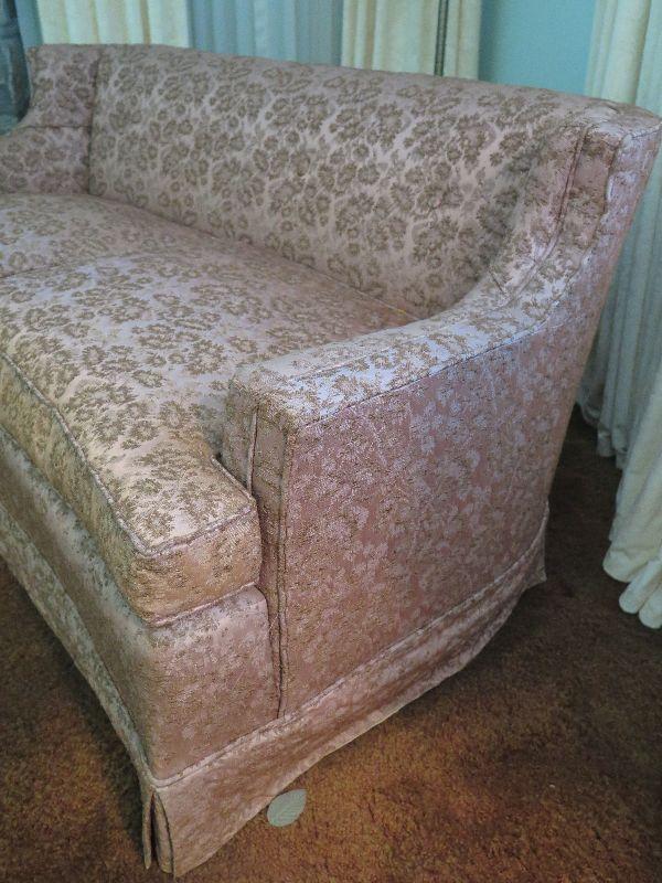 Two cushion early mid-century sofa with brocade style upholstery and low back, and is 60 inches long. The color is closer to taupe. The foam in the seat cushions has hardened and will need to be replaced. Please review all photos and read Terms and Conditions before placing a bid. Pick up is Wednesday, November 20 from 4-7pm and Saturday, November 23 from 9am-2pm in Mantua, New Jersey. All sales are final. All sales are as is, where is. Please bring all boxes, tools, and muscle needed to remove your items. Any photo props are not included. All measurements are approximate. Items come from dog-friendly home.