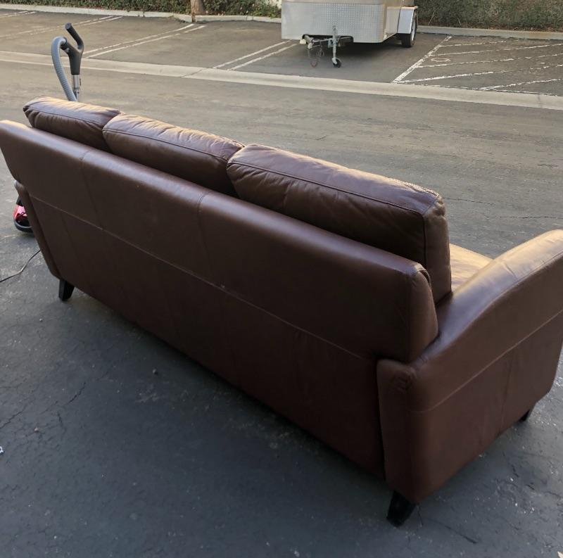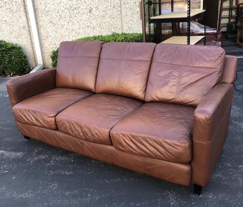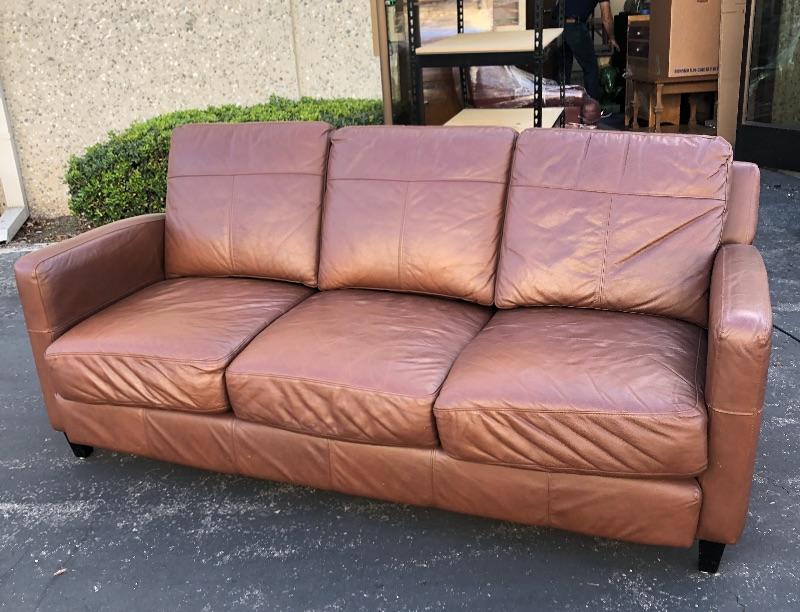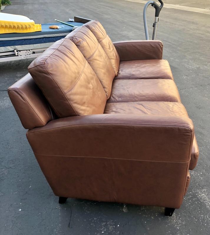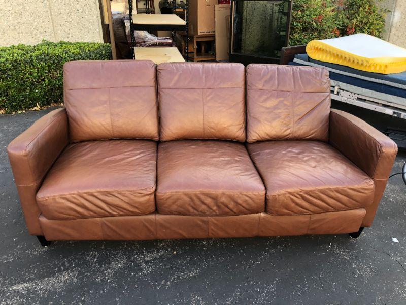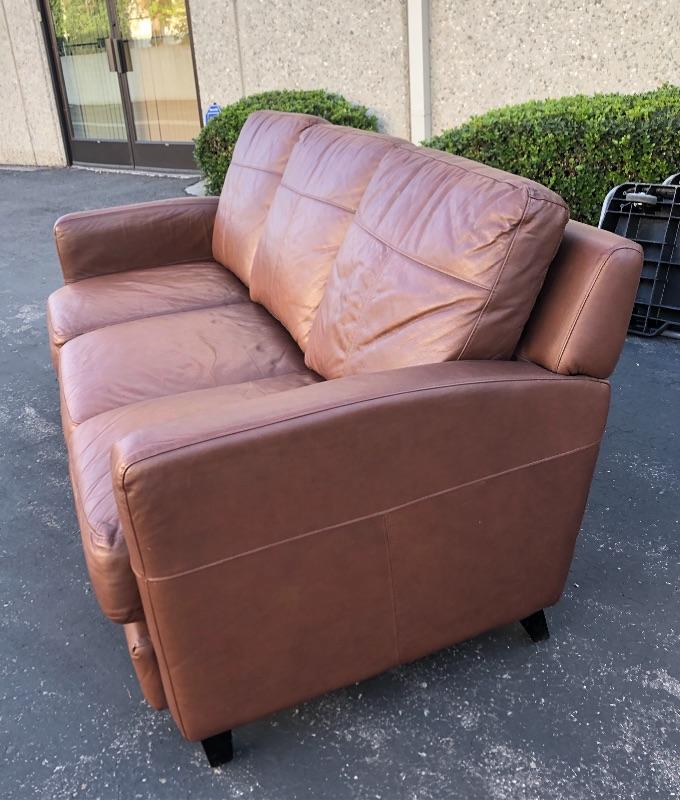 Faux leather couch. Medium brown color. Three cushions. Measures about 75" in length, good for small spaces. Great used condition.