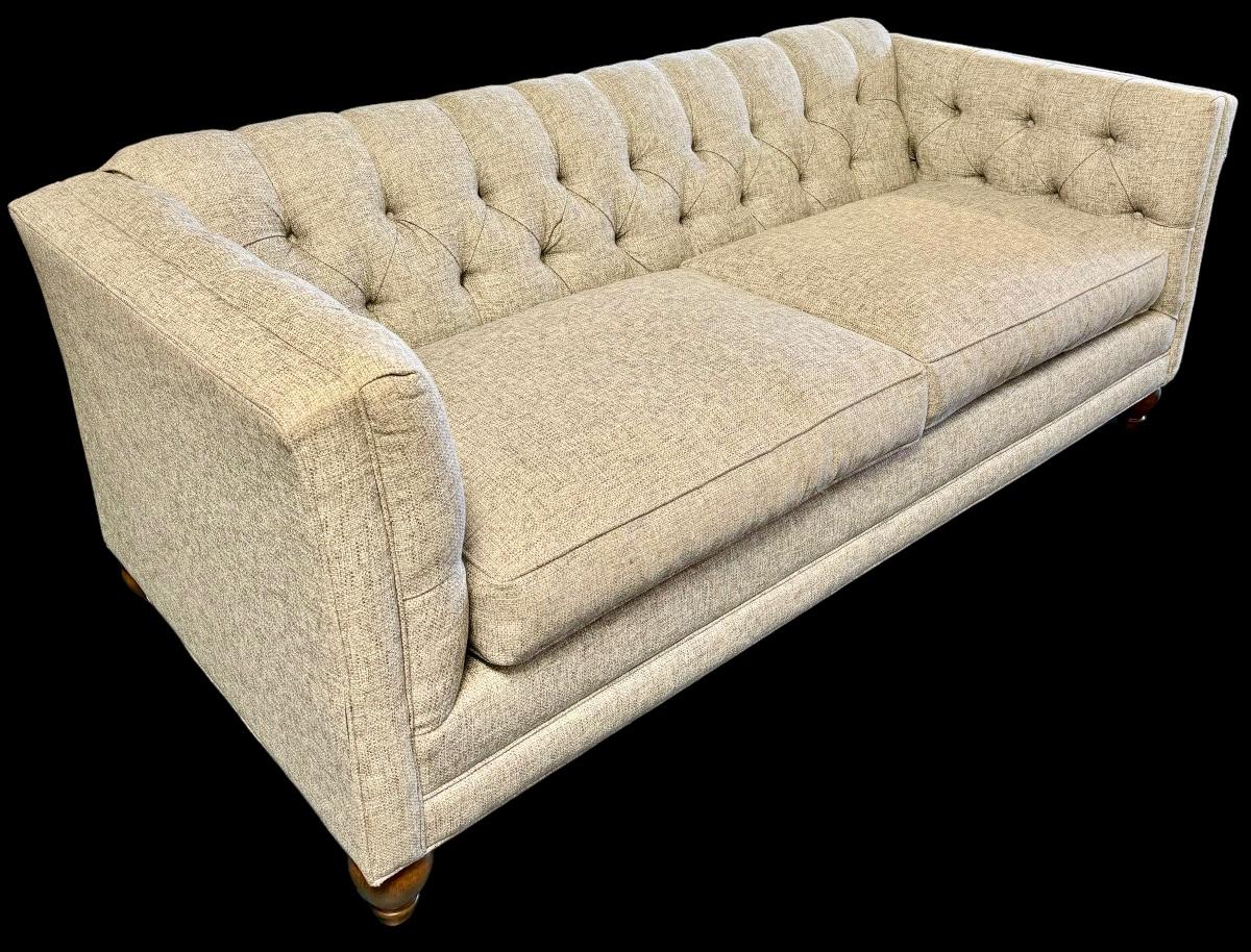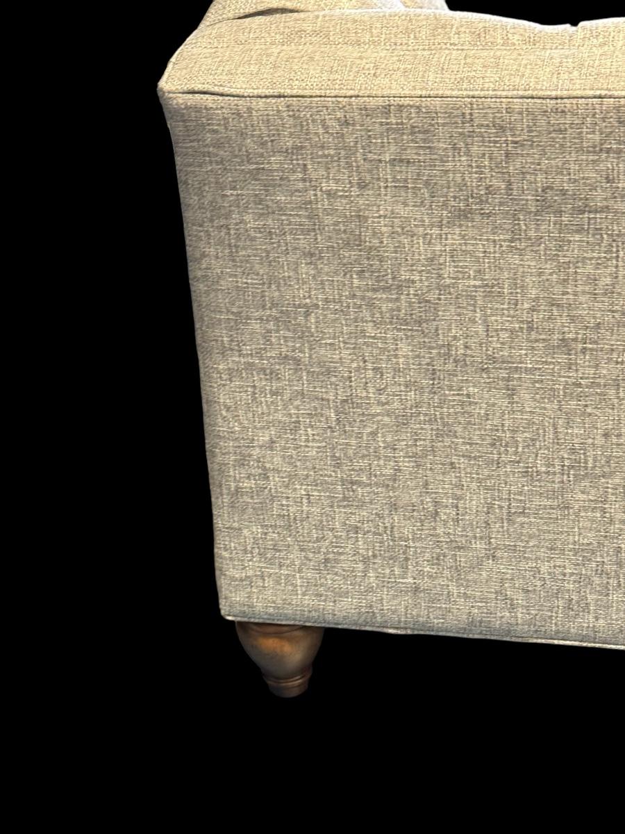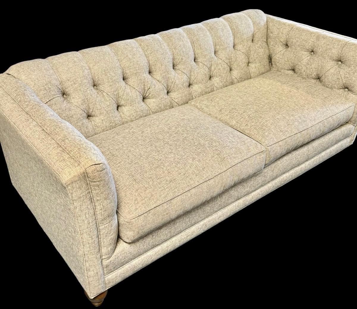 This sofa has quality construction and upholstery. with down wrapped cushions and wooden feet. This sofa is perfect for a den/office.