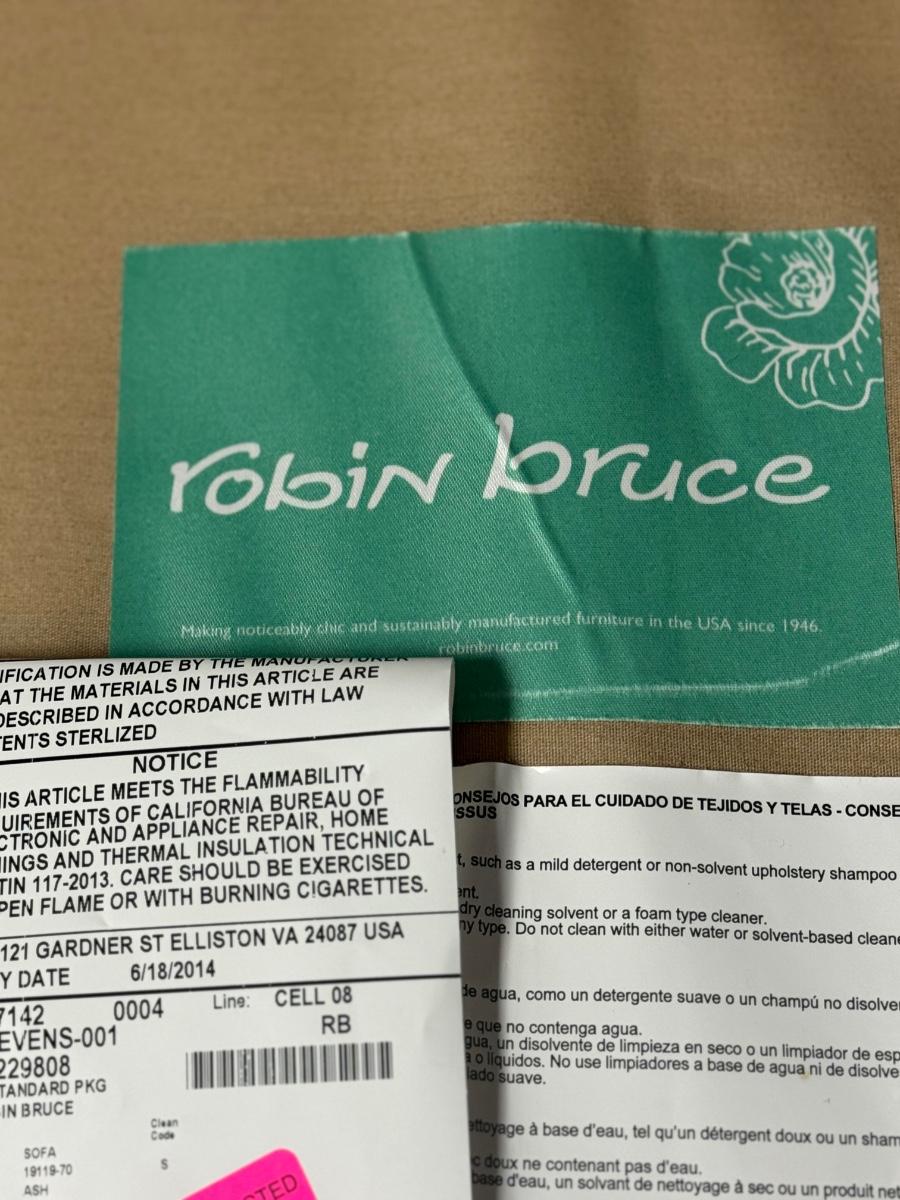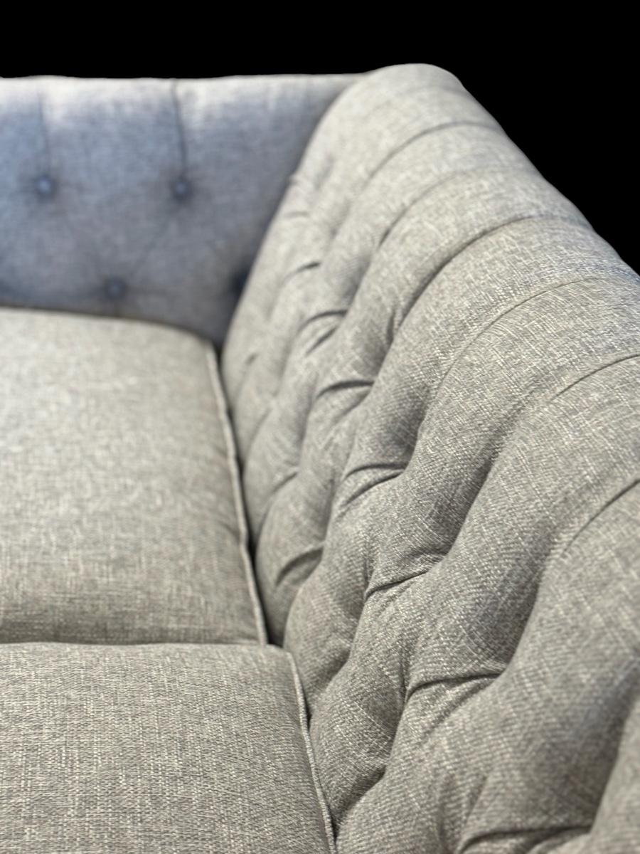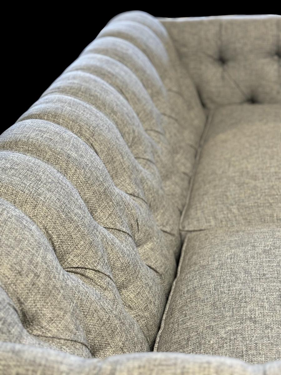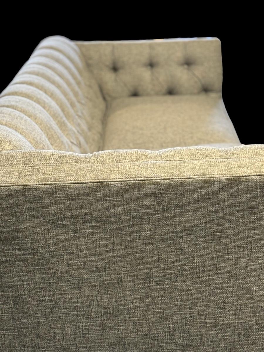 This sofa has quality construction and upholstery. with down wrapped cushions and wooden feet. This sofa is perfect for a den/office.