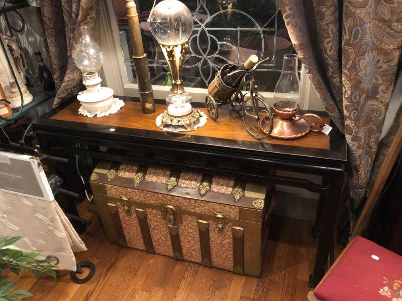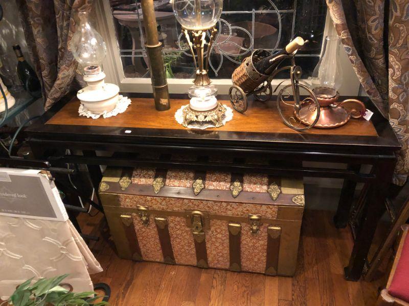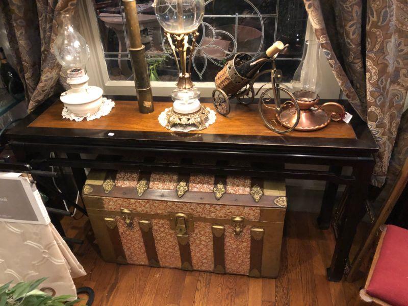 BEAUTIFUL BLACK LAQUER FRAME WITH WALNUT INSET SOFA TABLE. 52"W X 28 1/2"T
