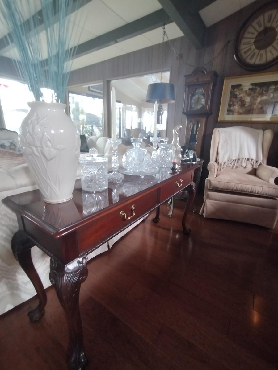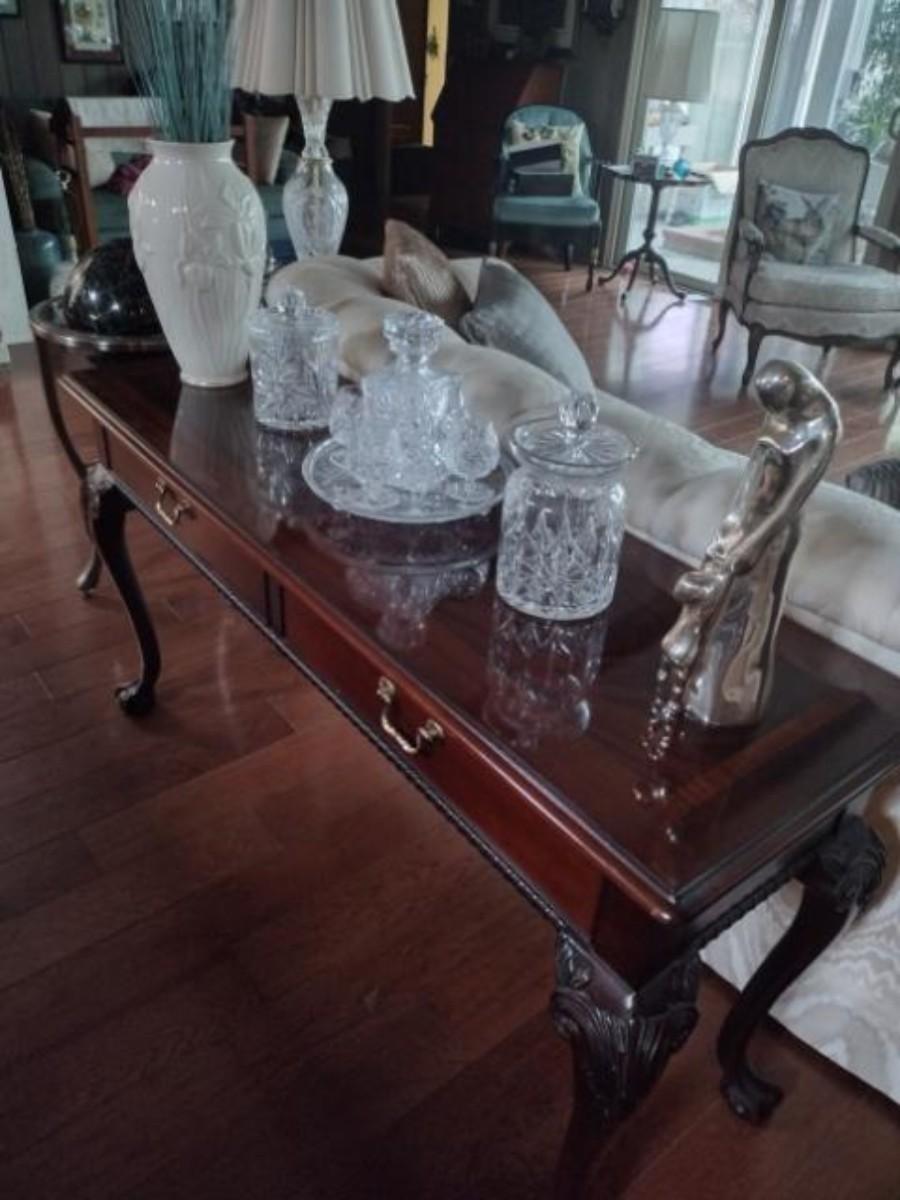 Thomasville ball in claw mahogany sofa table, excellent condition items on top not included