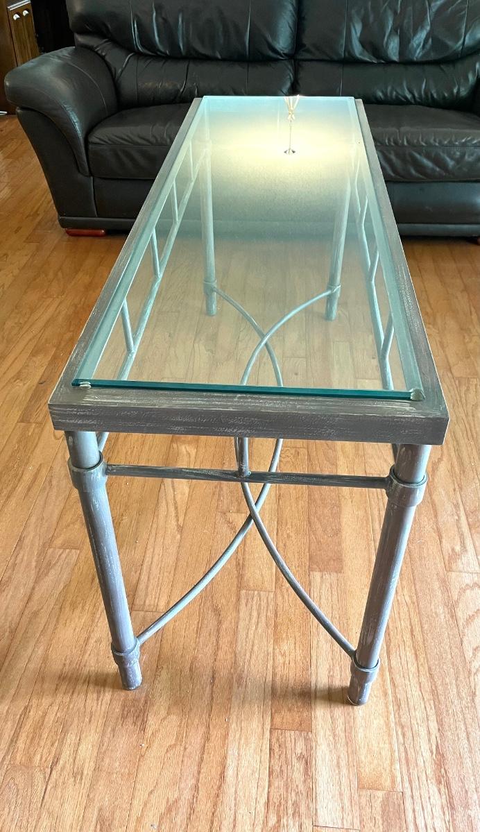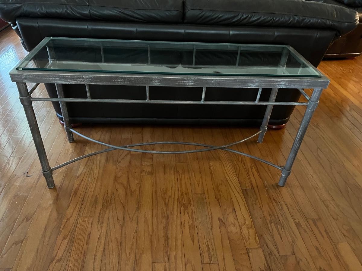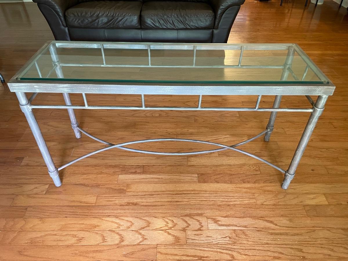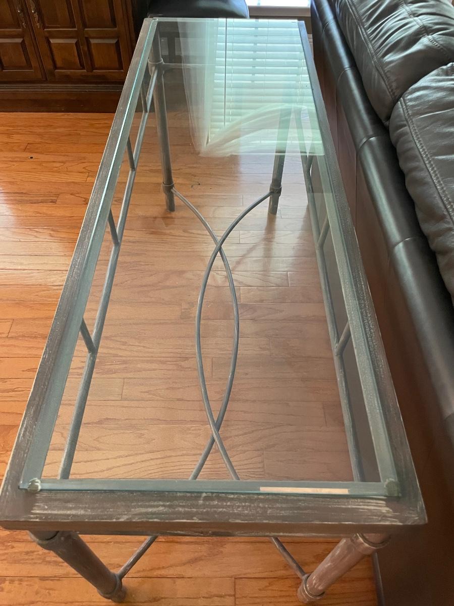 Glass Top and iron base sofa table. Measures 56 inches long, 19 inches deep and 28 inches tall. This piece matches the coffee tables and end tables.