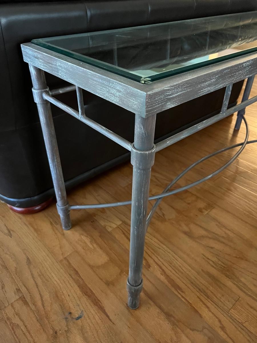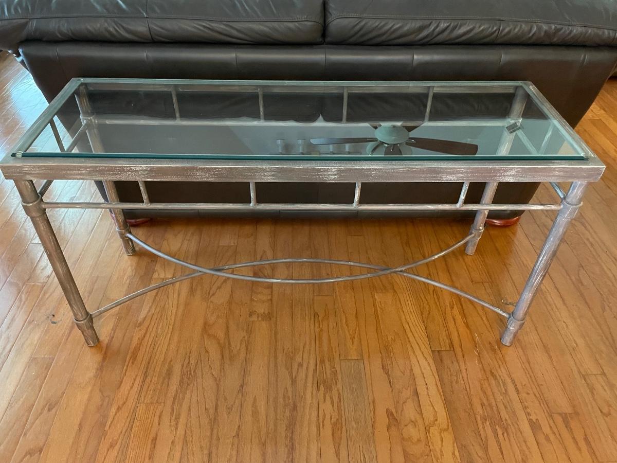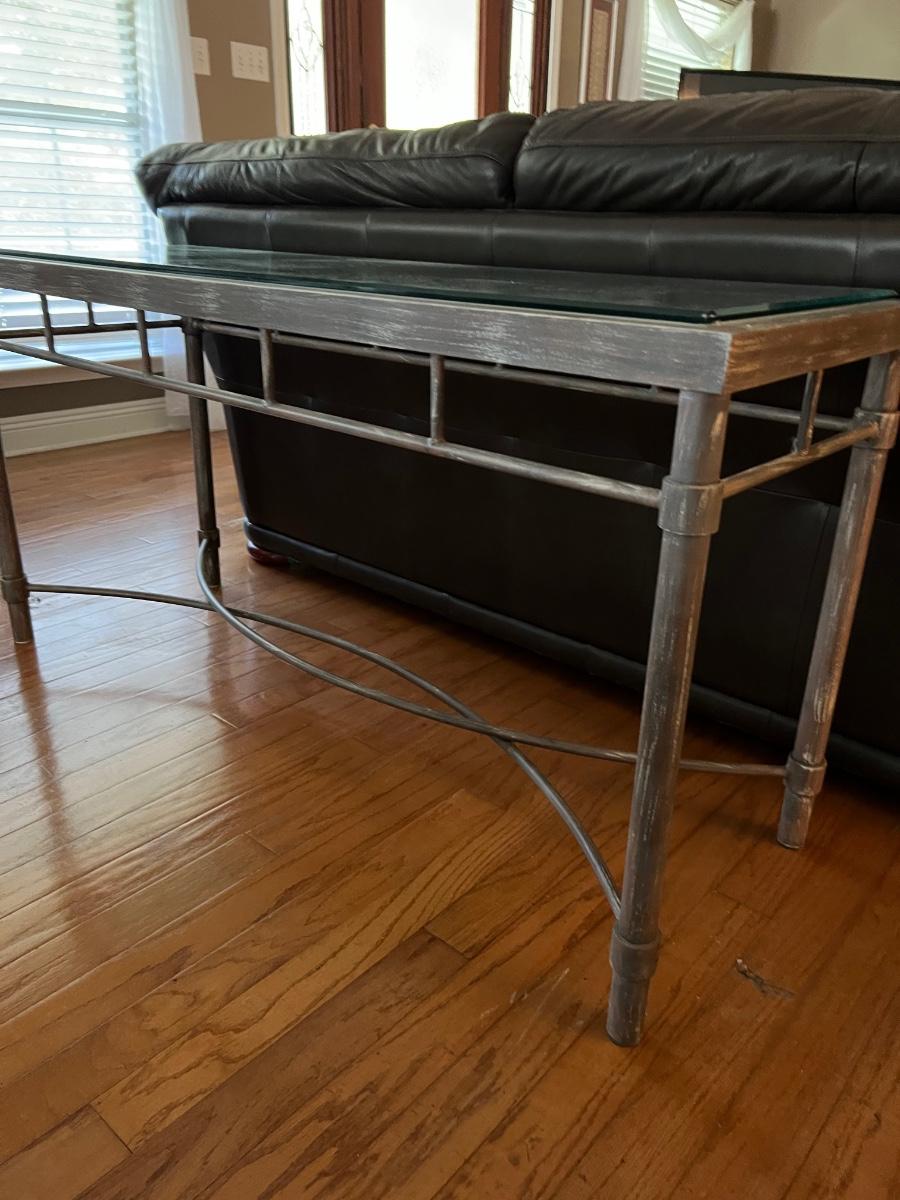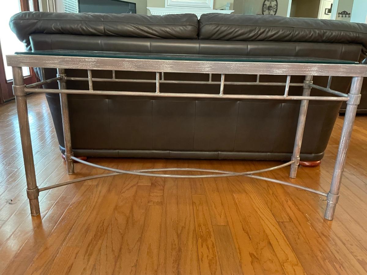 Glass Top and iron base sofa table. Measures 56 inches long, 19 inches deep and 28 inches tall. This piece matches the coffee tables and end tables.