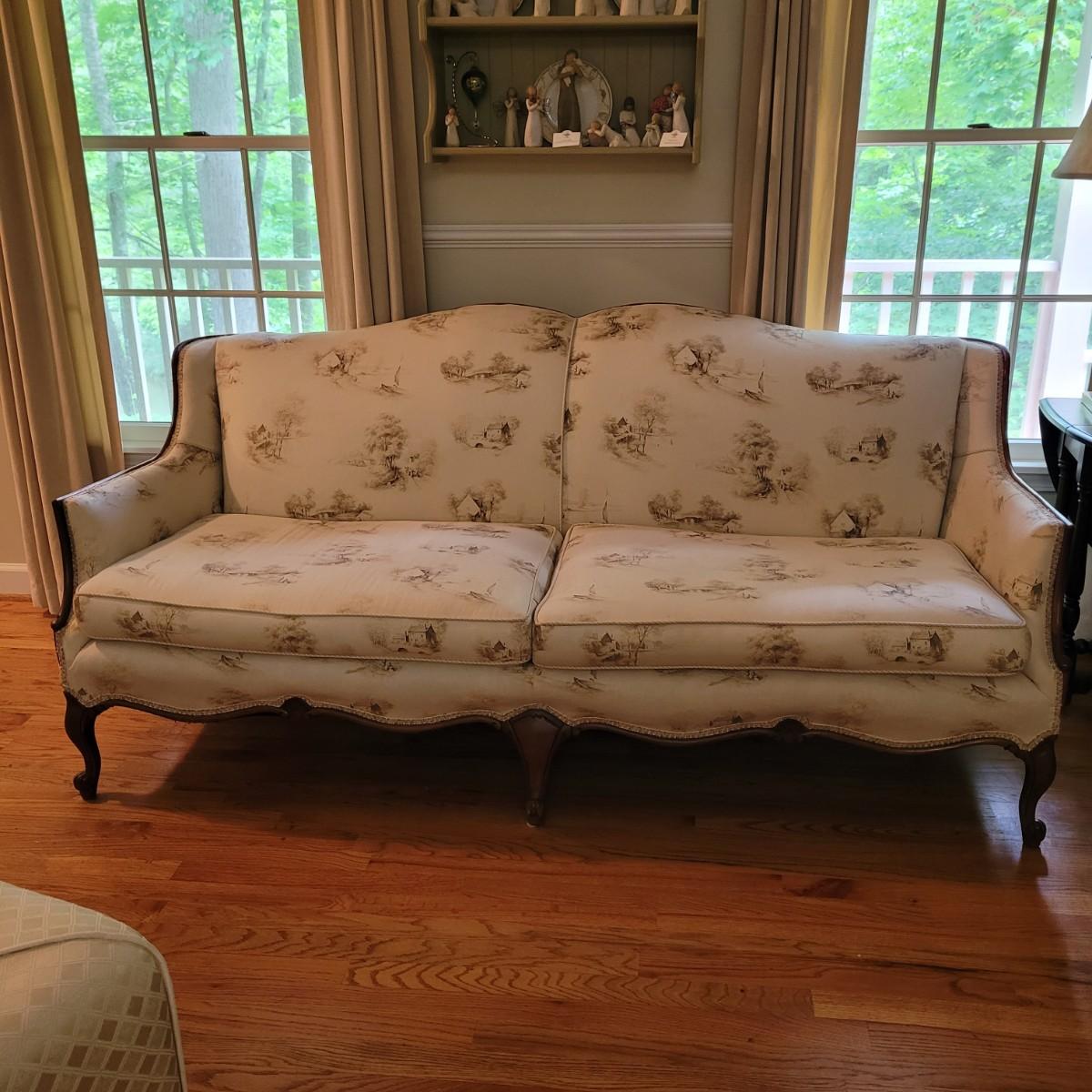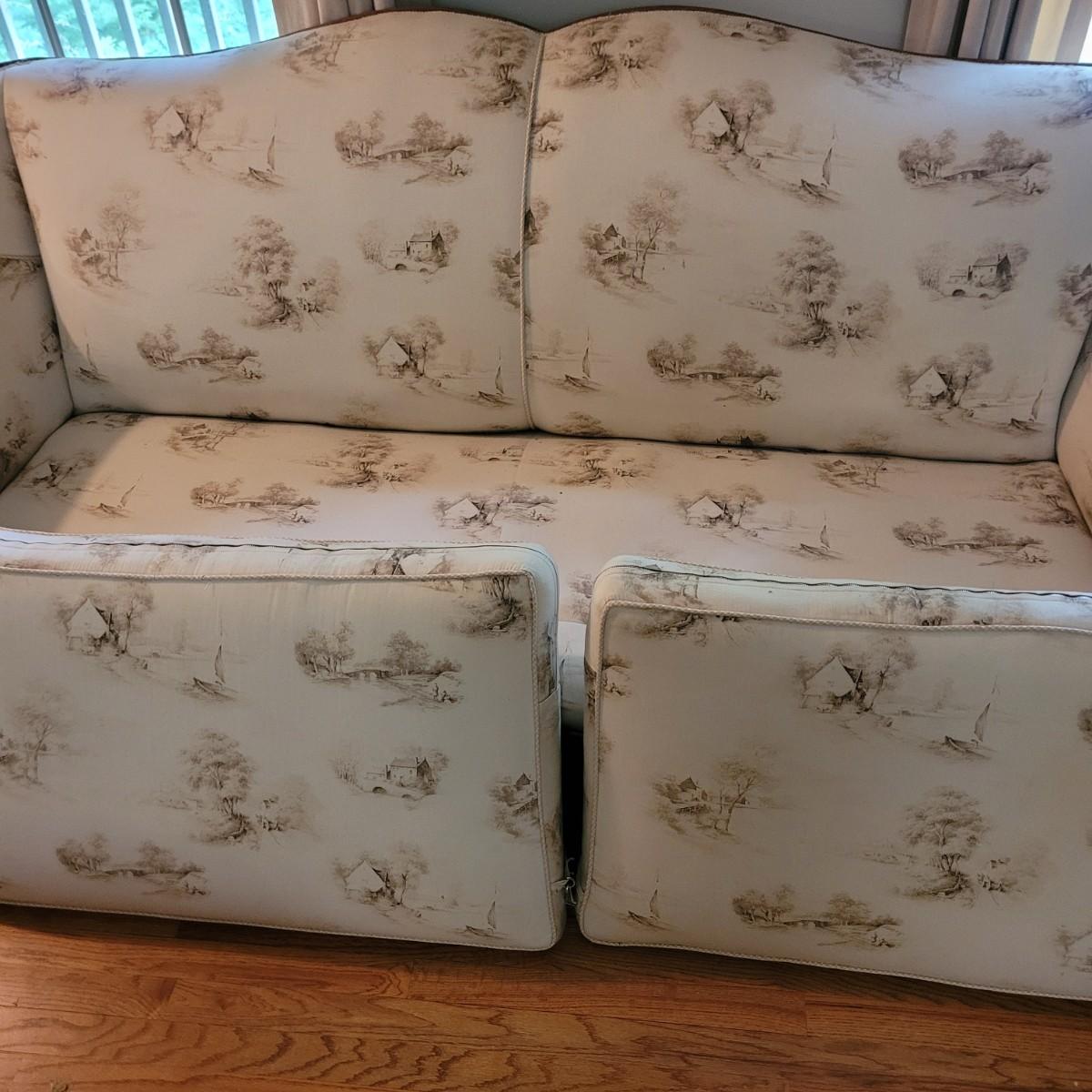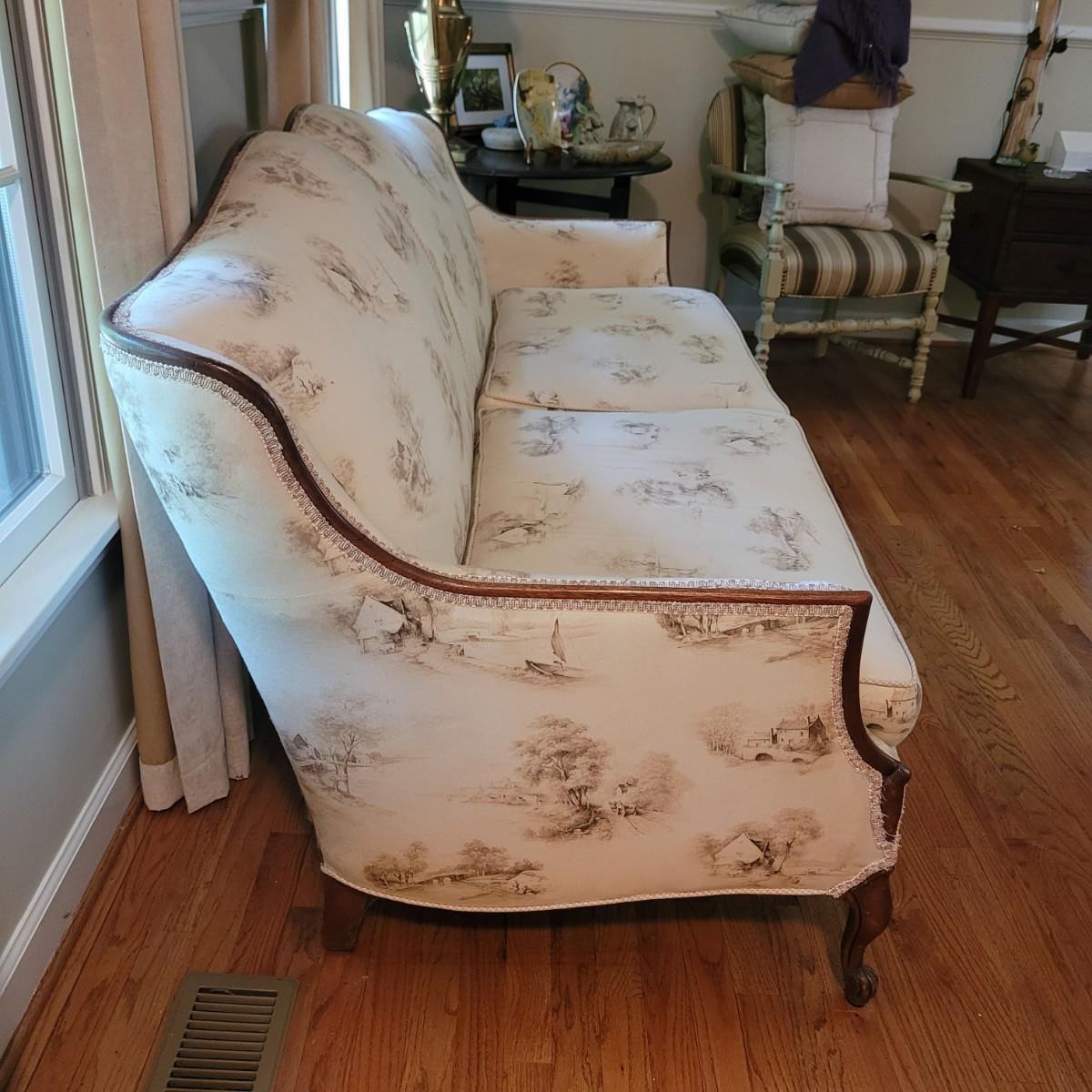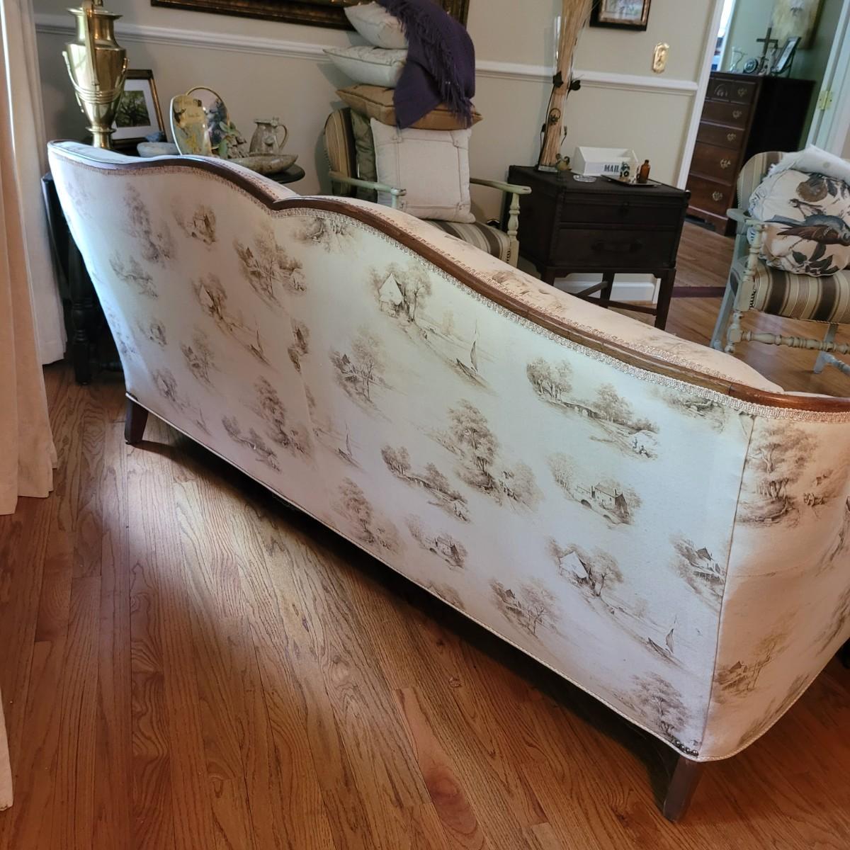 This sofa depicts an antique style French countryside print. Wood trim runs along the sides and top. Shows signs of use with discoloration, could benefit from a cleaning. Measures approximately 75.5" x 29" x 35"H. Seat depth 22.5", seat height 17.5"H. Local pickup only. Winning bidder must bring assistance to help move and load this item due to its weight and size.