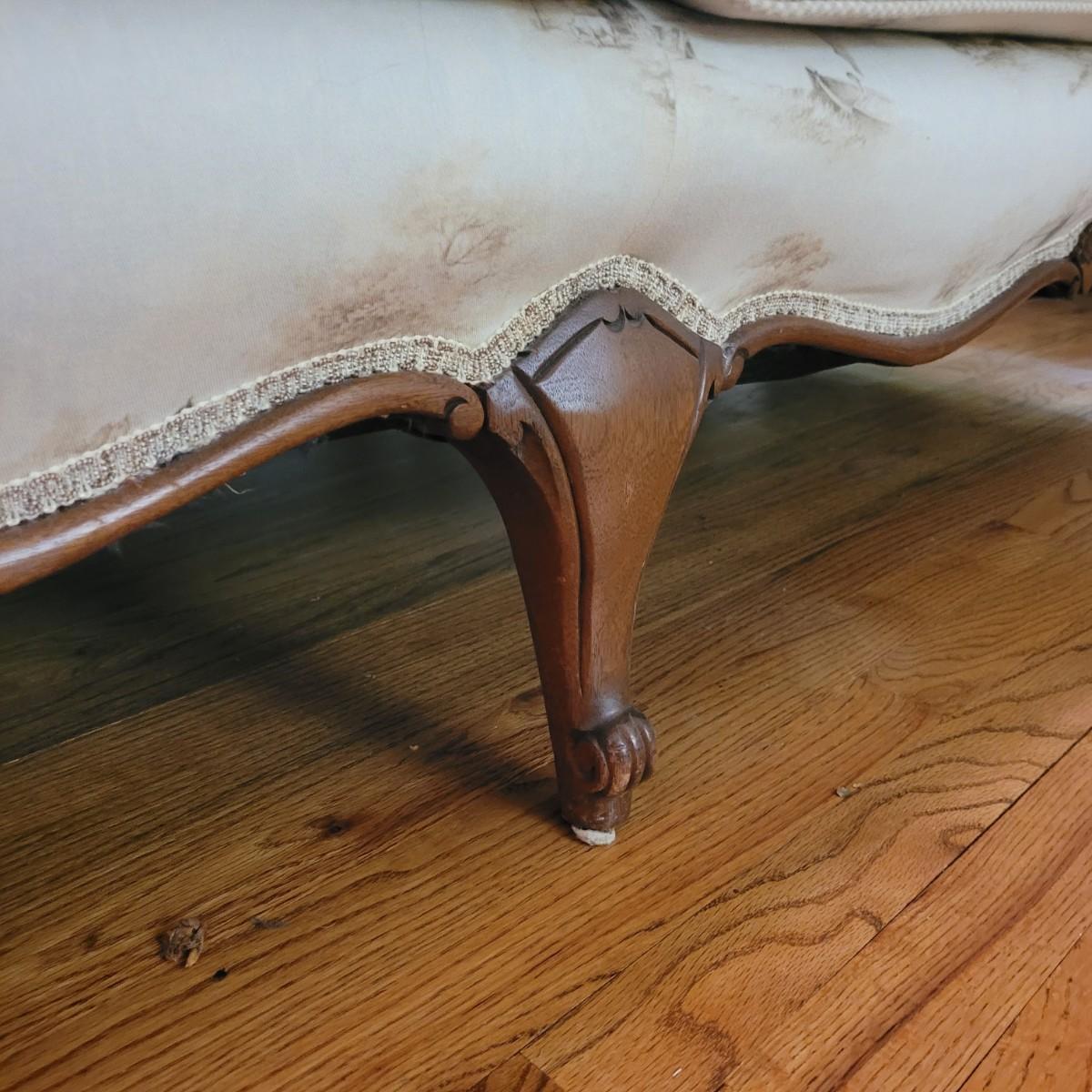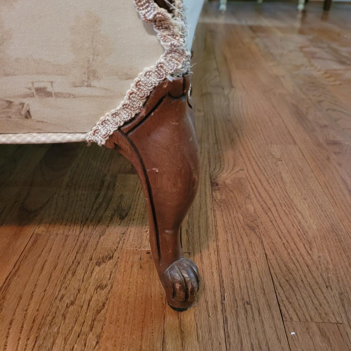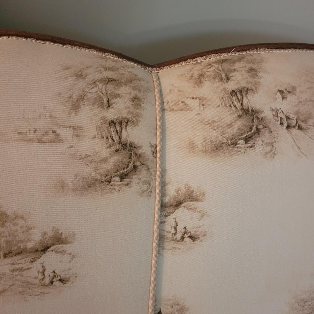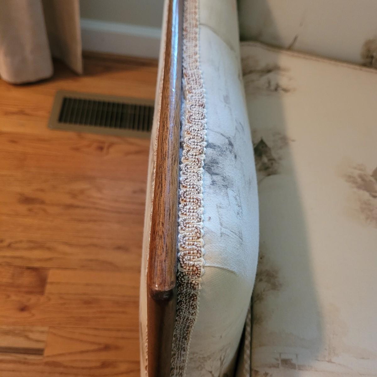 This sofa depicts an antique style French countryside print. Wood trim runs along the sides and top. Shows signs of use with discoloration, could benefit from a cleaning. Measures approximately 75.5" x 29" x 35"H. Seat depth 22.5", seat height 17.5"H. Local pickup only. Winning bidder must bring assistance to help move and load this item due to its weight and size.