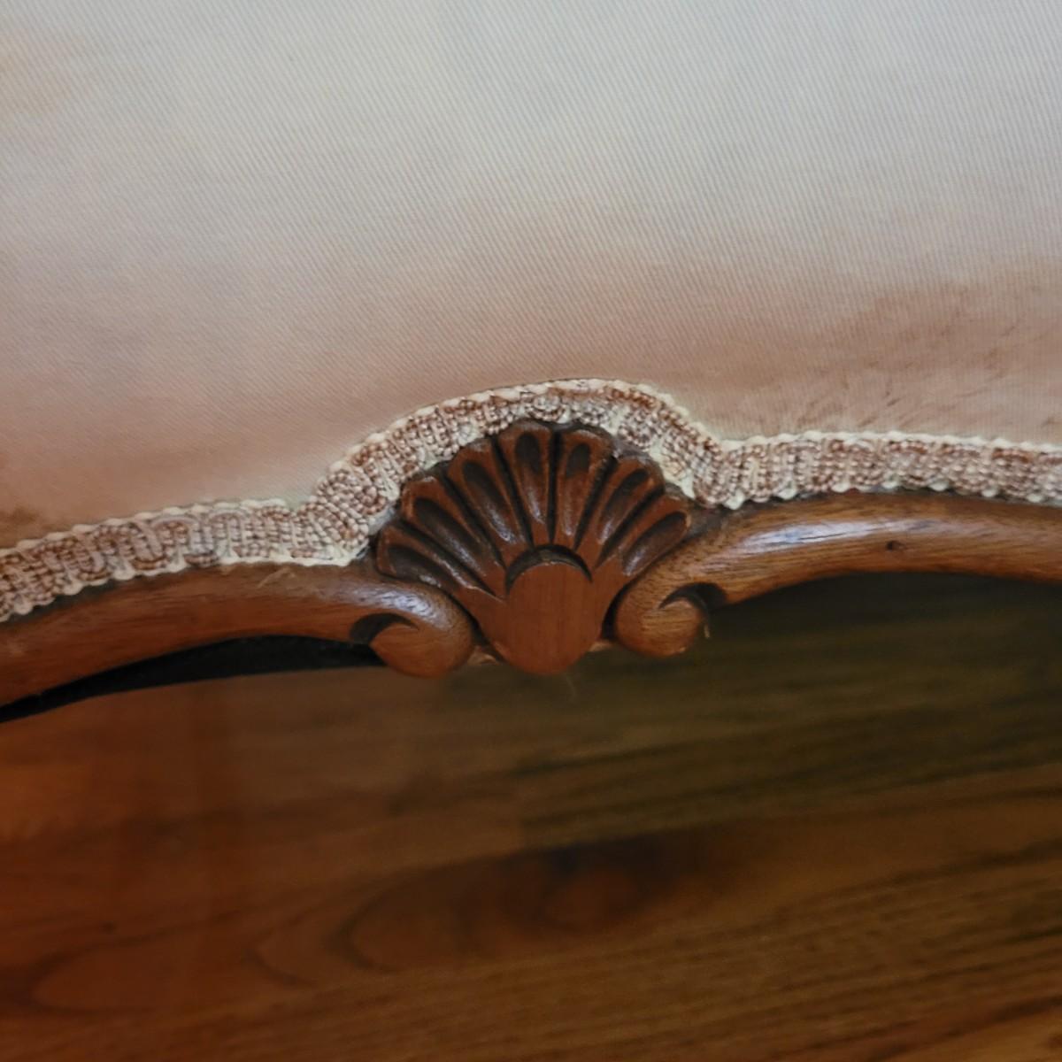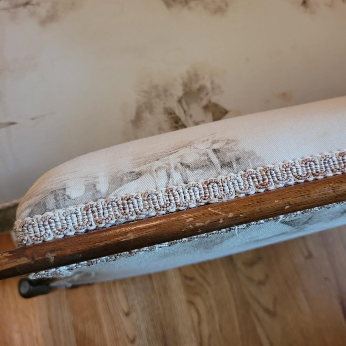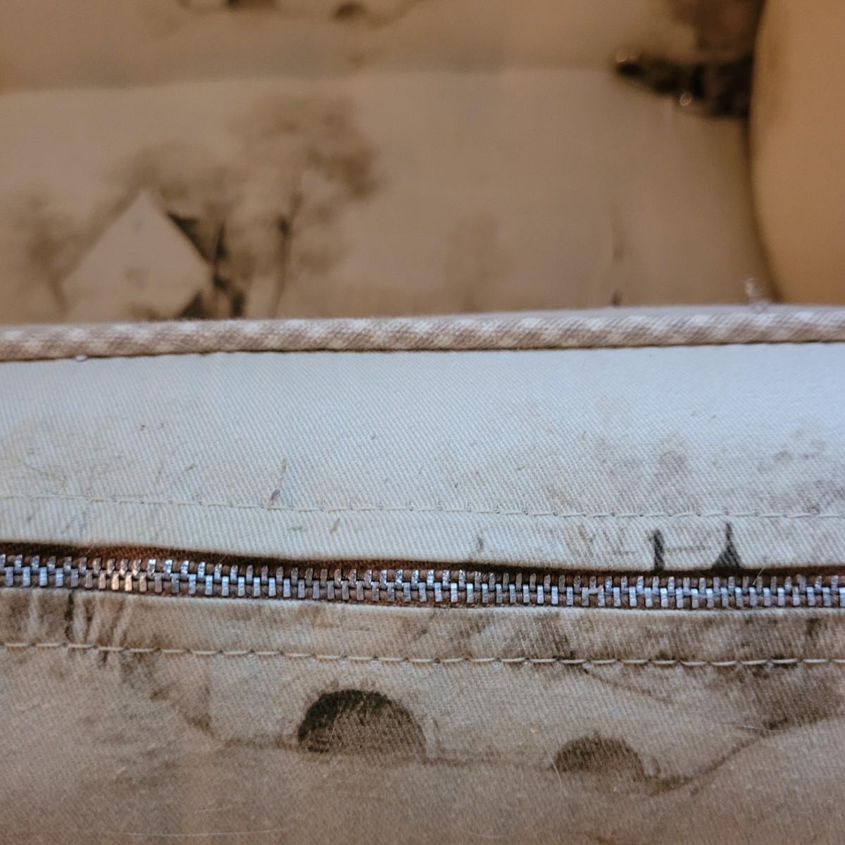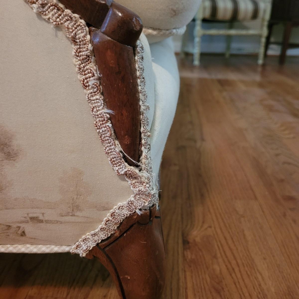 This sofa depicts an antique style French countryside print. Wood trim runs along the sides and top. Shows signs of use with discoloration, could benefit from a cleaning. Measures approximately 75.5" x 29" x 35"H. Seat depth 22.5", seat height 17.5"H. Local pickup only. Winning bidder must bring assistance to help move and load this item due to its weight and size.