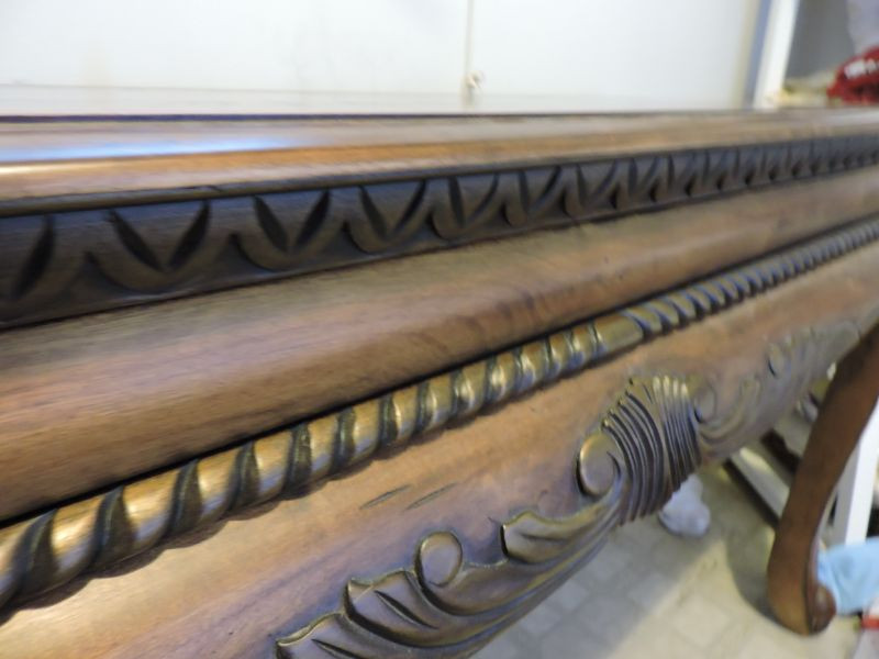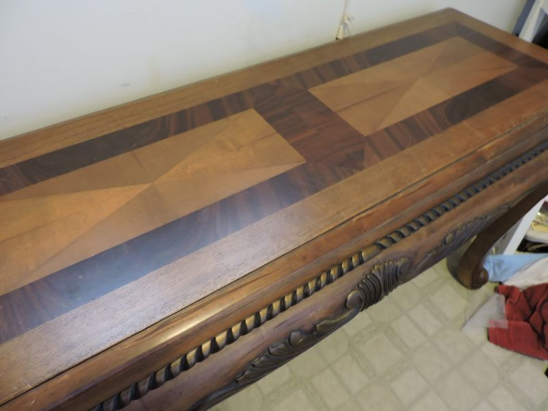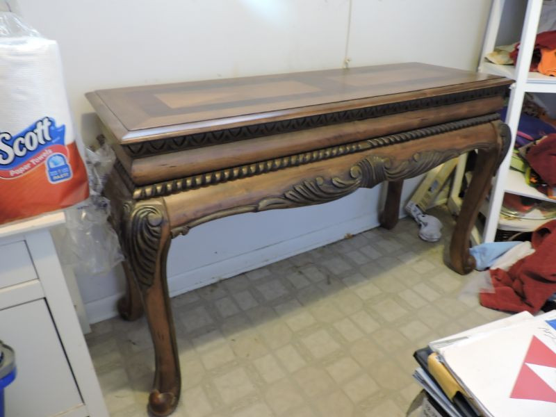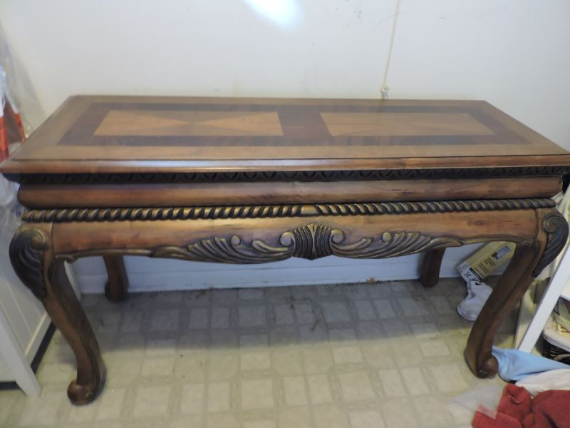 Ornately carved dark walnut sofa table with inlaid design on top. Great condition! 50”x19”x30.5”