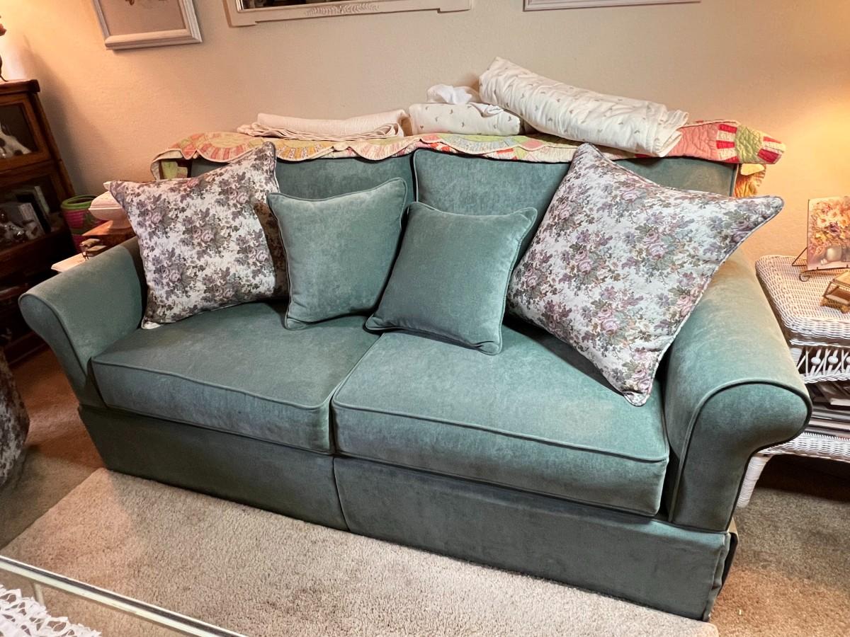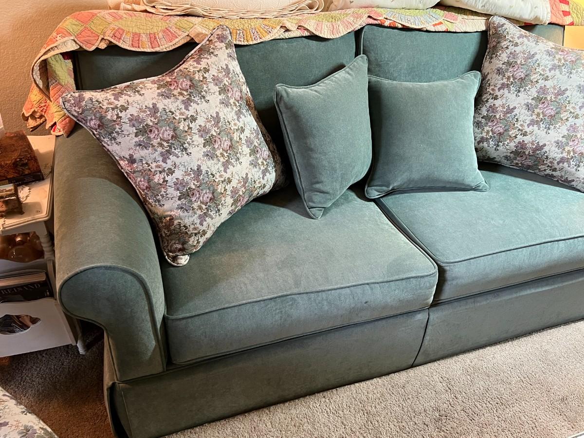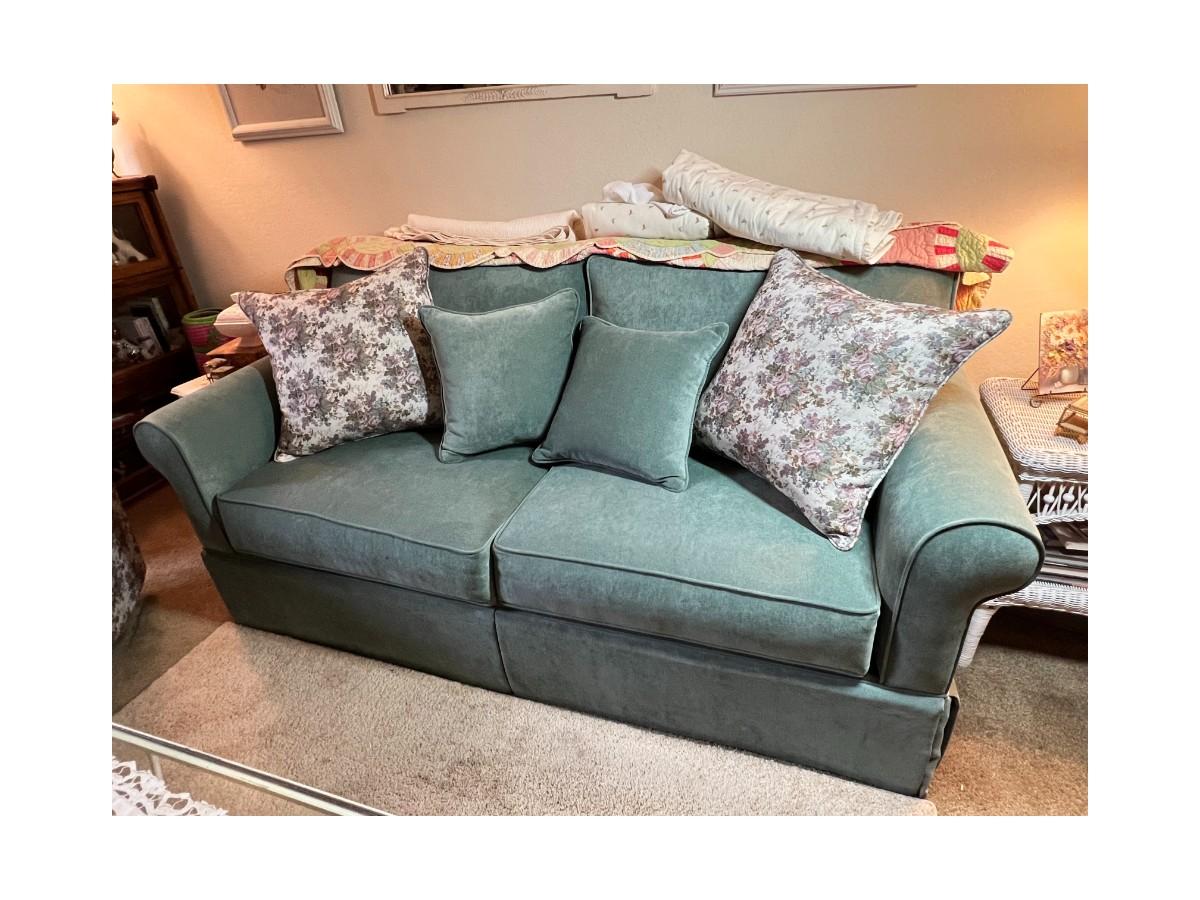 Mint Green Sofa Couch Love Set with Throw Pillows. In good condition, no major spots, stains, or wear. About 70" length. **Off site in Brea, owner downsizing. Pick up will be after July 14th, we will schedule with winning bidders after that date.**