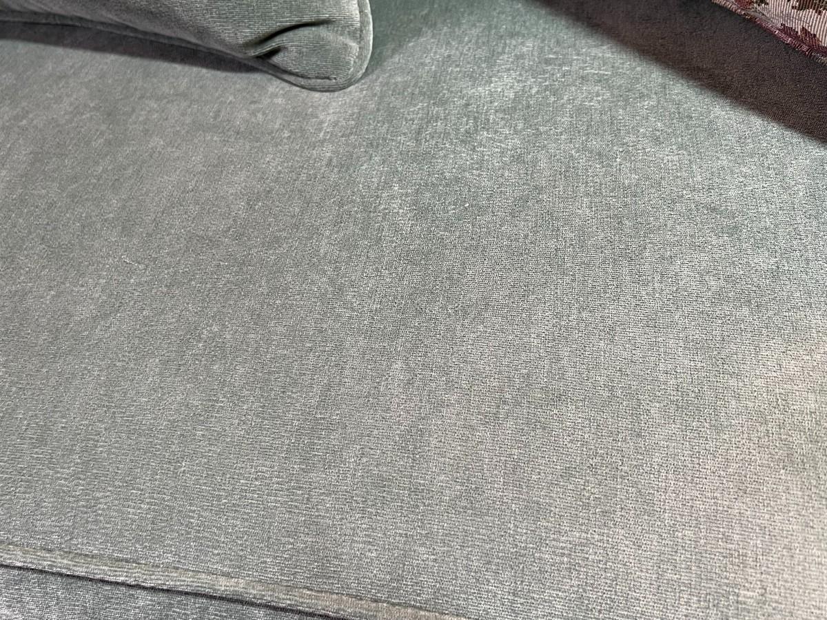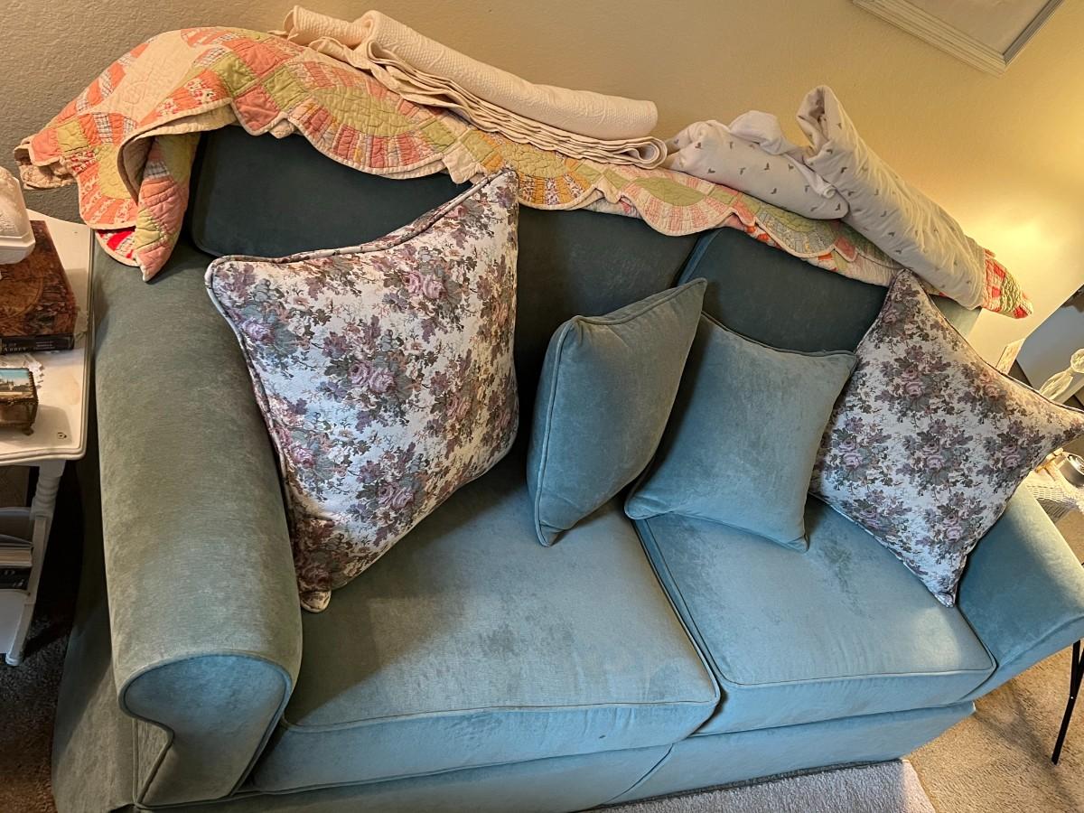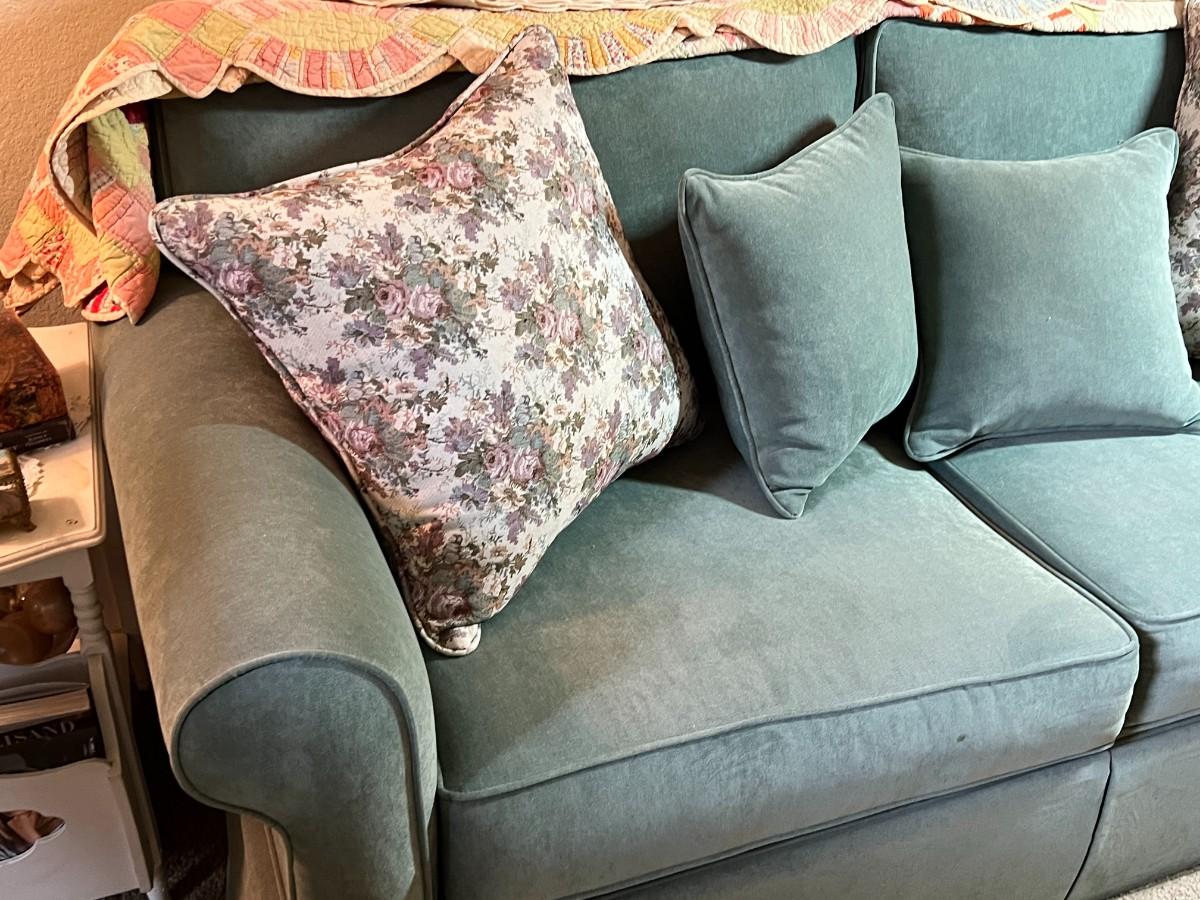 Mint Green Sofa Couch Love Set with Throw Pillows. In good condition, no major spots, stains, or wear. About 70" length. **Off site in Brea, owner downsizing. Pick up will be after July 14th, we will schedule with winning bidders after that date.**