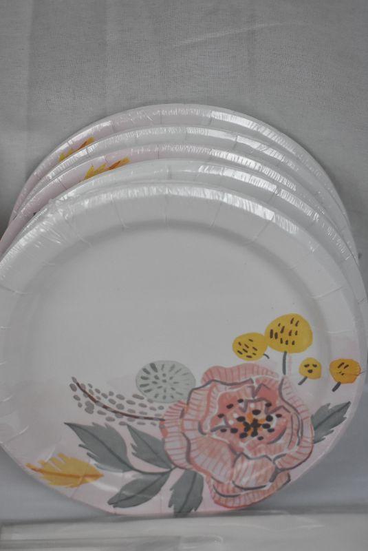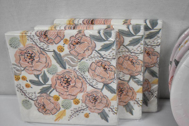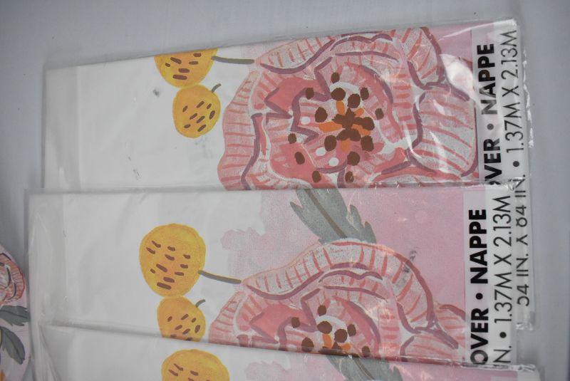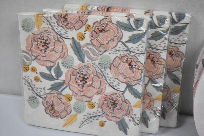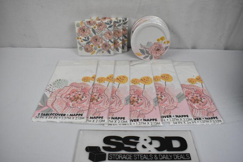 Soft Pink Painted Floral Party Decor: 5 packages 7" Plate - 8 Pieces each, 3 packages Paper Luncheon Napkins, 6.5in, 16ct each, Qty 6 Plastic Tablecloth, 84 x 54 in - New