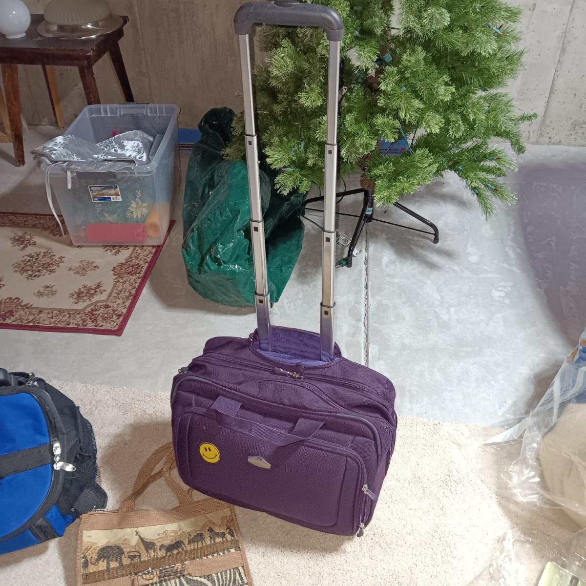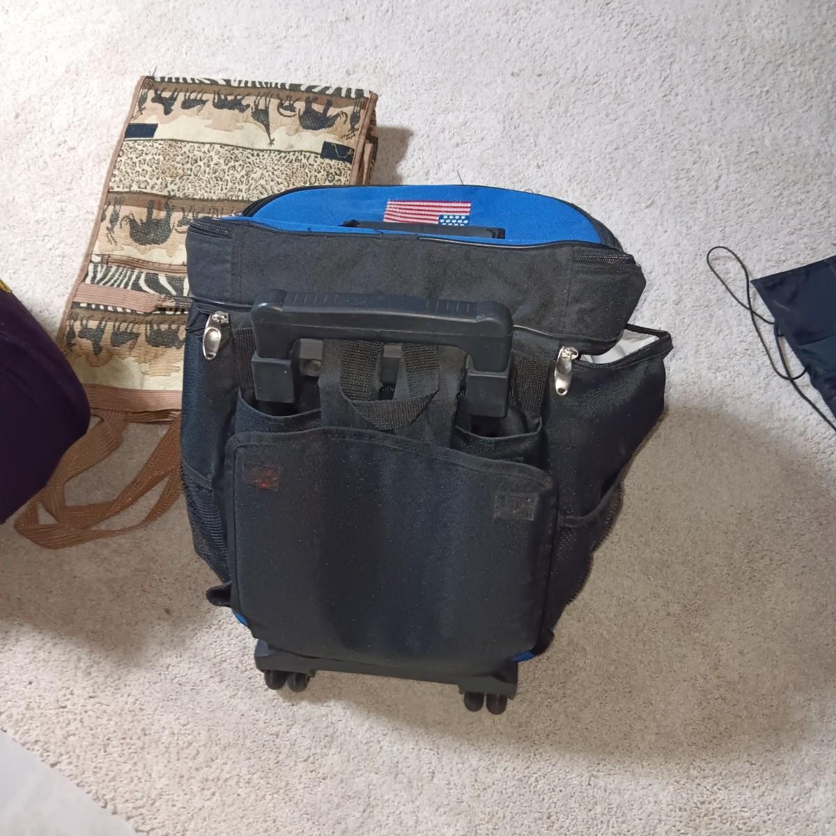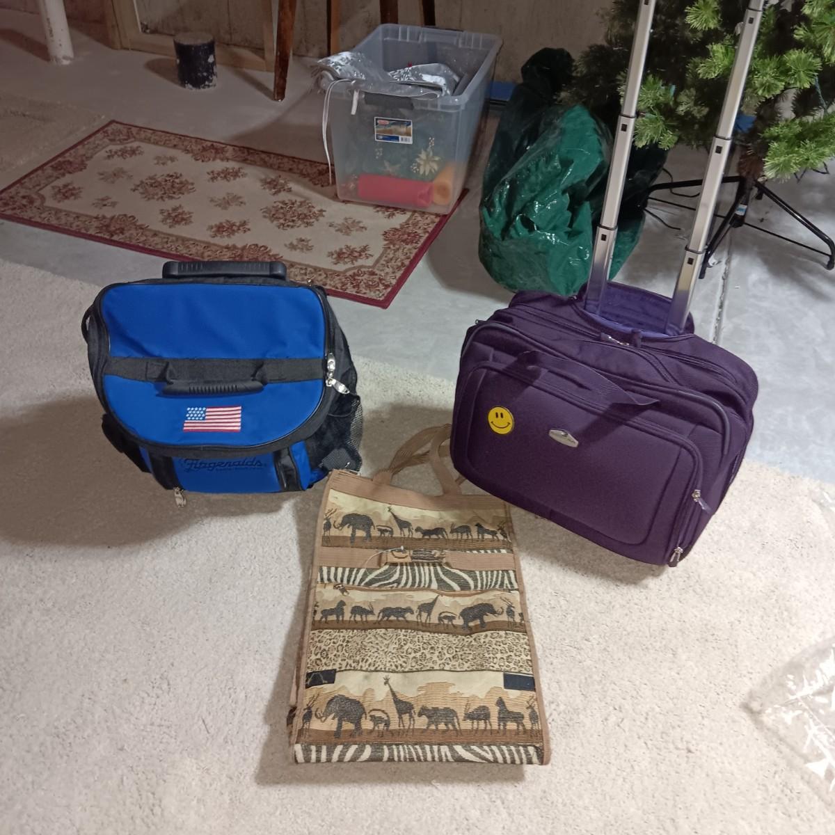 SOFT SIDED COOLER ON 2 WHEELS W/HANDLE, CARRY ON BAG ON WHEELS AND TALL BAG ON WHEELS
