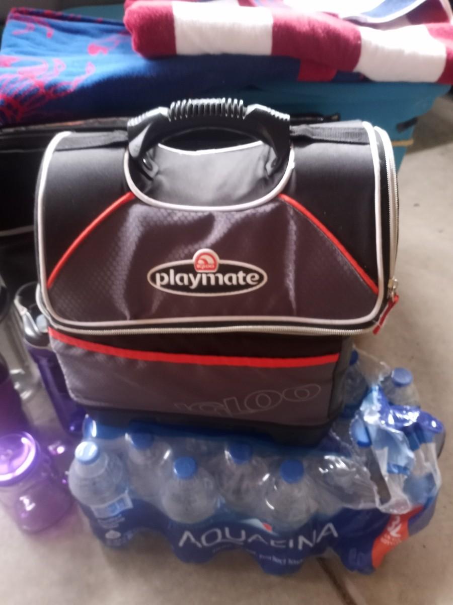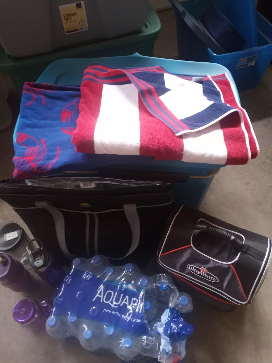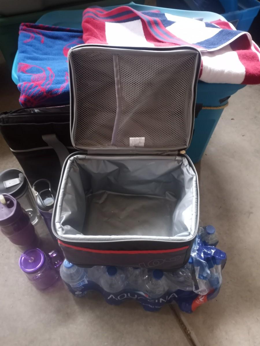 SOFT SIDED COOLERS-WATER BOTTLES-LARGE BEACH TOWELS AND BOTTLED WATER