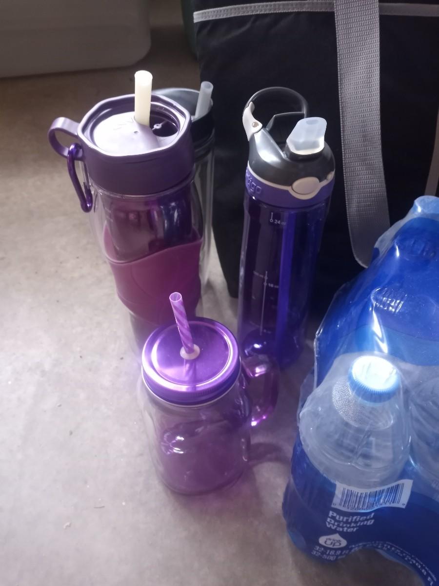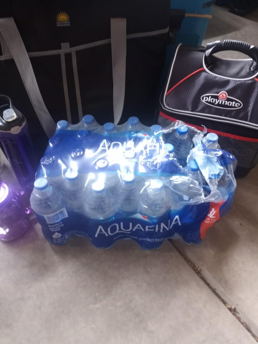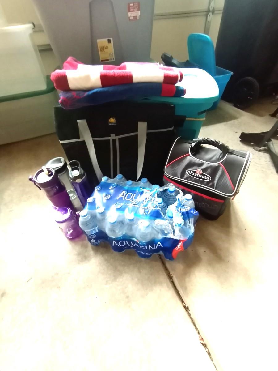 SOFT SIDED COOLERS-WATER BOTTLES-LARGE BEACH TOWELS AND BOTTLED WATER
