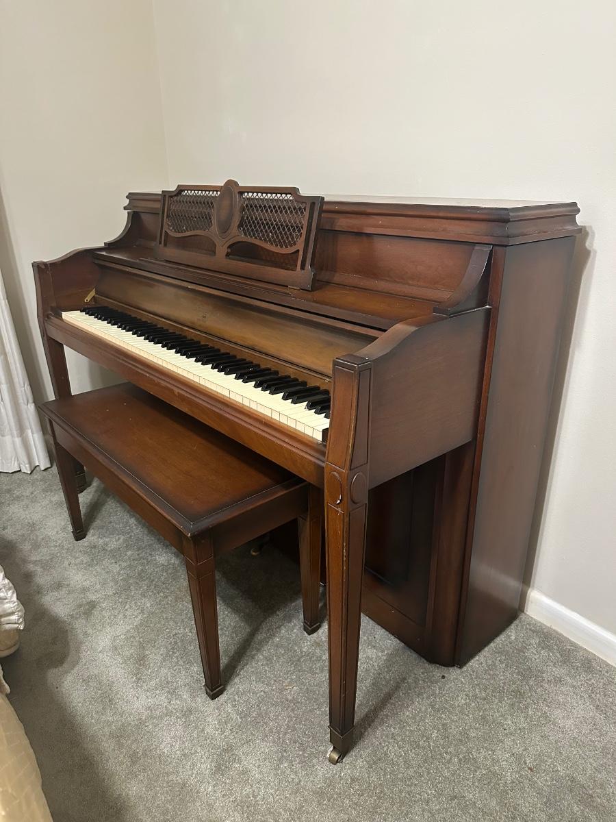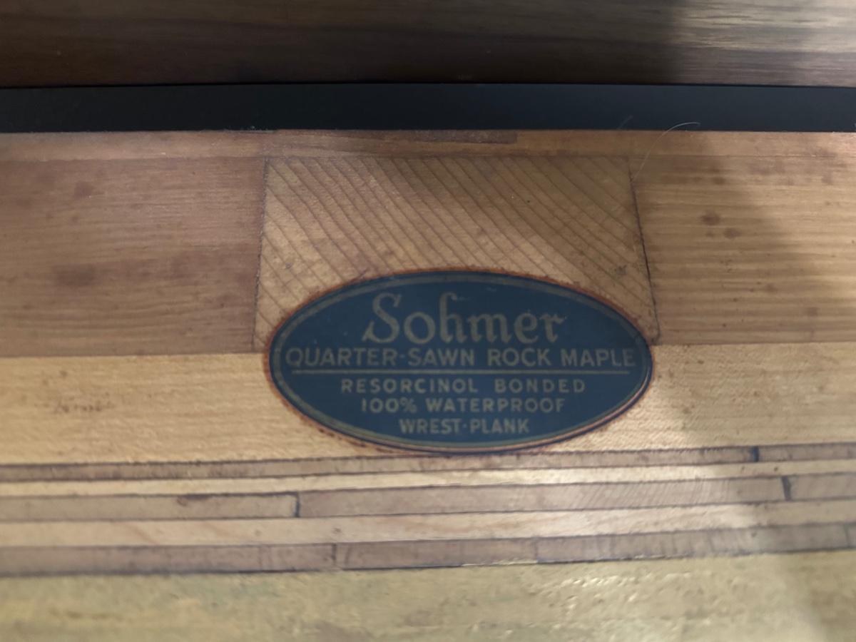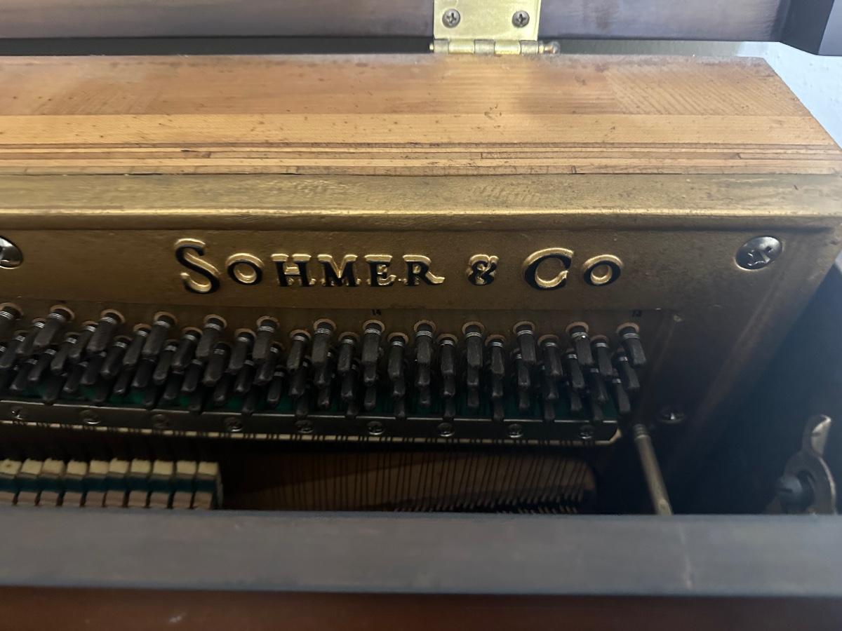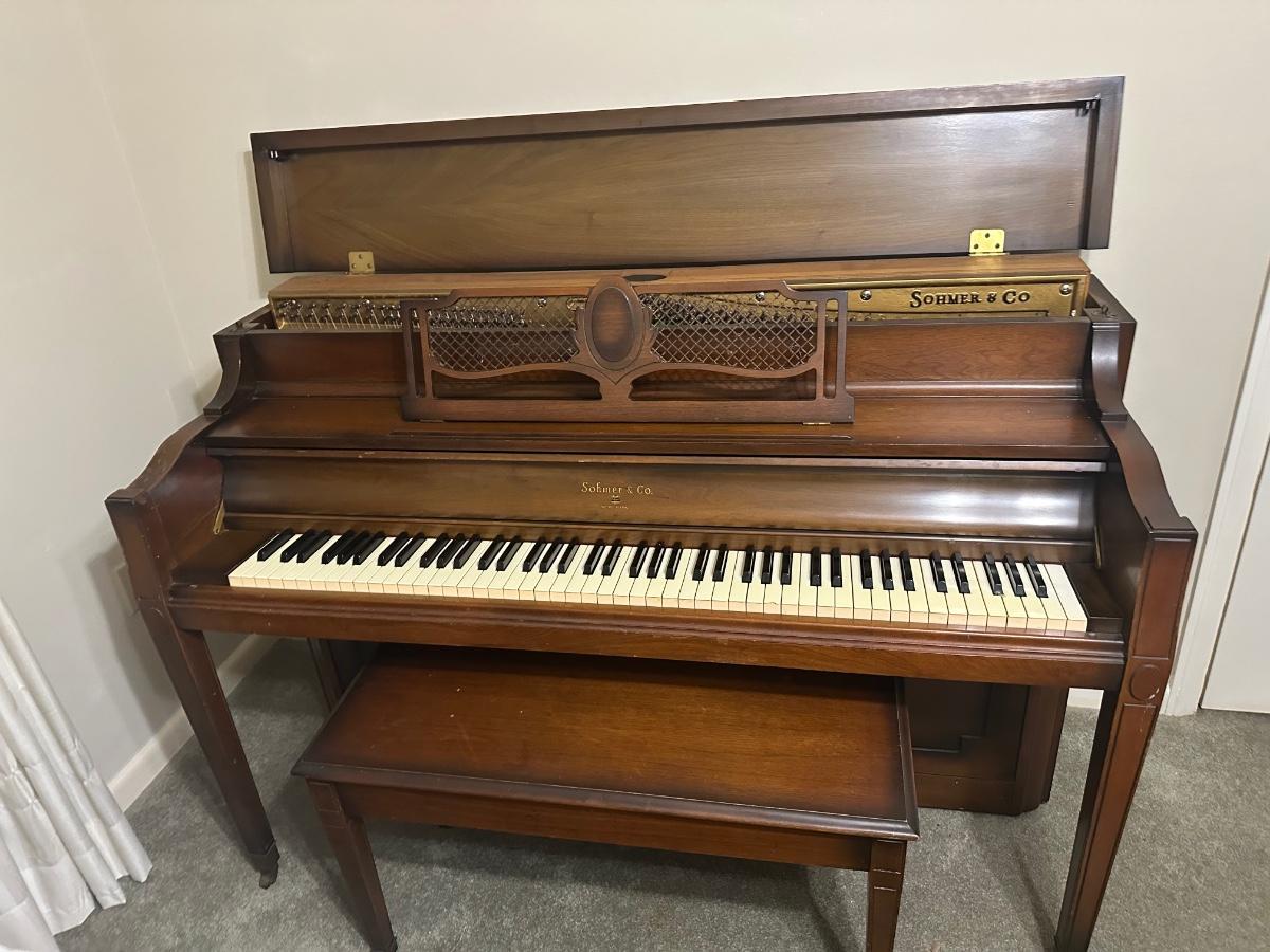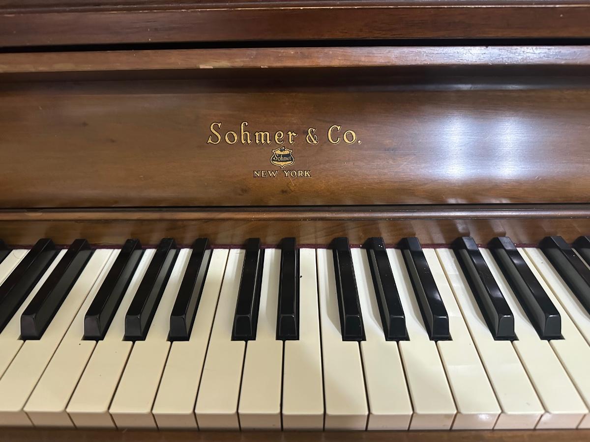 Well-made Sohmer & Co. console piano in a traditional walnut finish. Includes matching bench.