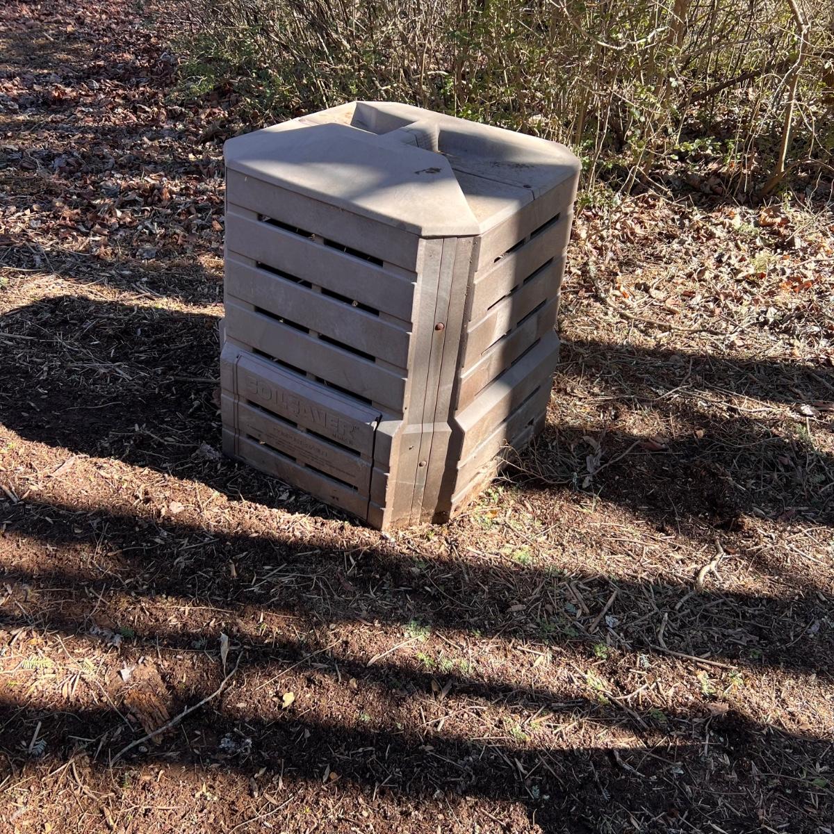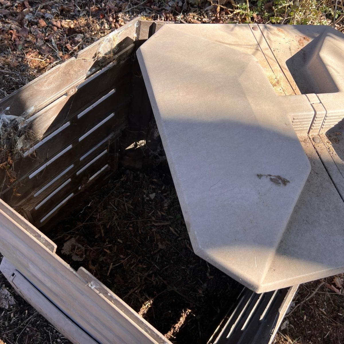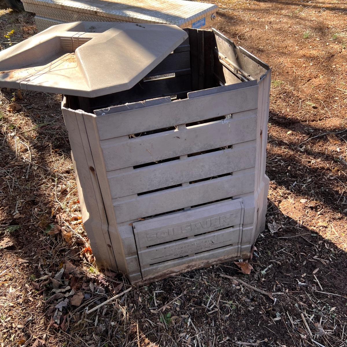 Sturdy plastic compost bin. It has two pull up sections to release your gardeners gold once it is ready and a lid to add more leaves, food scraps, etc. Has a small crack on one side, see pic.